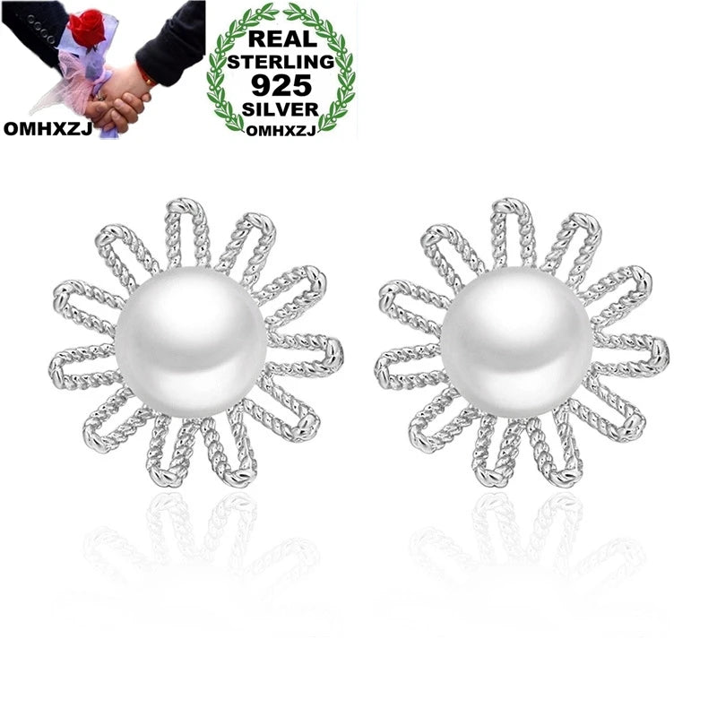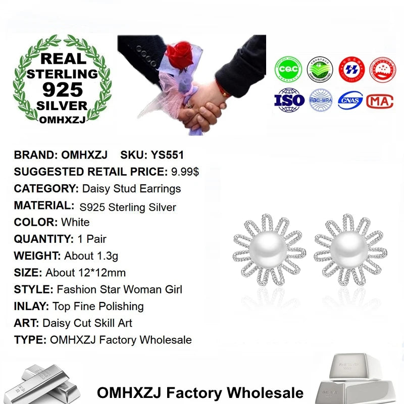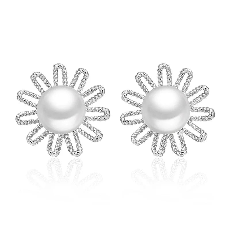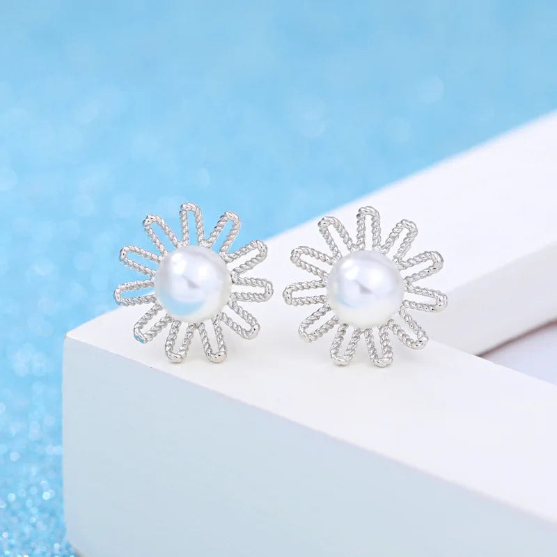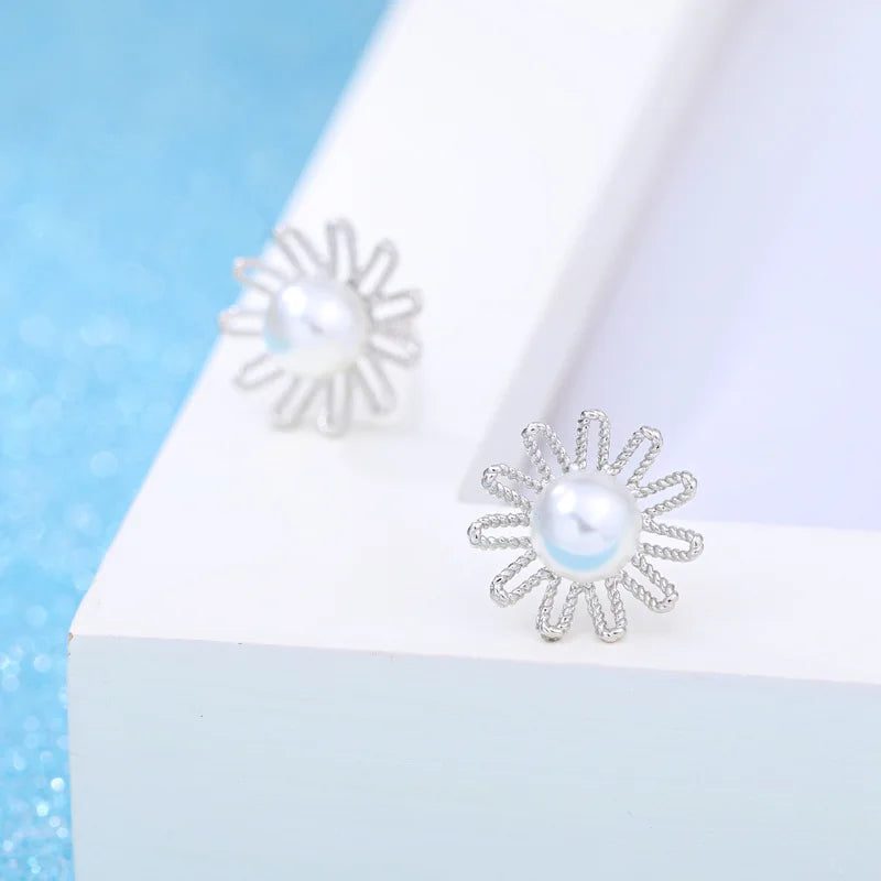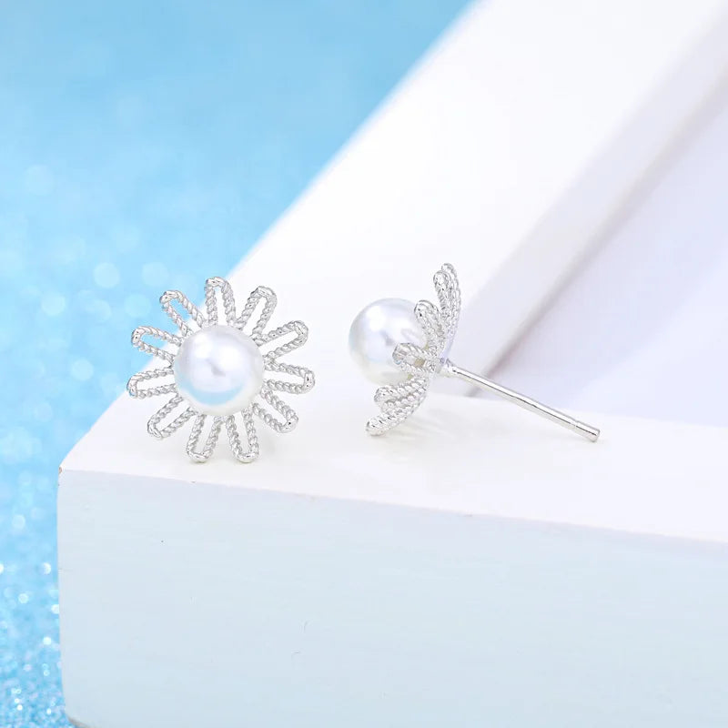 European Woman Daisy Flower Pearl Silver Stud Earrings