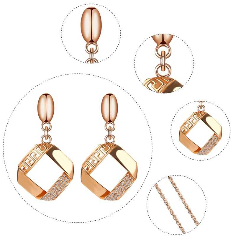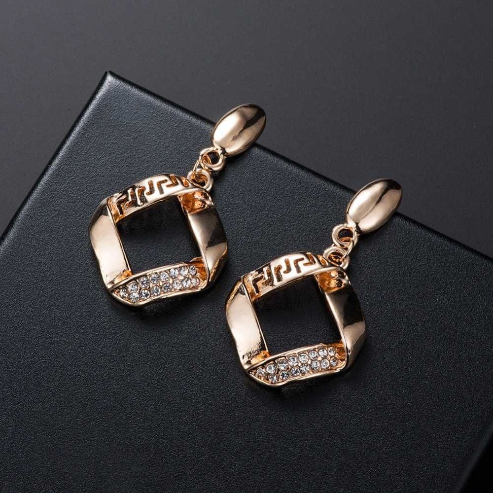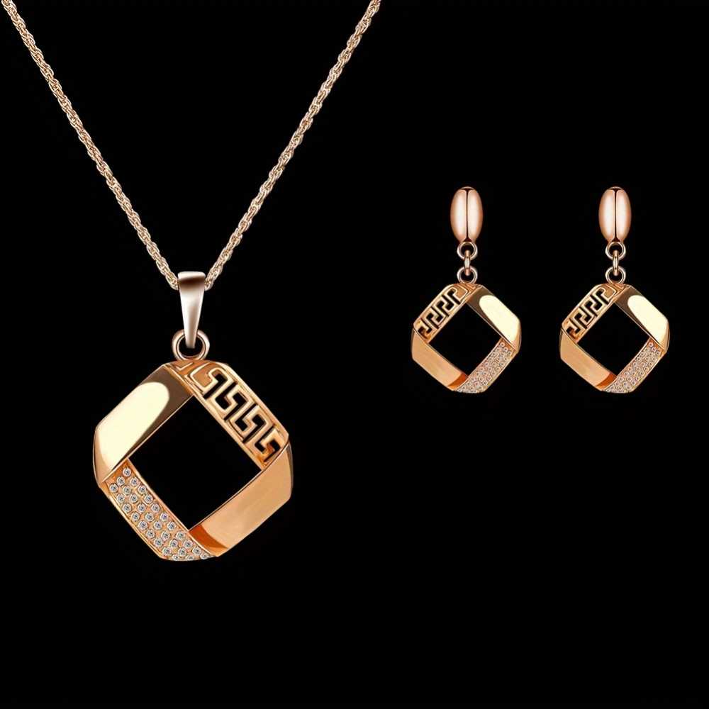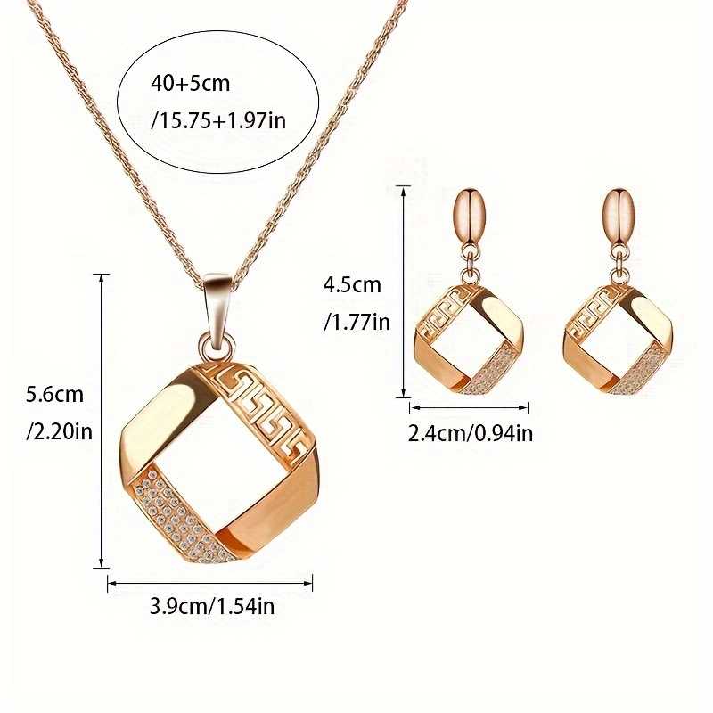 This elegant jewelry set features a stunning square pendant necklace and matching earrings, designed to add a touch of luxury and sophistication to any outfit. Crafted with precision, each piece is adorned with sparkling zirconia stones, offering a brilliant, eye catching shine that enhances its fashionable appeal. The square pendant is the centerpiece of the set, featuring a sleek, geometric design that exudes modern elegance. The zirconia stones are carefully set to maximize their brilliance, creating a radiant effect that catches the light from every angle. The pendant hangs gracefully from a delicate chain, which complements the bold shape of the square design while adding a refined touch.