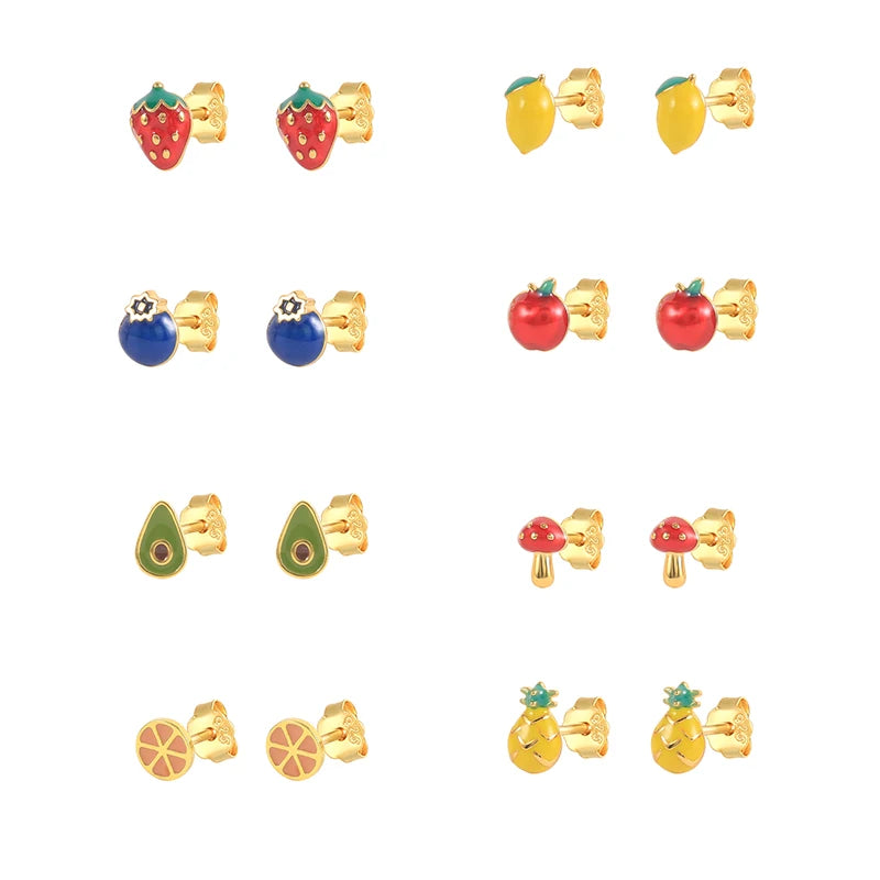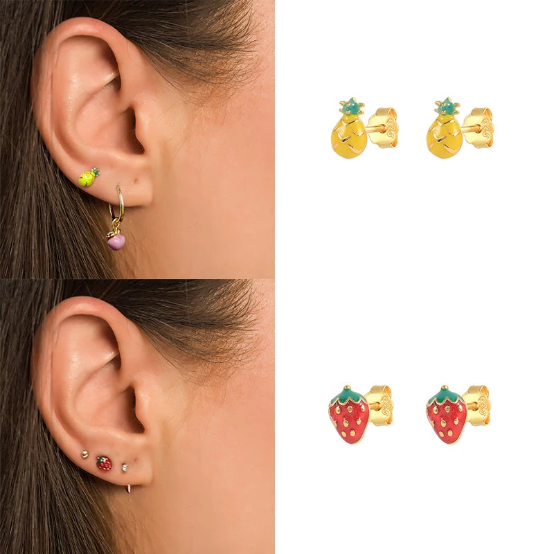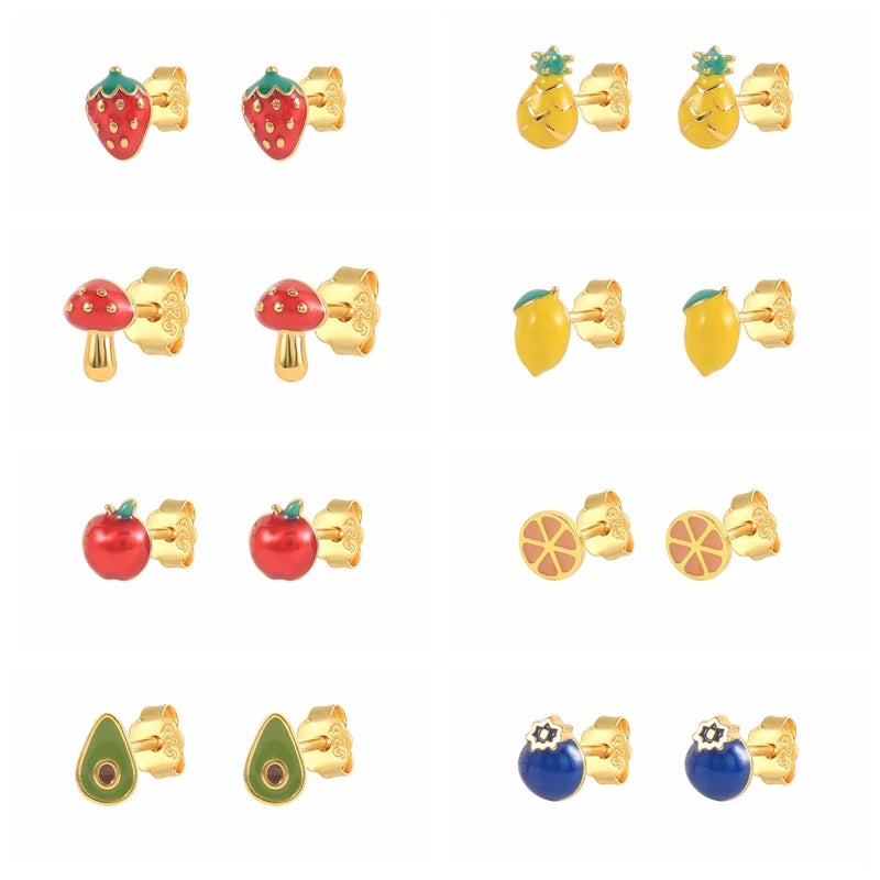 Add a fruity touch to your look with these colorful enamel stud earrings featuring an avocado, orange, mango, and strawberry design. Made from 925 sterling silver, these piercing earrings are perfect for everyday wear.