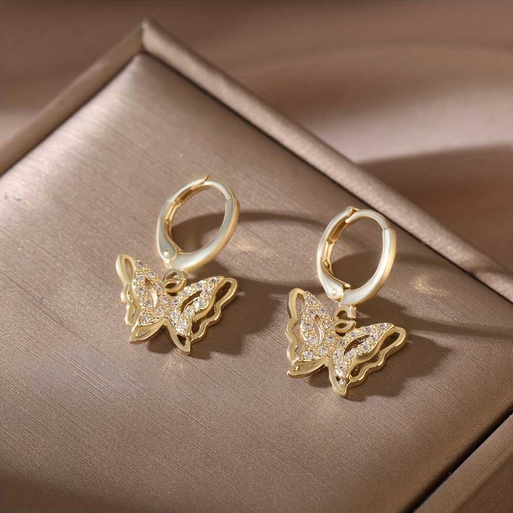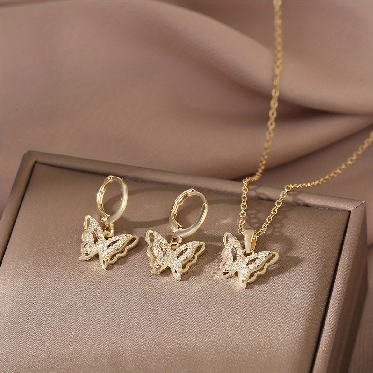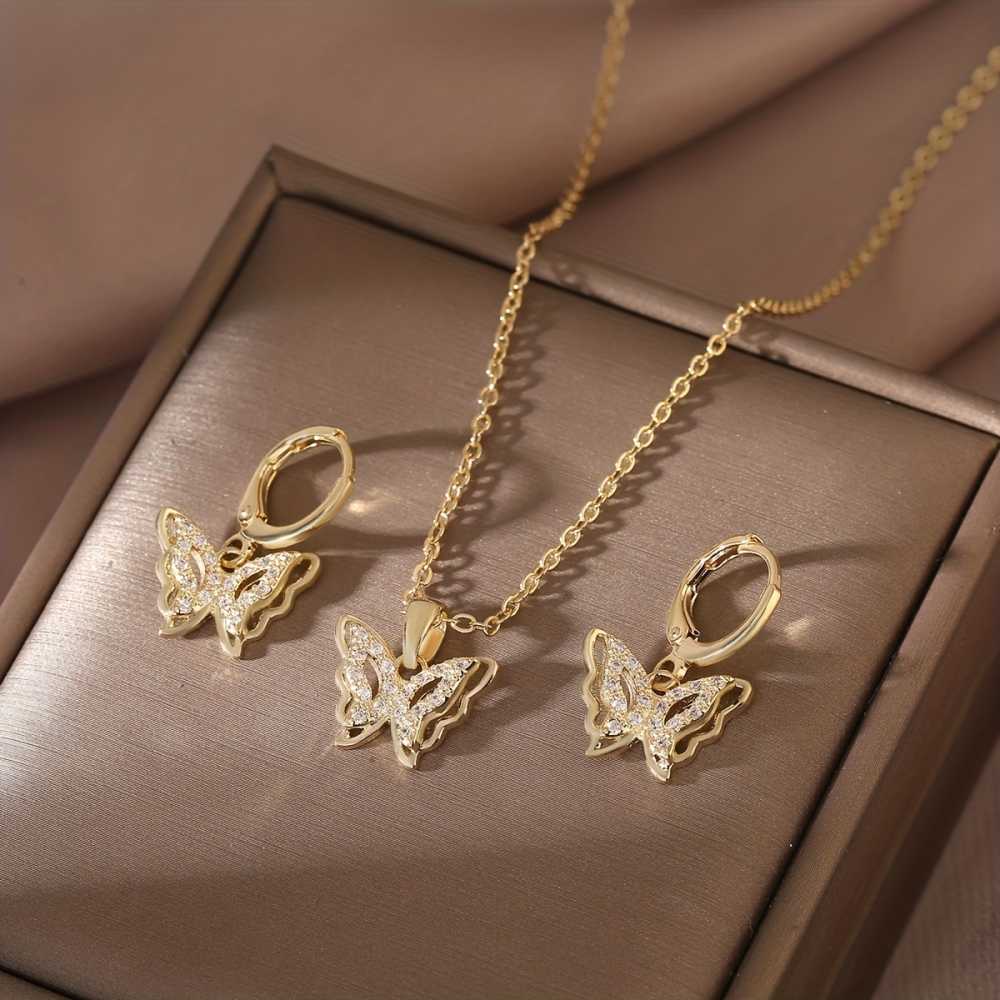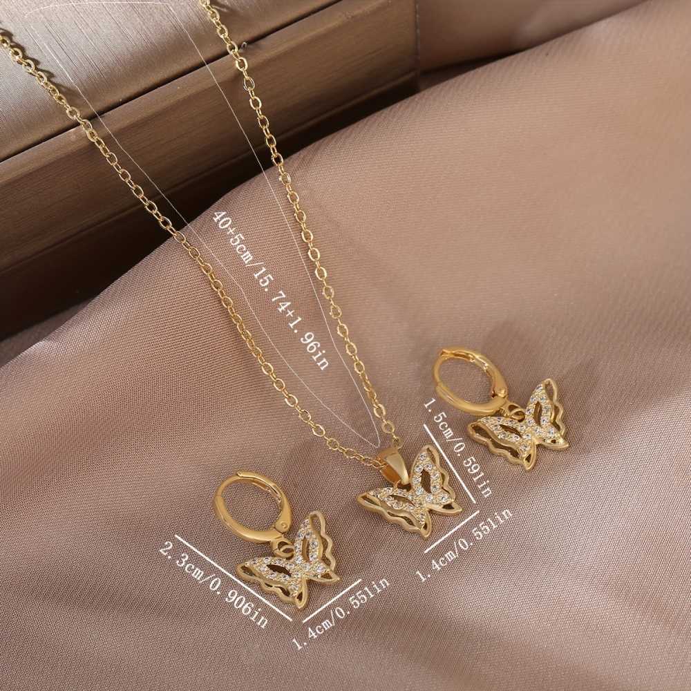 Bling Queen is an affordable fashion jewellery brand with various product types like bracelets, necklaces, earrings, rings, etc. suitable for women, men and kids. Add a touch to your jewelry collection with this 14k gold plated butterfly earrings and necklace set, beautifully inlaid with sparkling zirconia. The delicate butterfly design exudes charm, while the zirconia accents add a subtle, yet radiant shine. Perfect for elevating both casual outfits and party attire, this dainty set offers versatile elegance. Crafted from high quality materials, it promises lasting beauty and durability. Whether for daily wear or special occasions, this set is a perfect way to express your style with a bit of fun and sophistication. The lightweight design ensures comfort for all day wear, while the gold plating adds a touch of luxury to any look.