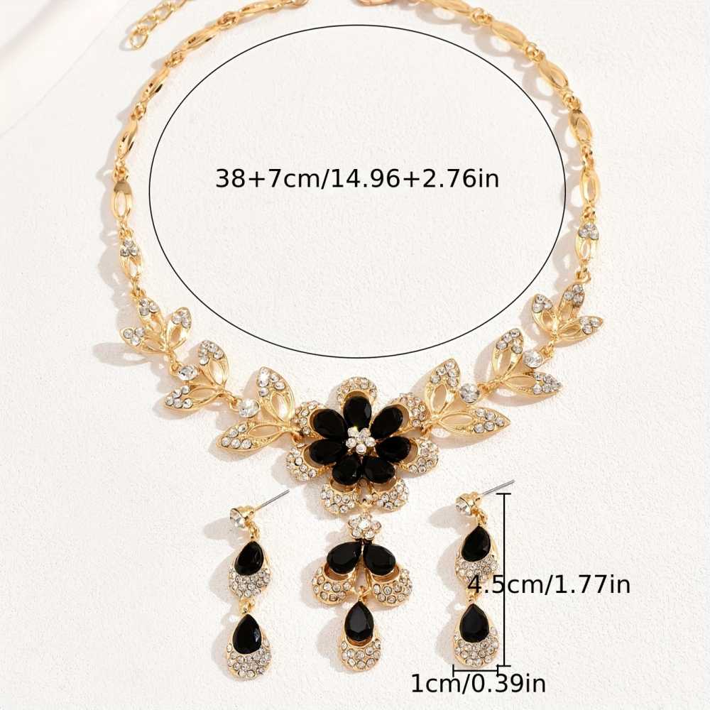 Gold Plated Jewelry Set for Women Black Flower & Zirconia Necklace with Dangle Earrings