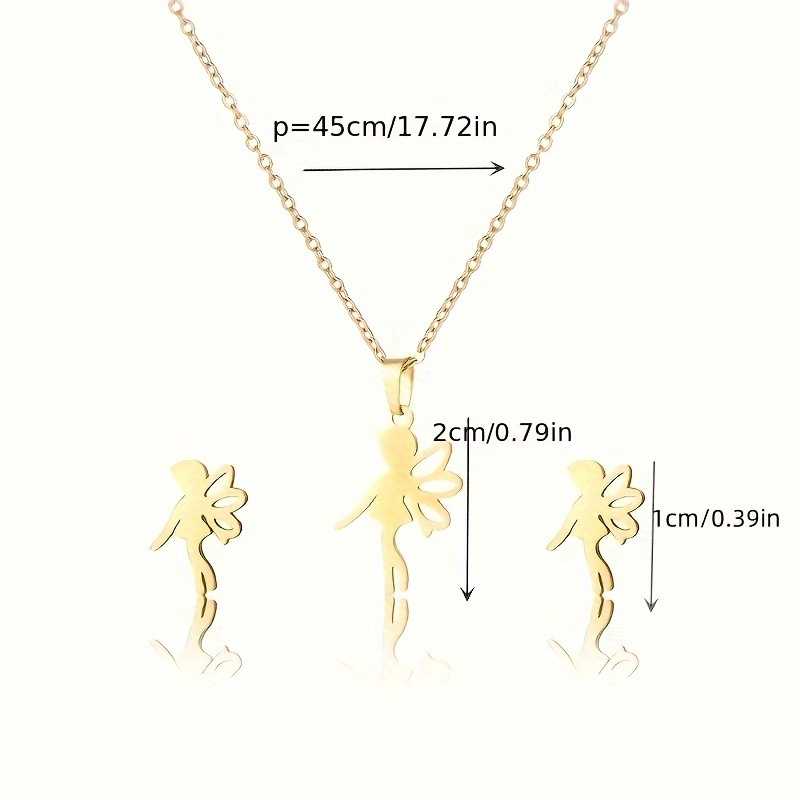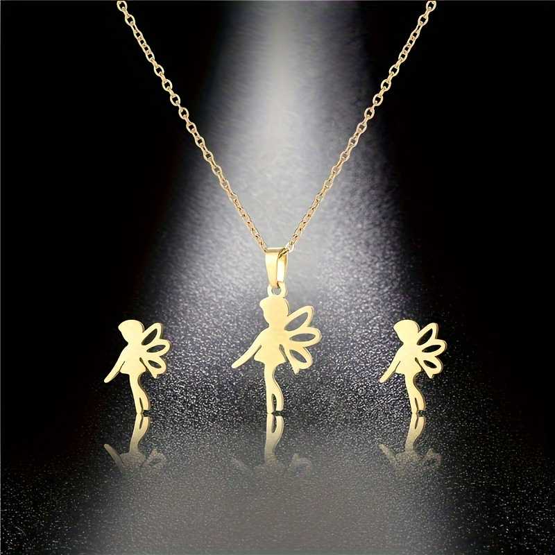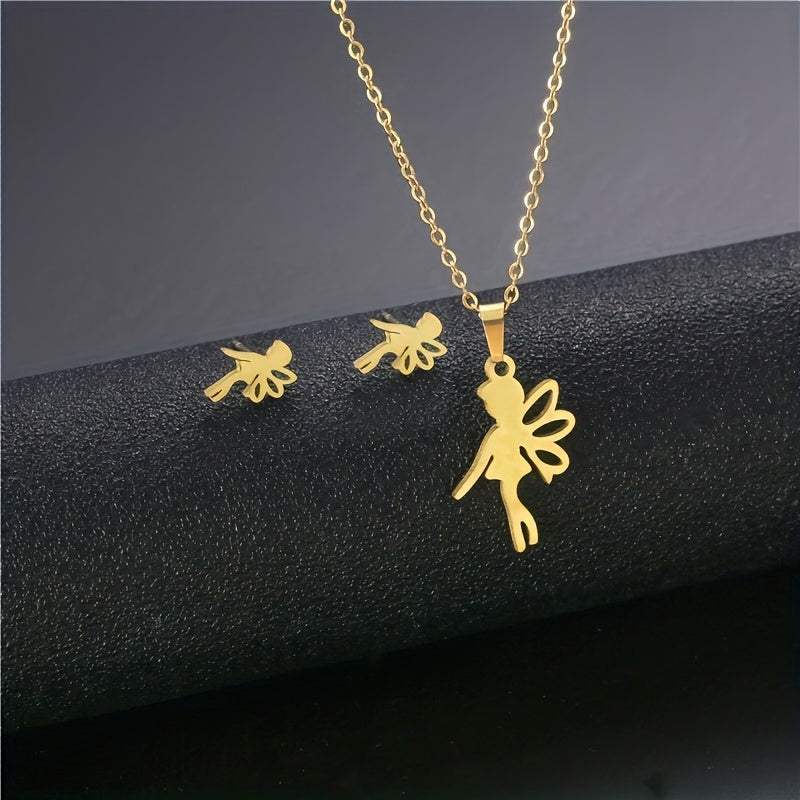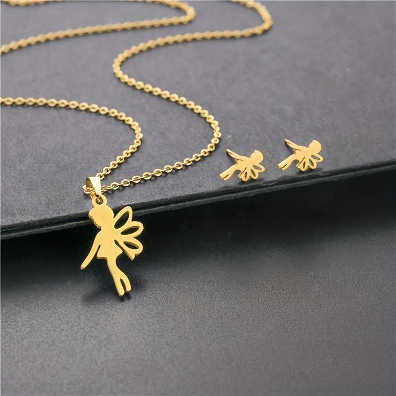 Gold Plated Stainless Steel Angel Pendant Necklace and Earrings Set
