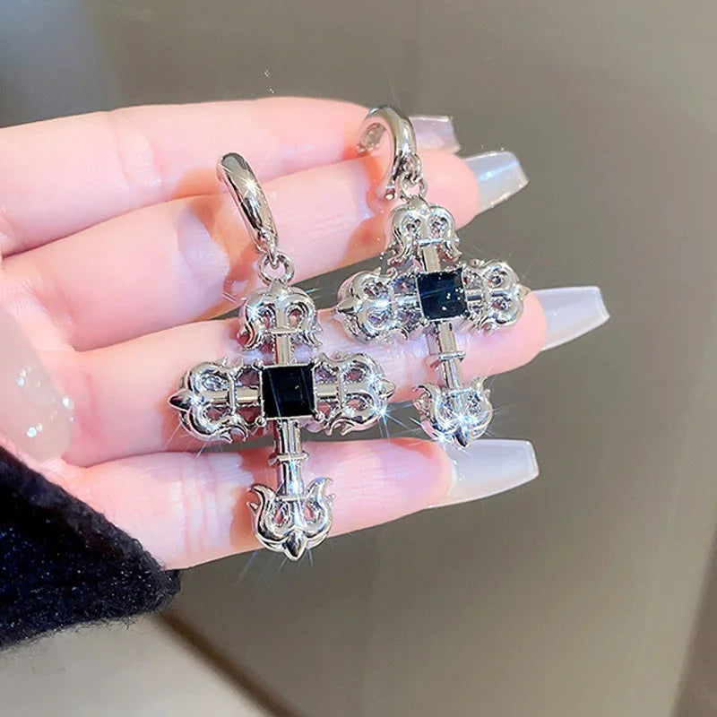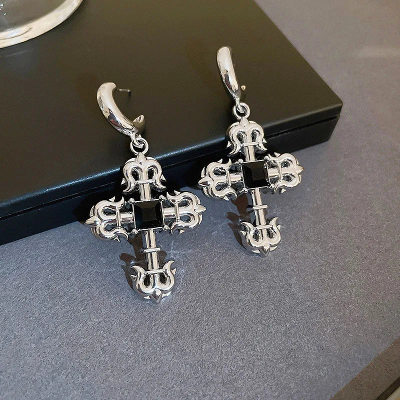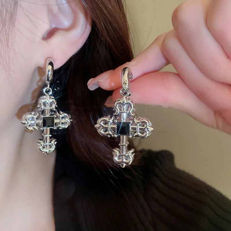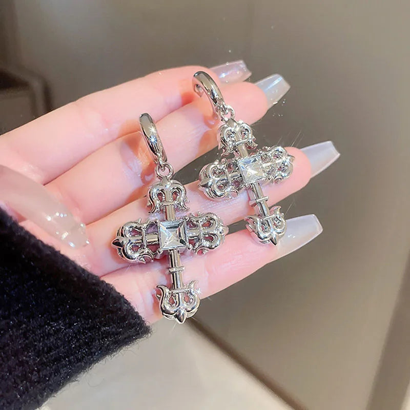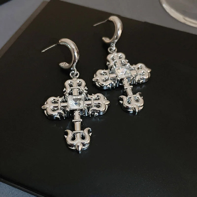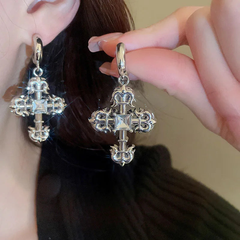 925 Silver Pattern Stud Earrings Jewelry for Girls with a creative design that combines gothic and steampunk elements. The earrings feature a beautiful rhinestone cross.