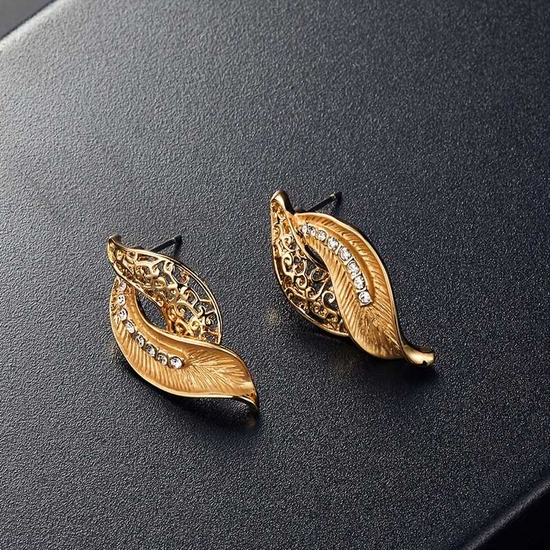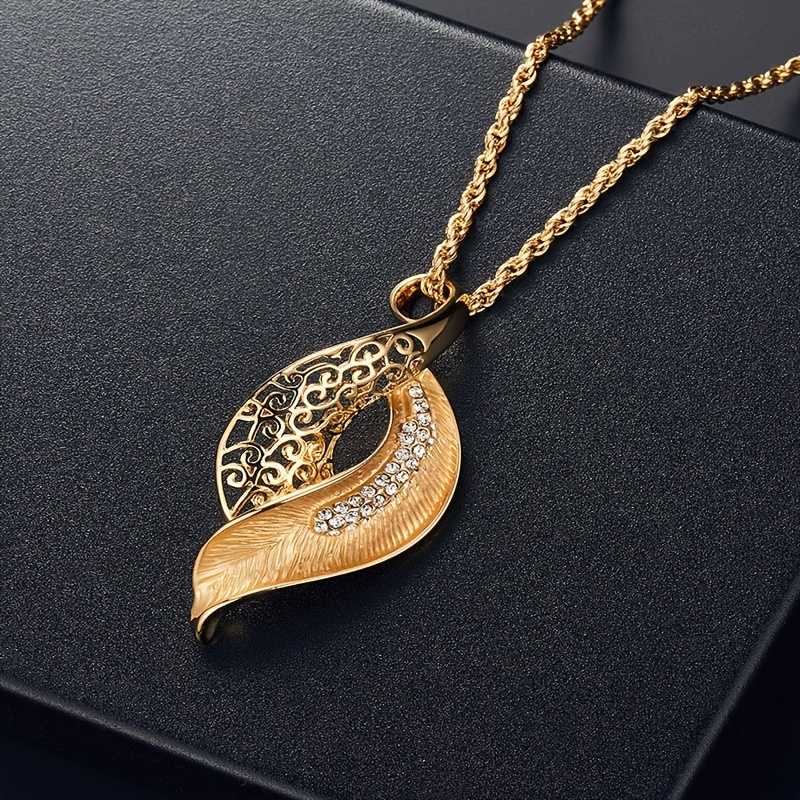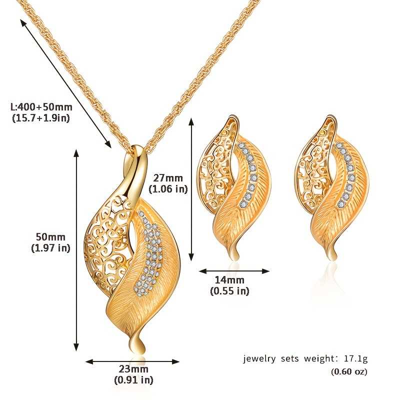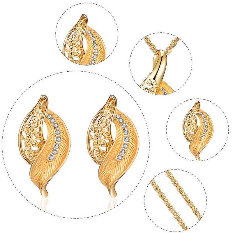 This stunning jewelry set combines the elegance of nature with the brilliance of gold, featuring a hollow leaf design adorned with sparkling rhinestones. The set includes a pendant necklace and matching dangle earrings, each meticulously crafted to bring a sophisticated and timeless look that will complement any wardrobe. The centerpiece of this set is the gold plated hollow leaf pendant, which symbolizes growth, renewal, and beauty. The intricate leaf design, with its delicate cut outs and flowing curves, exudes grace and femininity. Enhanced with carefully inlaid rhinestones, the pendant captures the light, creating a radiant, sparkling effect that adds a touch of luxury.