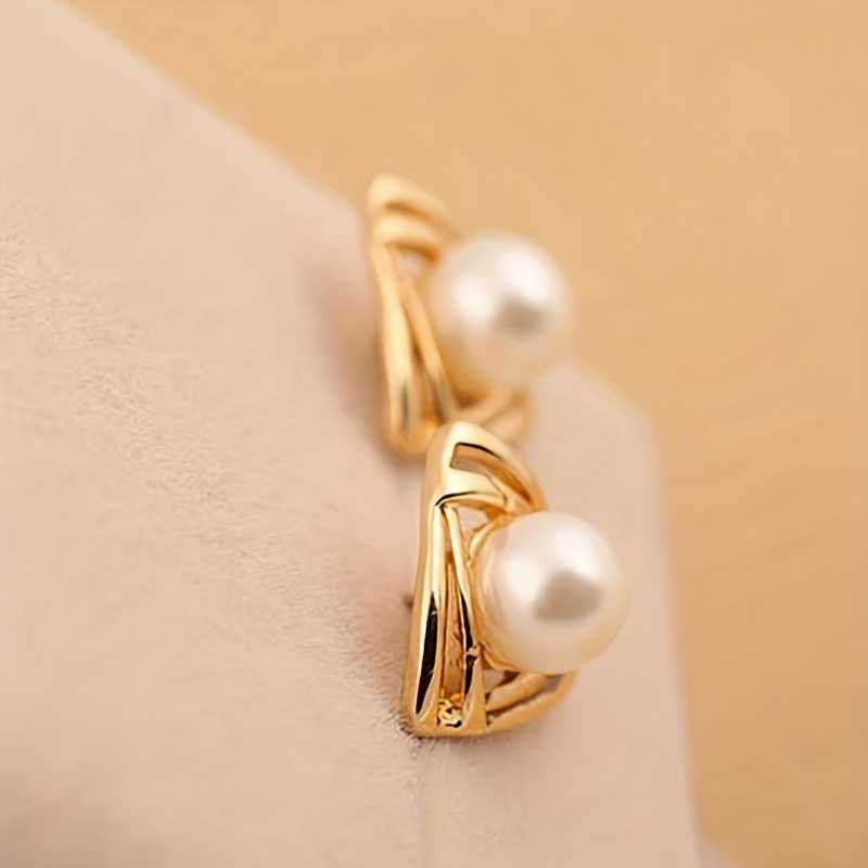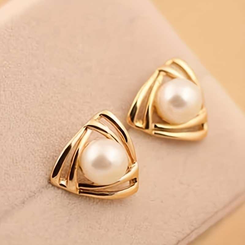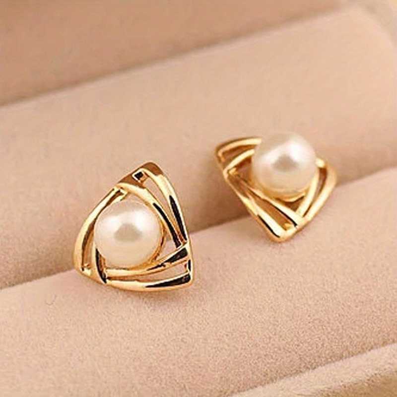 Hollow Triangle Gold Faux Pearl Decor Elegant Stud Earrings for Women