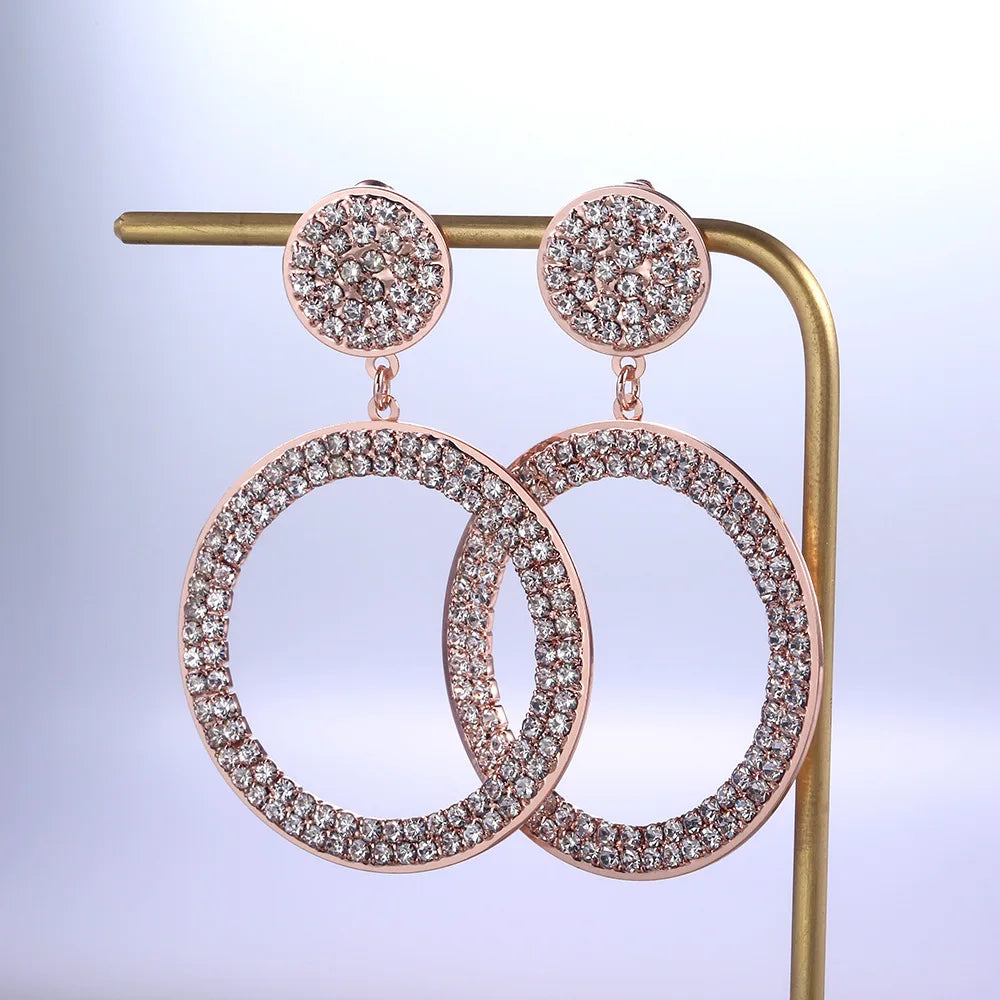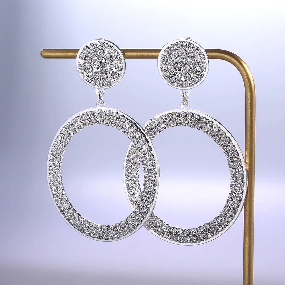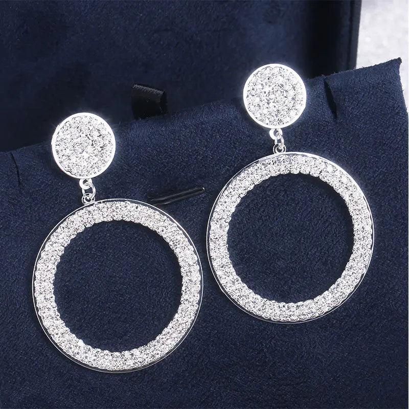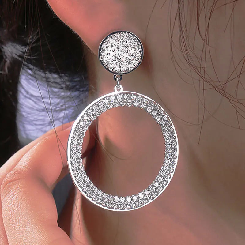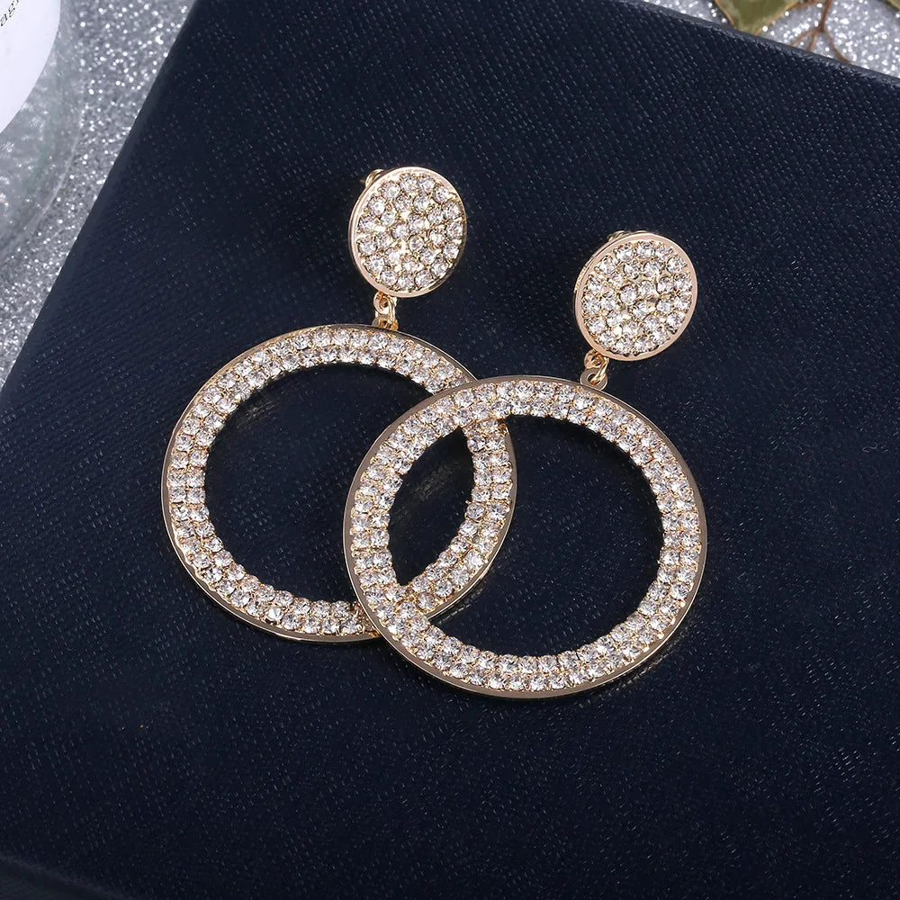 Make a statement with these dazzling big round drop earrings featuring rhinestone accents. Perfect for a night out at the nightclub or party.