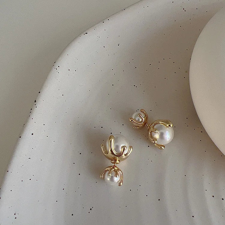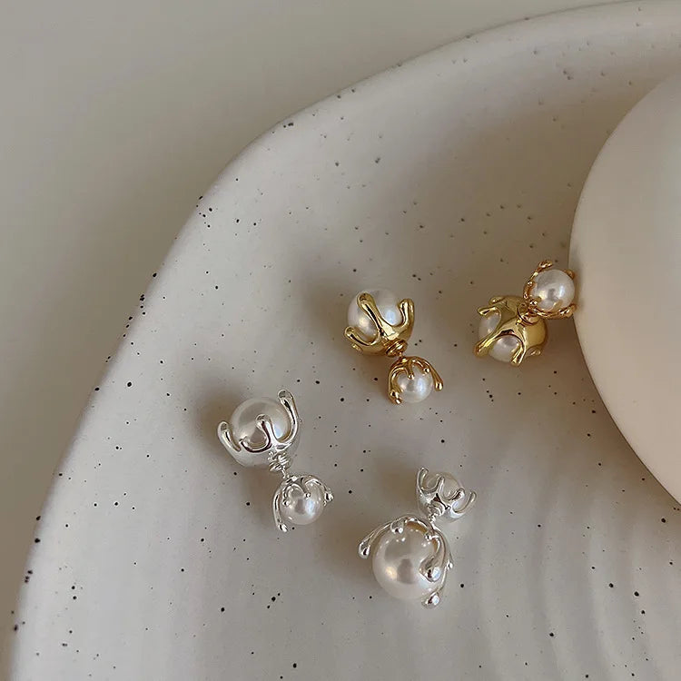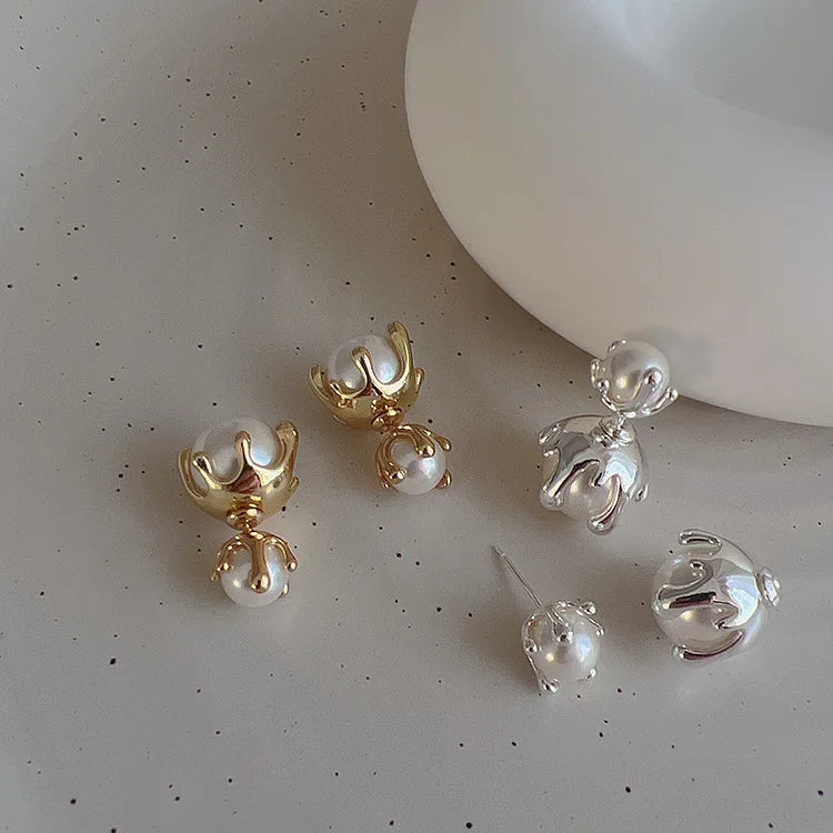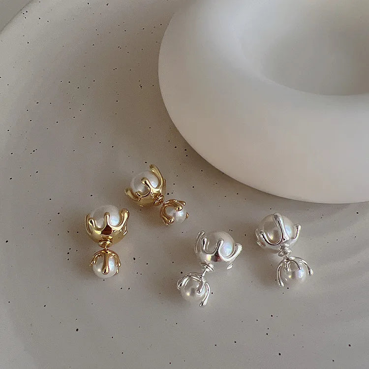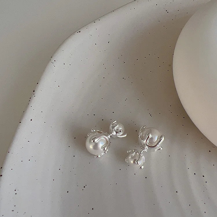 These stud earrings are a perfect blend of retro and modern style, featuring liquid metal and pearl design.