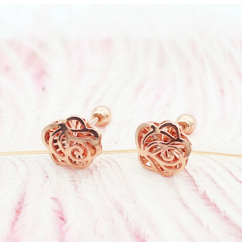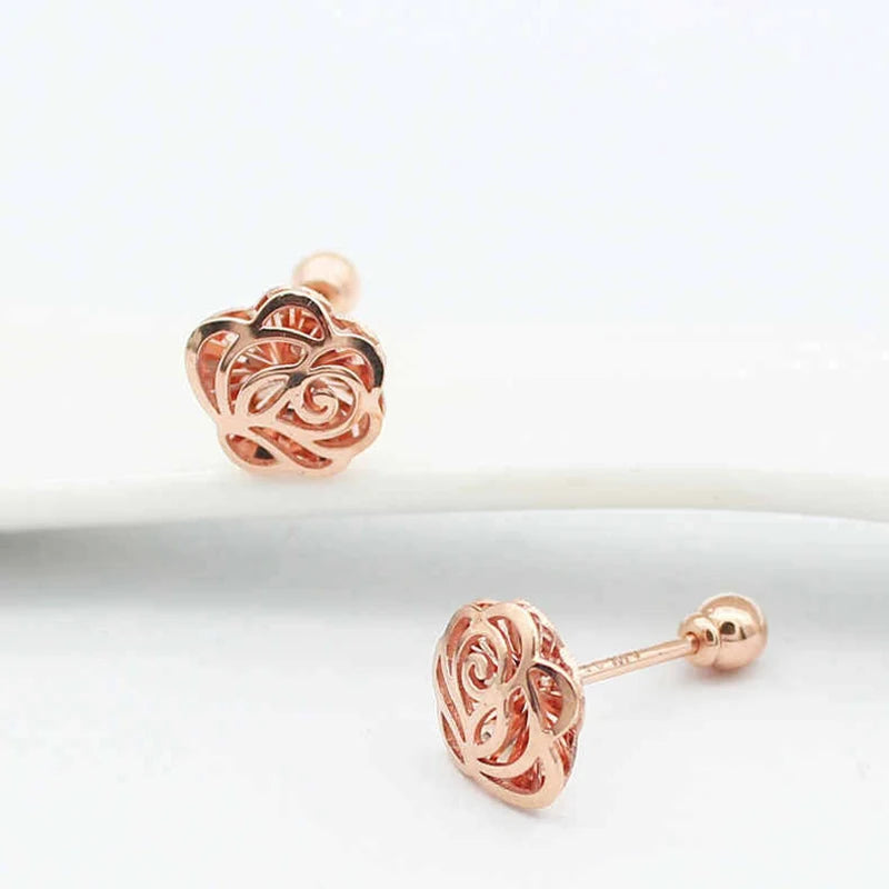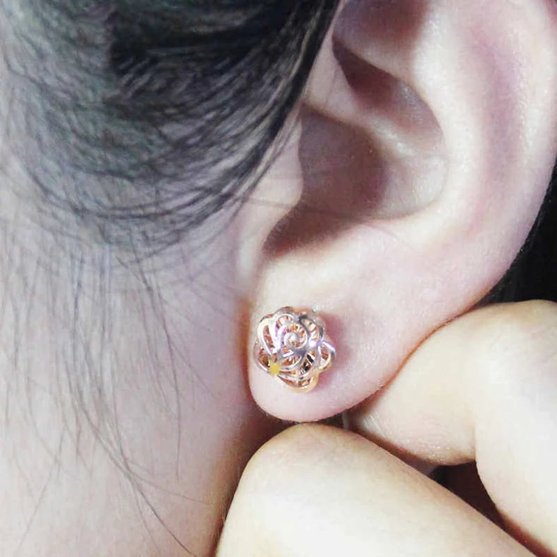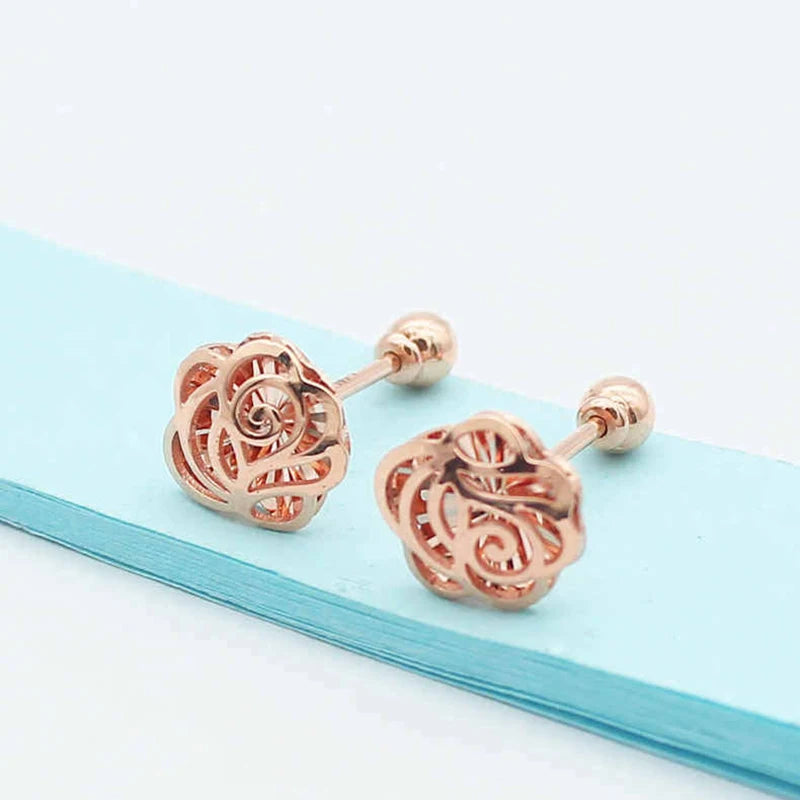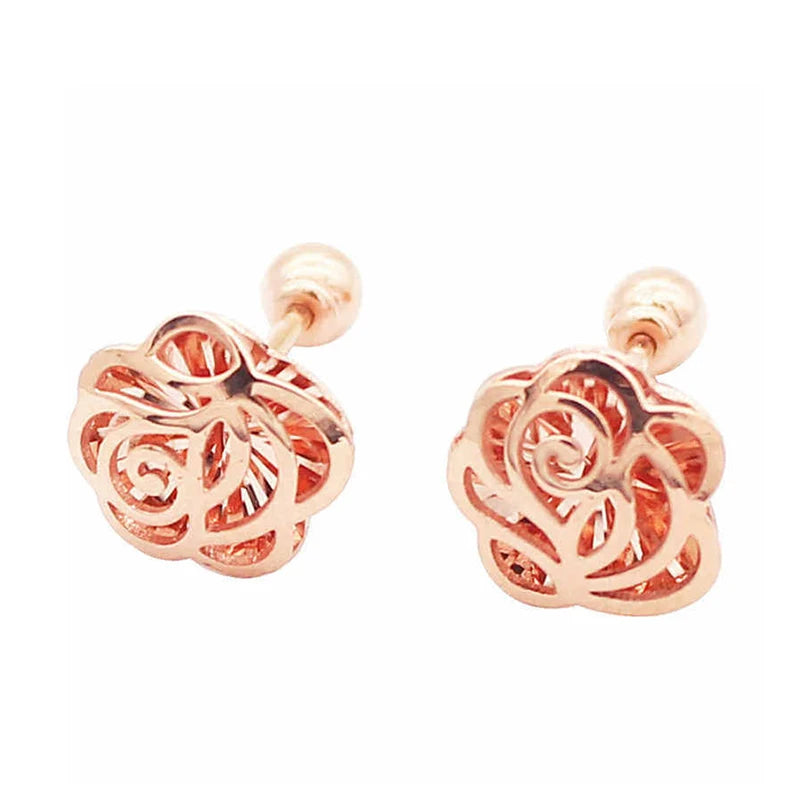 Make a statement with these glamorous 14K rose gold plated geometric flower earrings. Perfect for adding a touch of elegance to any outfit.