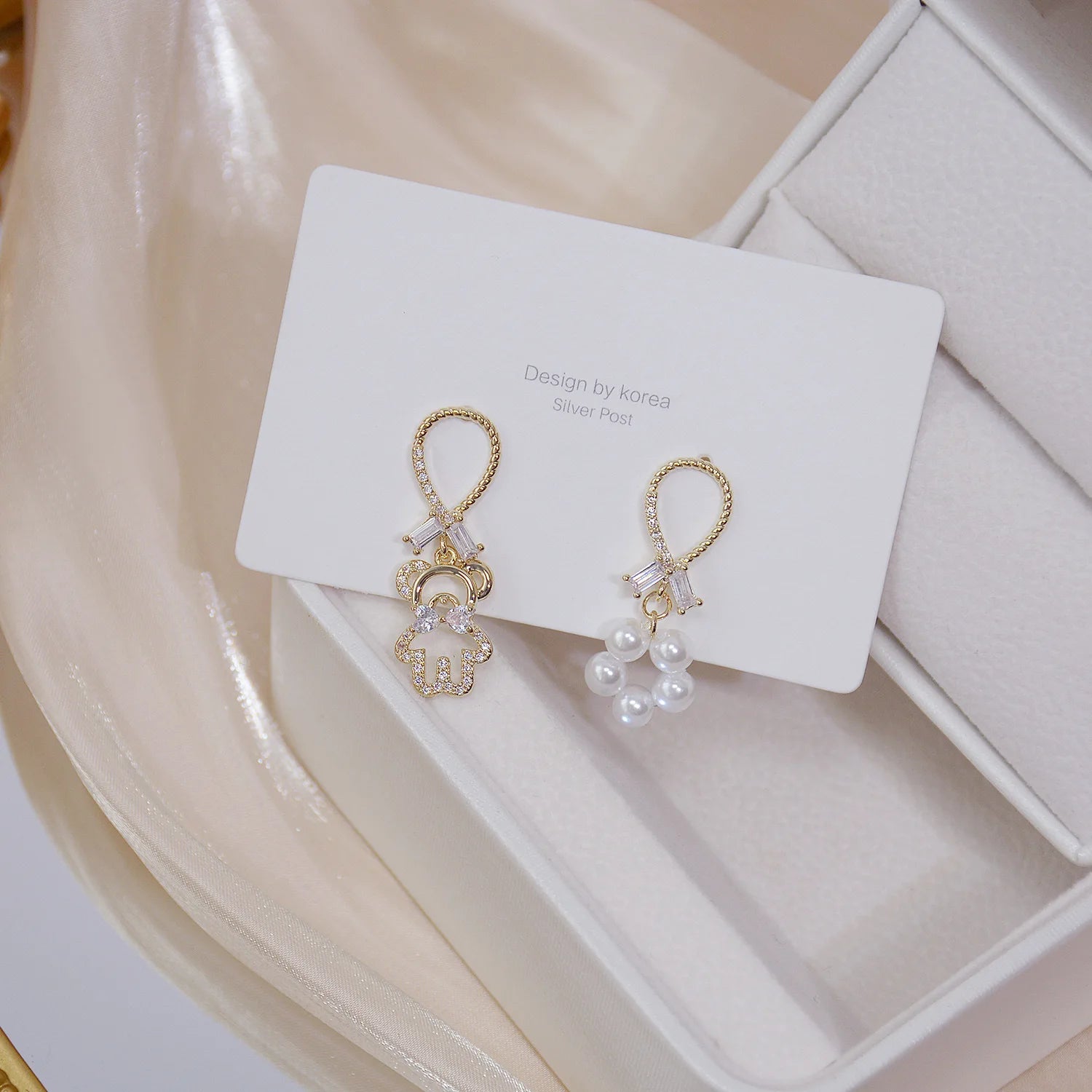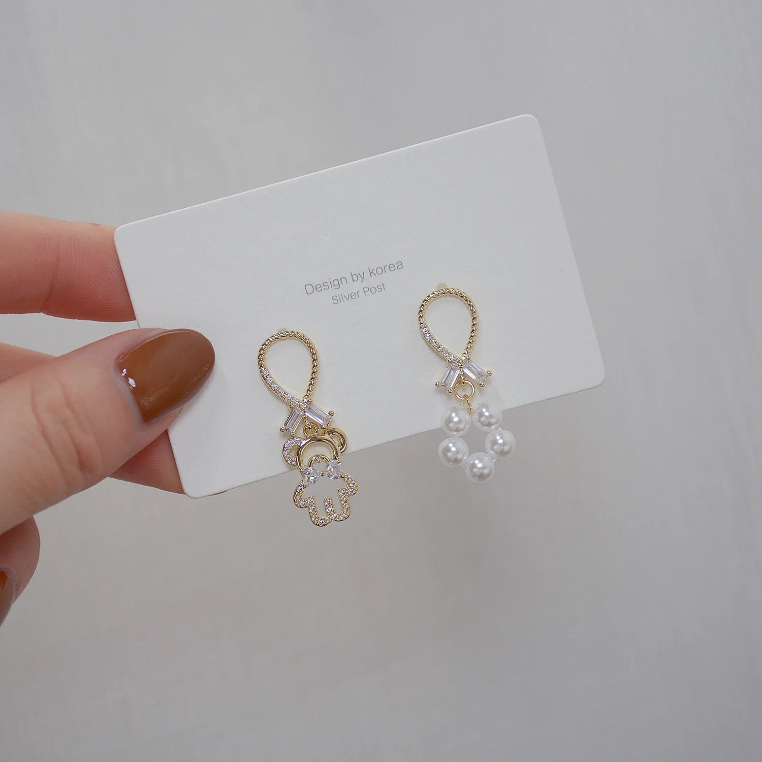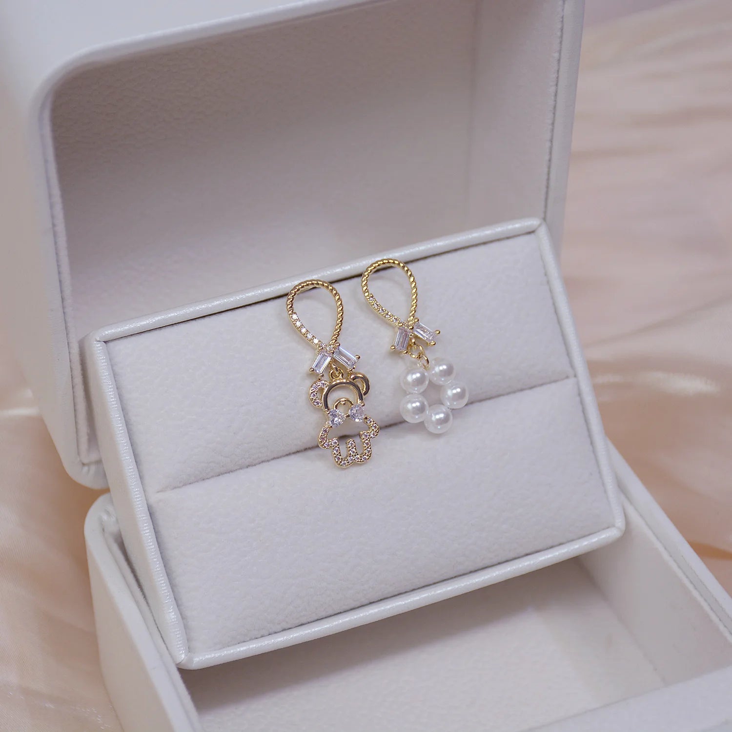 Romantic Asymmetrical Diamond Pearl Bear Earrings