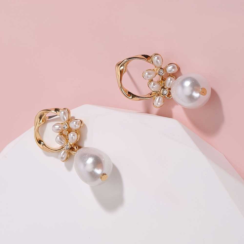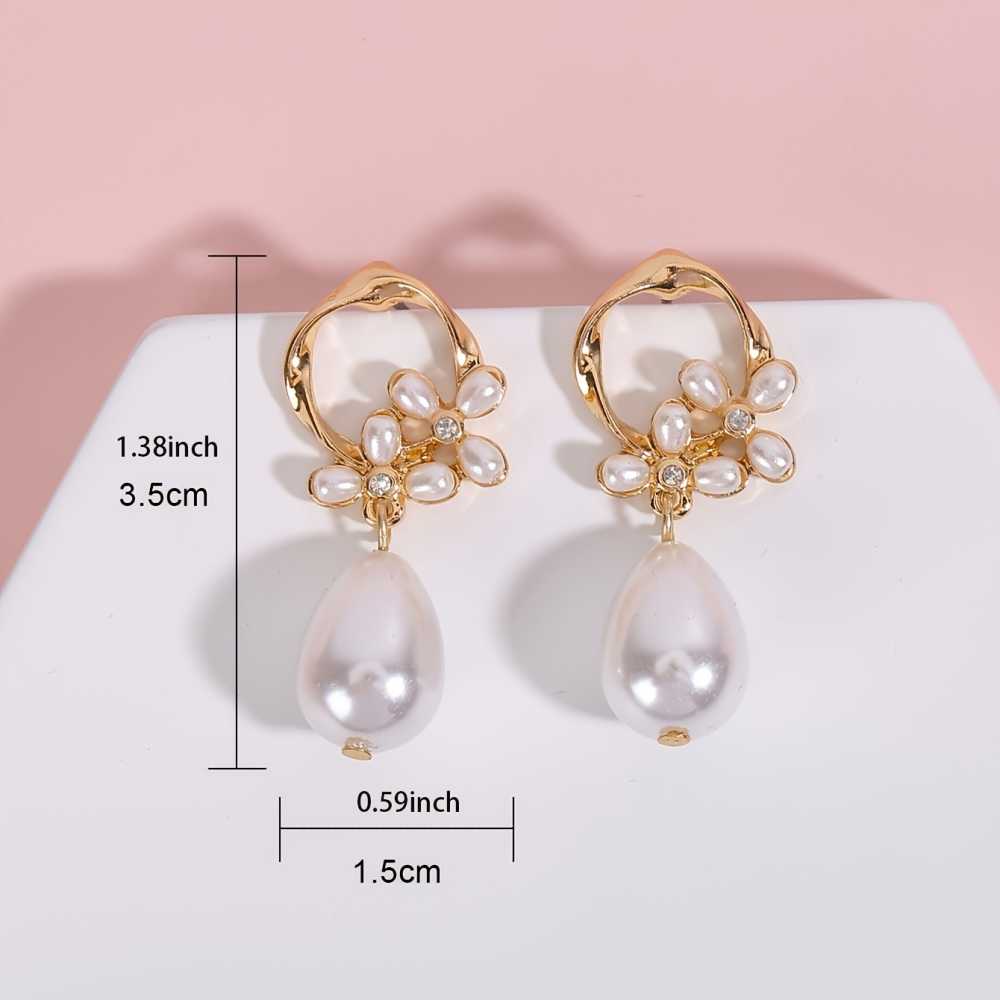 Vintage Flower and Faux Pearl Dangle Earrings Gold Plated with Zirconia