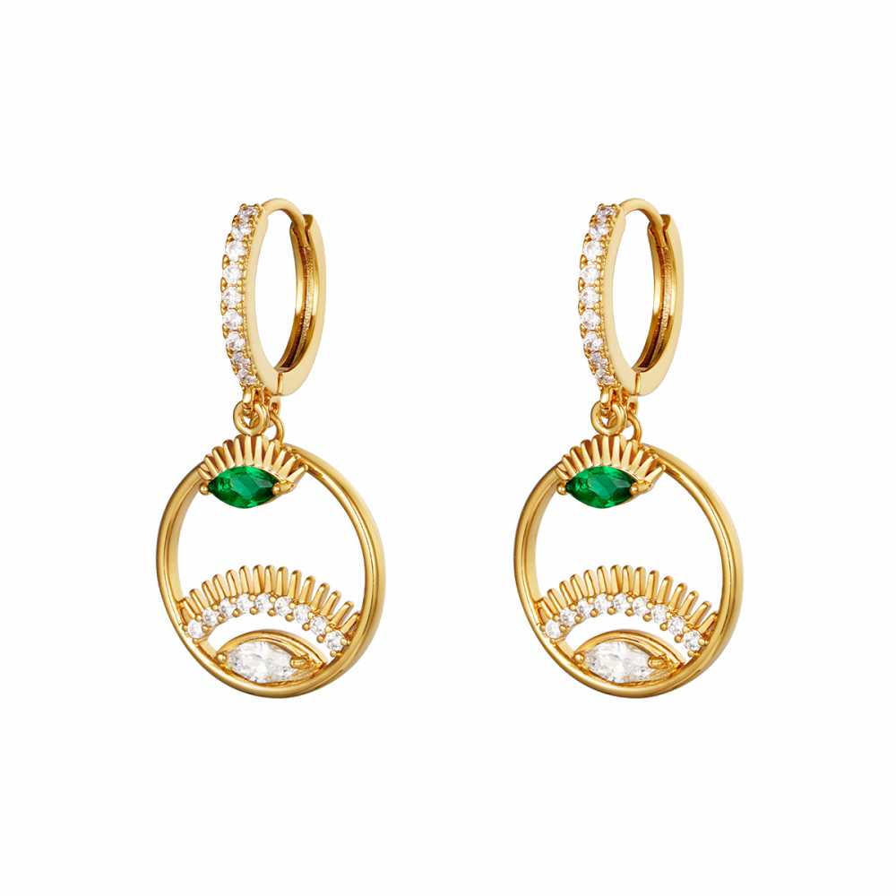 These drop earrings have a protective symbol of the eye and are beautifully embellished in striking emerald green and with cubic zirconia. The evil eye will ward off negative energy and protect against evil. Wear them and let them sway with the breeze.