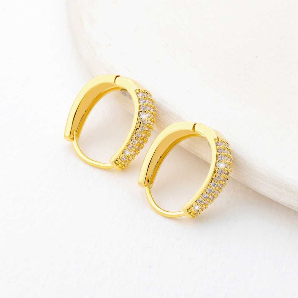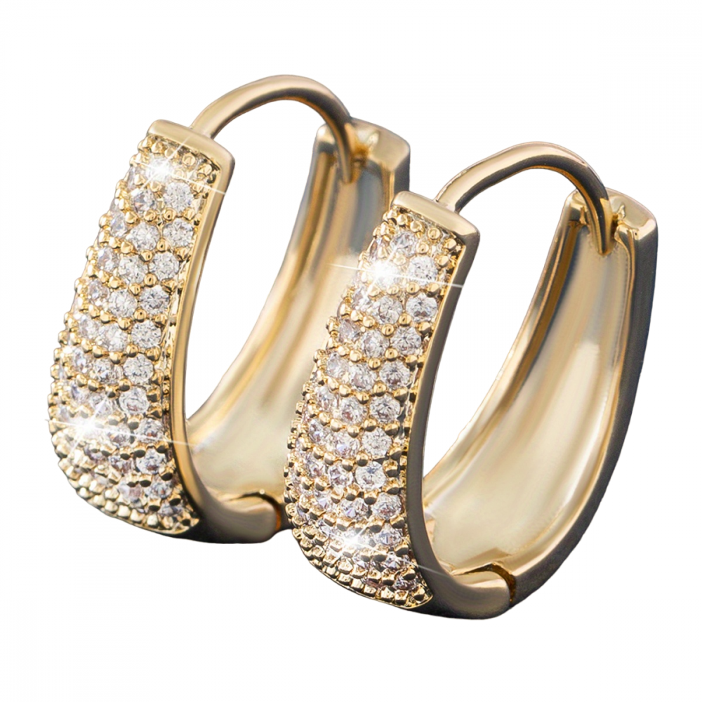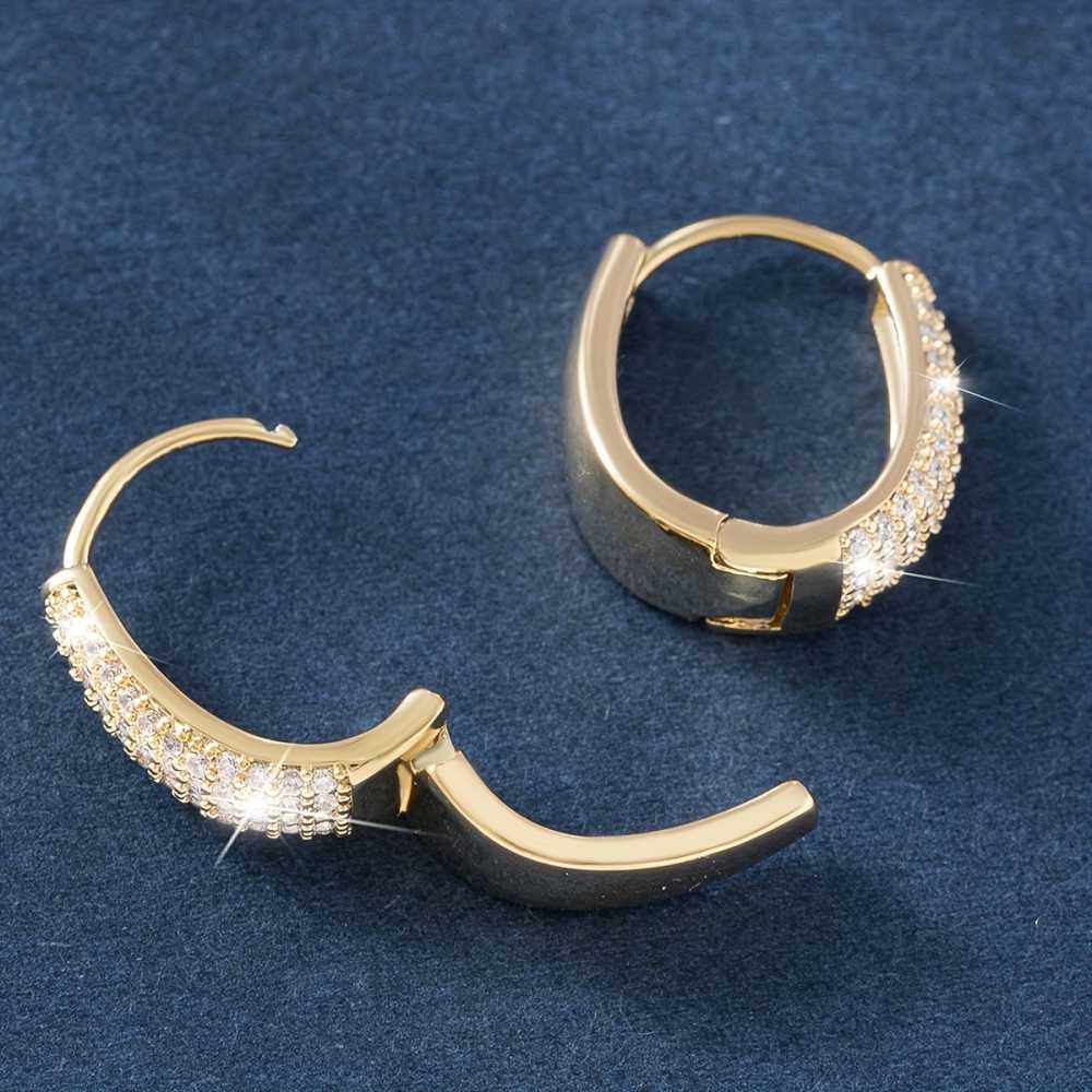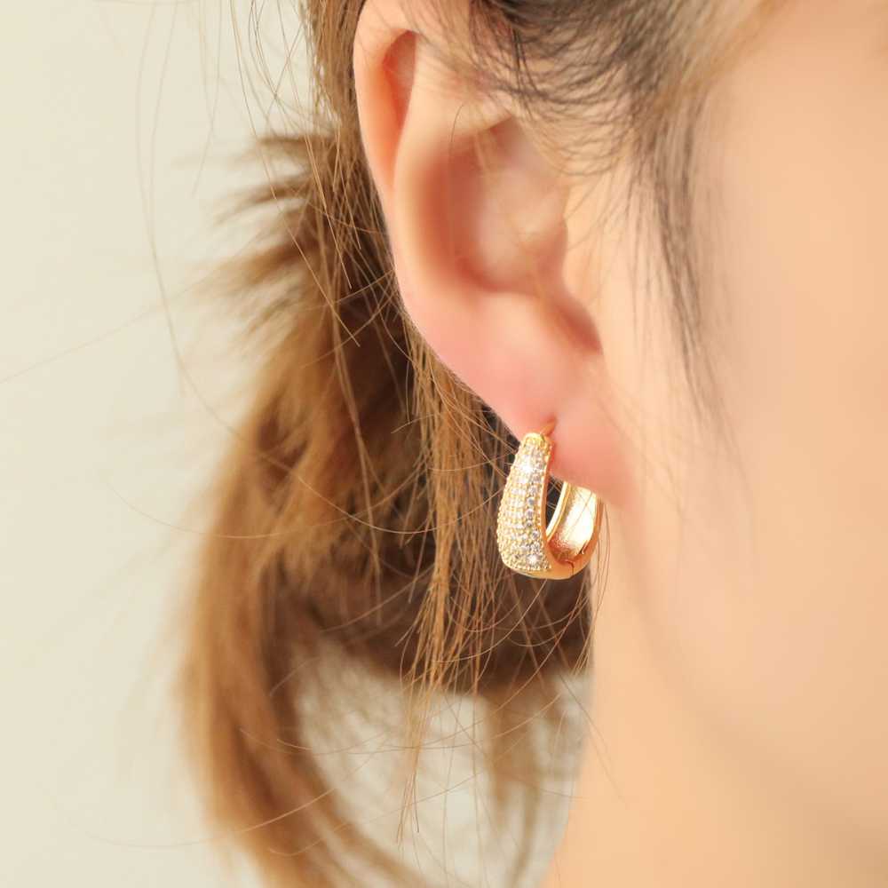 This earrings feature a timeless hoop design with a twist, boasting a hinged closure for easy wear and added security. Each hoop is meticulously embellished with sparkling cubic zirconia stones, elevating this earrings to a new level of brilliance. The cubic zirconia stones are intricately set along the outer surface of the hoops, catching and reflecting light with every movement, adding a touch of glamour to any look. Crafted with high quality materials, these earrings are designed to be lightweight for comfort during extended wear while maintaining durability and style. Their versatility allows them to effortlessly transition from casual daywear to elegant evening attire, making them a must have accessory for various occasions. The exquisite combination of the hinged design and the radiant cubic zirconia stones makes these earrings a statement piece, offering both sophistication and a hint of sparkle to accentuate your style. Elevate your ensemble with these earrings a perfect balance of timeless charm and contemporary allure, ideal for expressing your unique sense of fashion with grace and glamour.