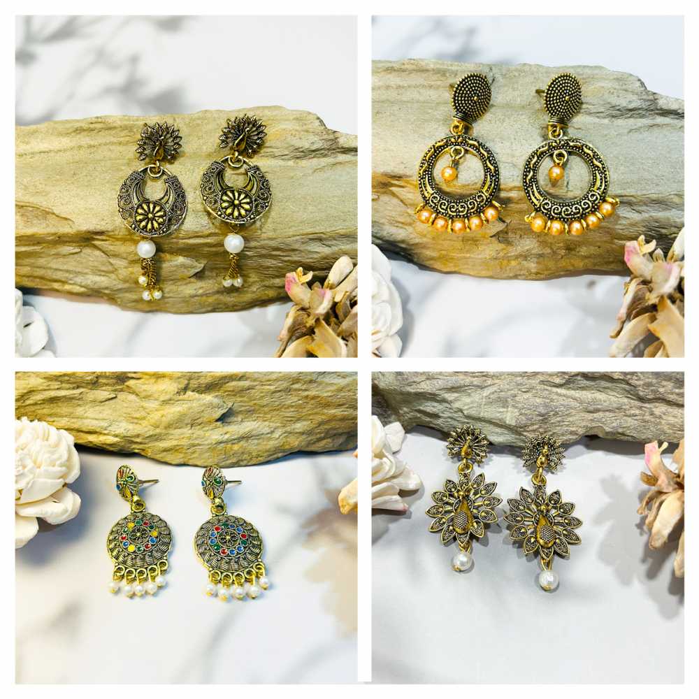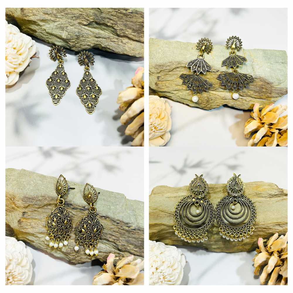 • Product Particulars: Crafted from high quality gold plated oxidised zinc metal comes with chandelier model. All the earrings have comfortable push back closures.