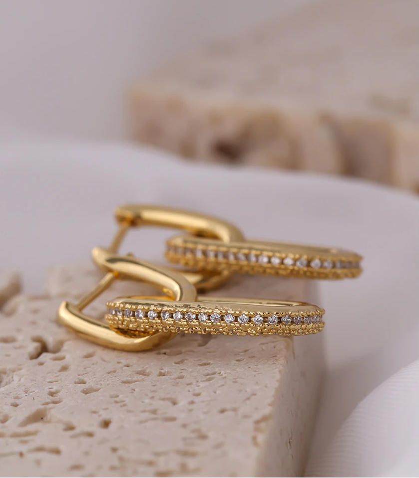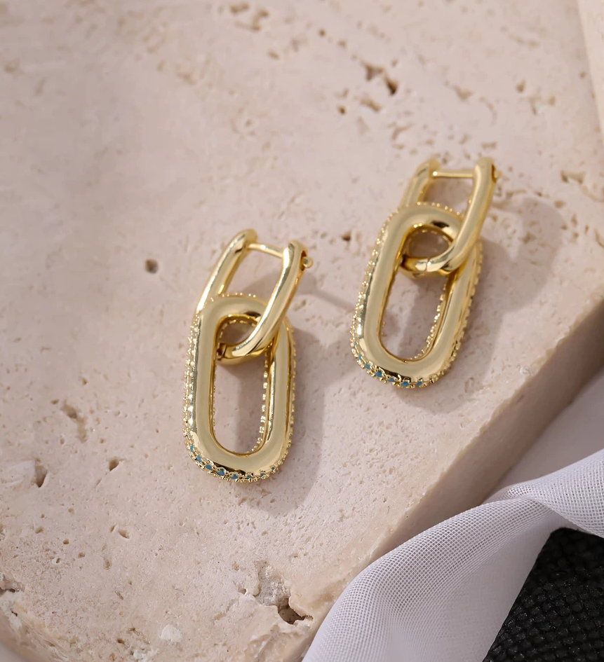 These oval link interlocking earrings are simple yet unique. It features an oval link studded with cubic zirconia interlocked by a simple hoop. Pair with any layered link chain pendant necklaces to create a beautiful sought after look.