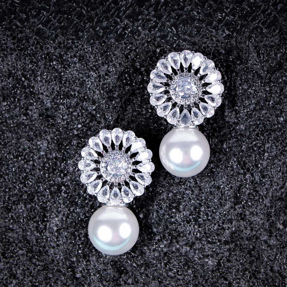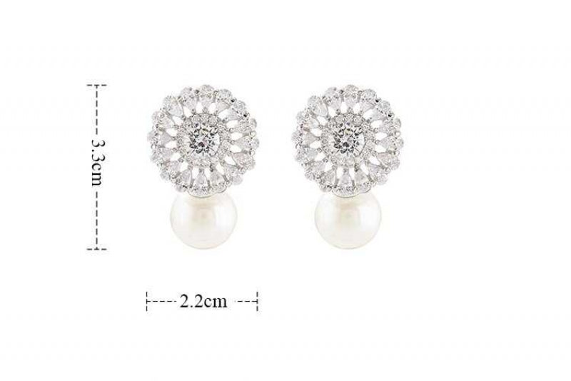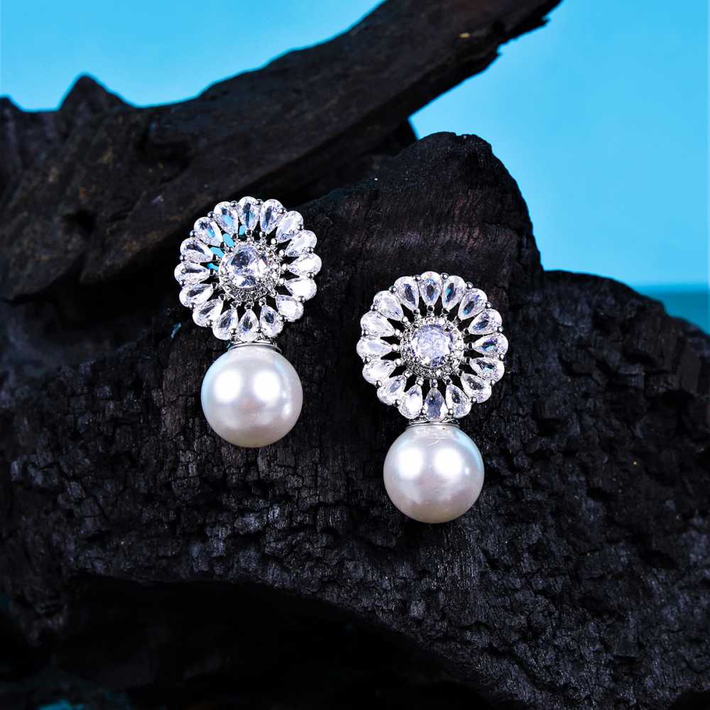 Women's Silver Plated Floral Motif Zirconia Pearl Earring