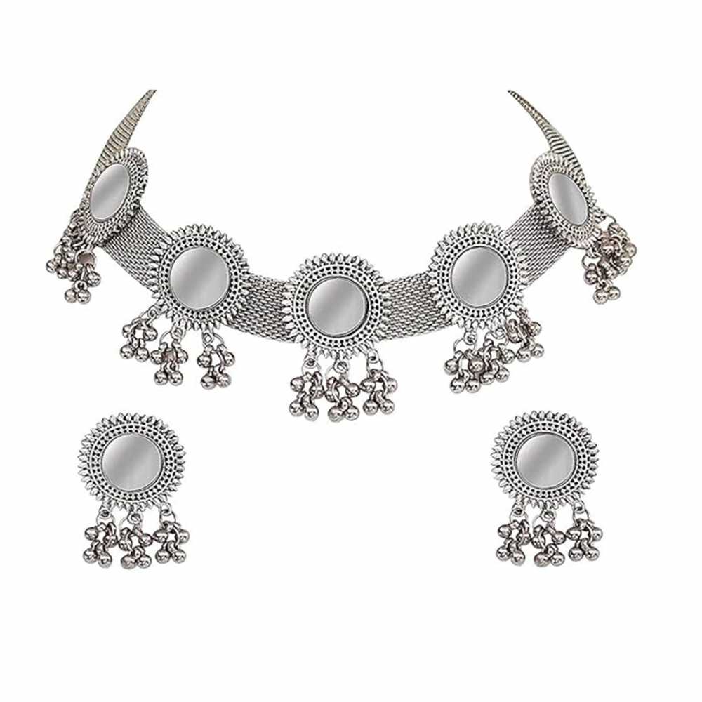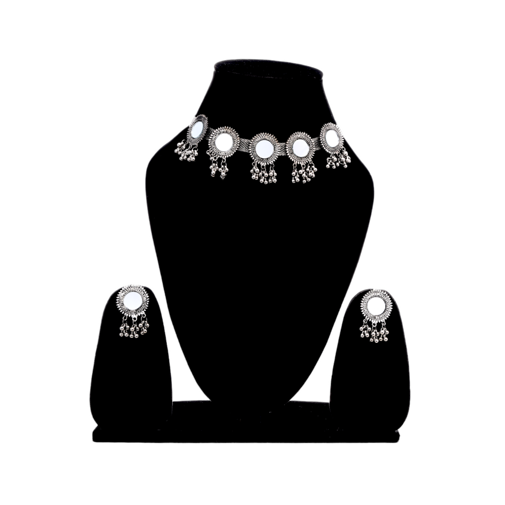 Women's Round Shaped Mirror Work Choker Necklace With Stud Earrings