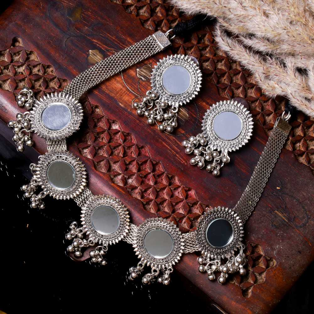 • Product Particulars: This round shaped Jewelry set is made of high quality material plated with silver oxidized and studded with mirrors.