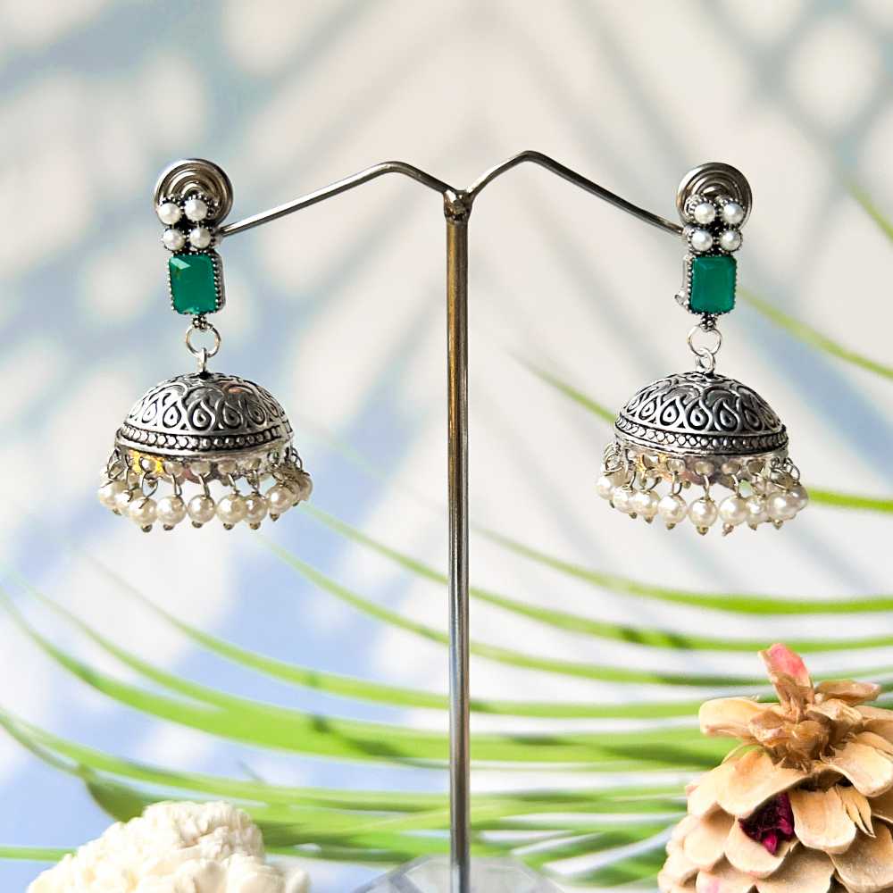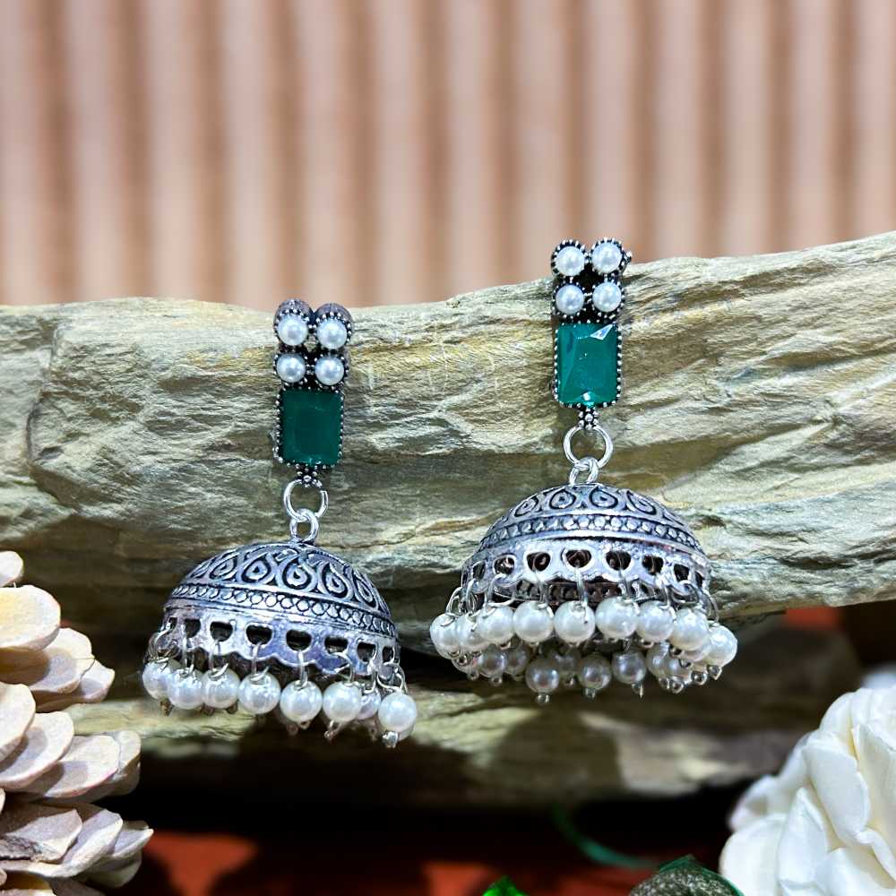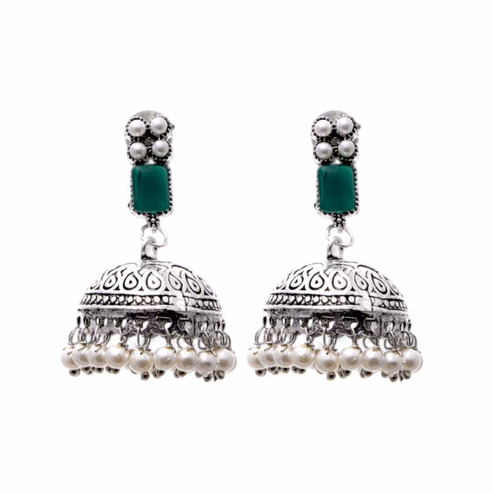 Women's Silver Oxidized Jhumka Earring With Tasseled Pearl Beads