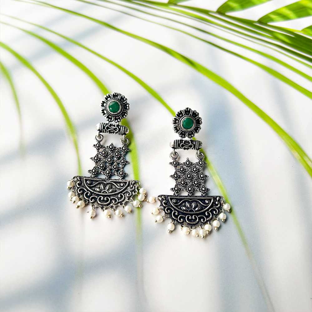 Bling Queen is an affordable fashion jewellery brand with various product types like bracelets, necklaces, earrings, rings, etc. suitable for women, men and kids. The standout feature of these earrings is the intricate geometric patterns incorporated into their design. The earrings are adorned with pearl drops, which can be round shaped variations. The contrast between the geometric patterns and the soft, lustrous pearls creates a captivating visual effect. These earrings are designed in a drop style, where the geometric patterned element hangs elegantly below the earlobe. he color scheme typically includes silver tones from the plating, along with the natural hues of pearls. This versatile color palette complements a wide range of outfits and styles. The combination of the oxidized finish, geometric patterns, and pearl accents gives the earrings a unique antique charm. They are ideal for those who appreciate vintage inspired jewelry with a modern twist.