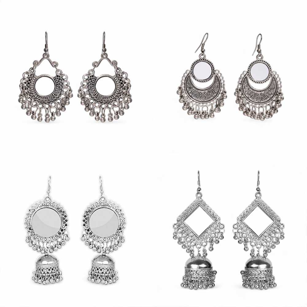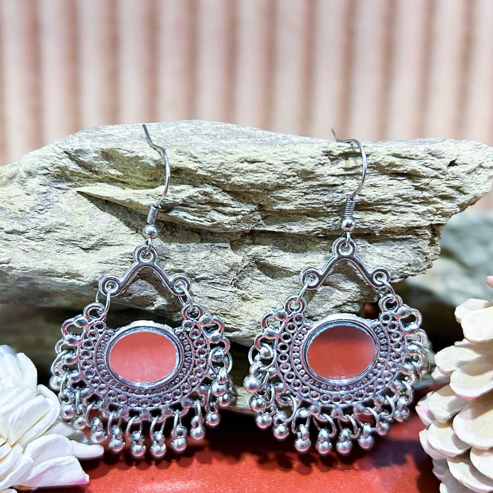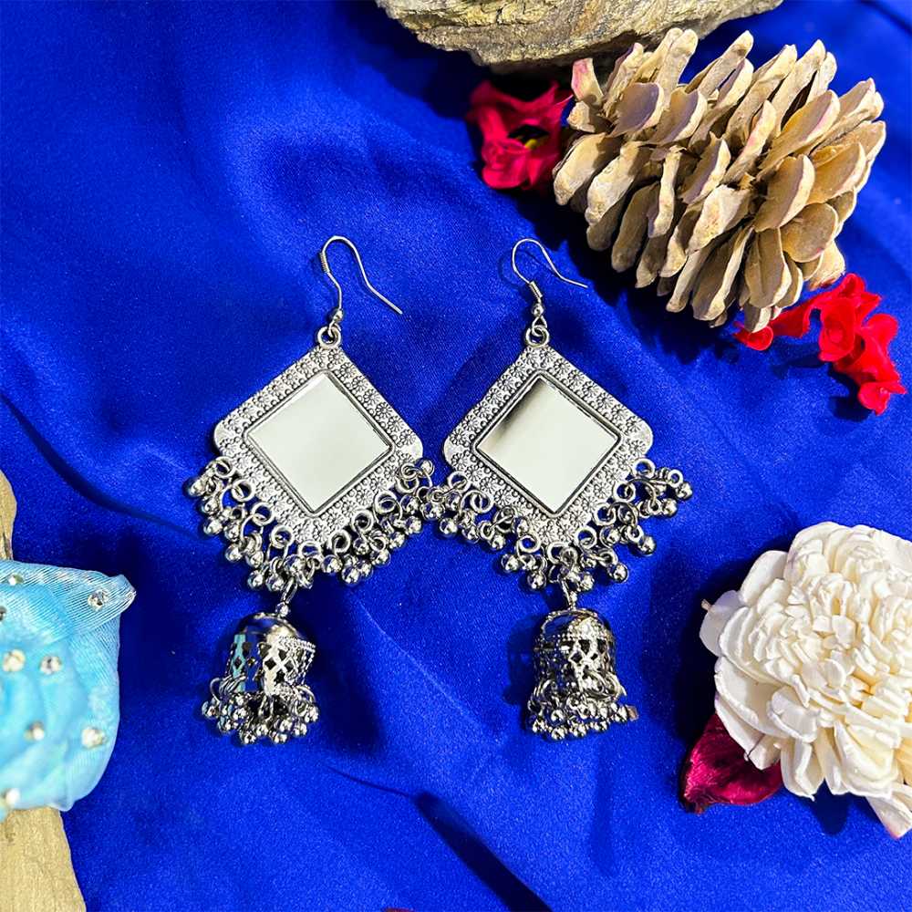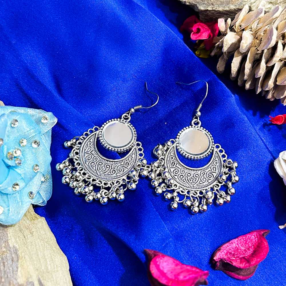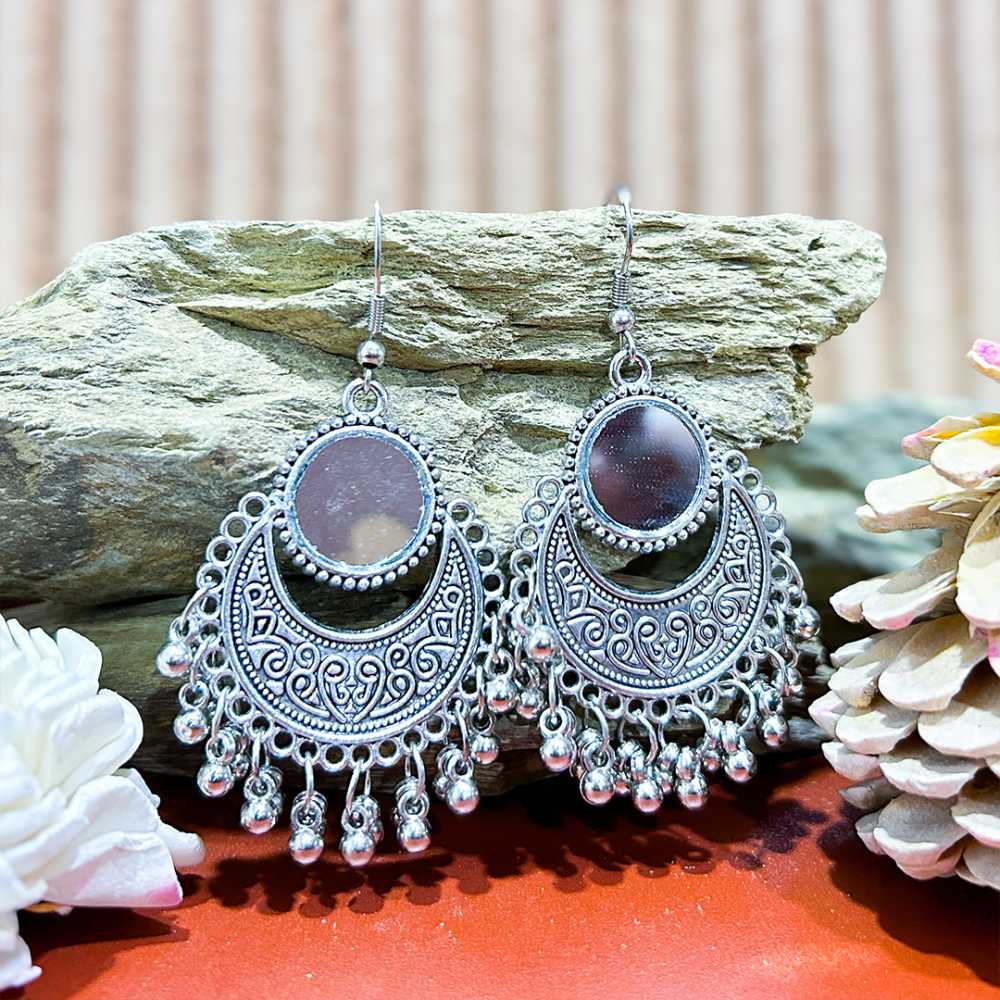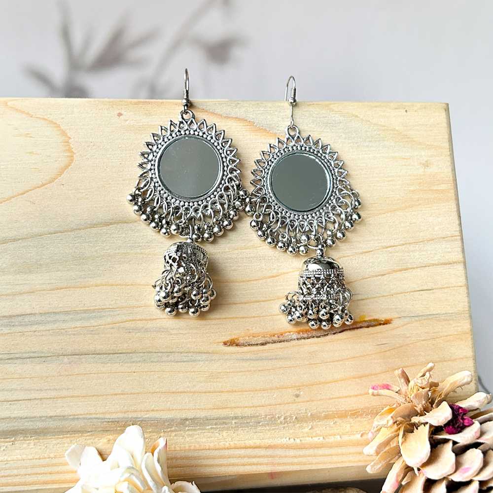 • Product Particulars: Crafted from high quality silver plated oxidised metal, embossed with mirrors. These earring are secured with fish hook closure.