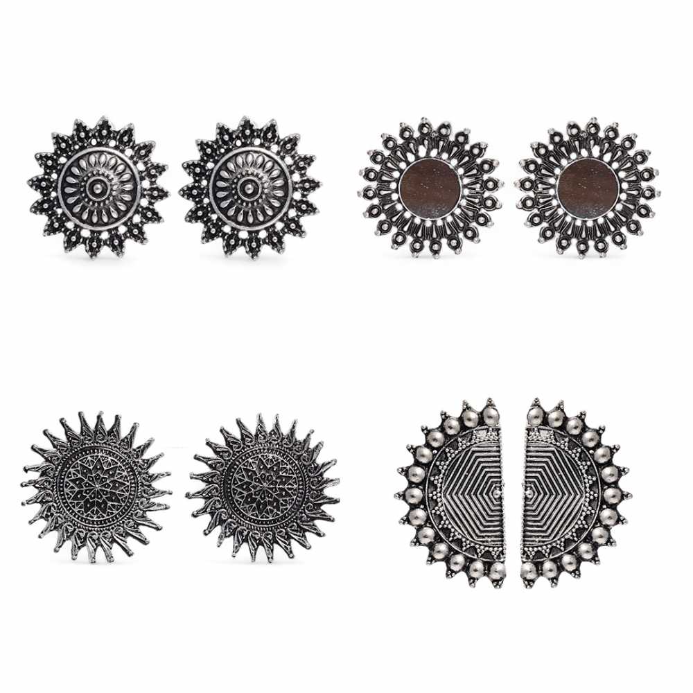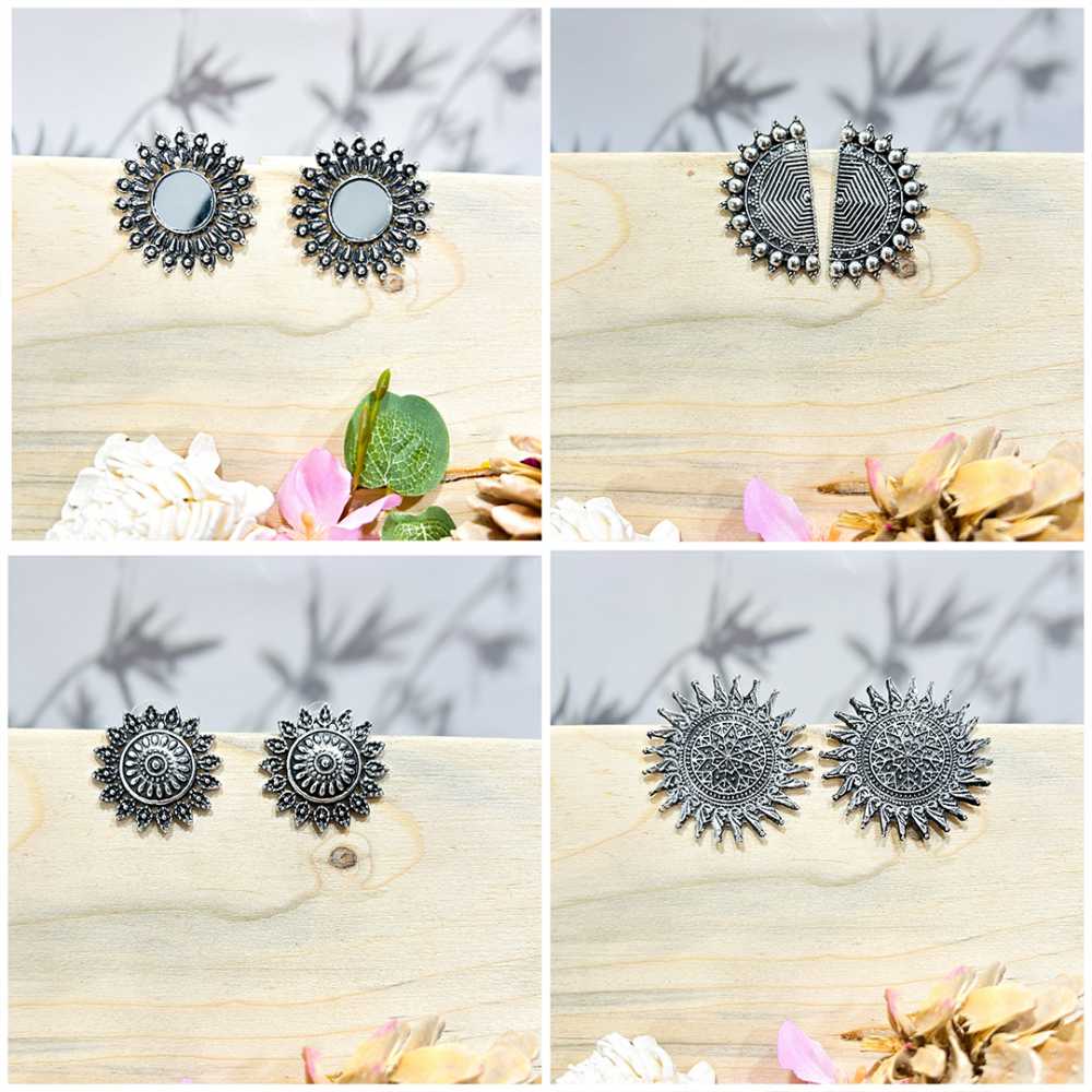 Each earring features a stud design, making them comfortable to wear for extended periods. The mirror work is the highlight, with small mirrors intricately set within the metal framework. This design element creates a reflective and eye catching effect. The combo set includes four pairs of earrings, offering versatility in styling. You can choose from different designs or mix and match according to your outfit and mood. The silver plating complements a wide range of colors and clothing styles. These earrings are versatile enough to be worn casually with jeans and a top or dressed up for formal events. The mirror work adds a touch of ethnic charm, making them suitable for traditional wear like sarees, salwar suits, or fusion outfits.