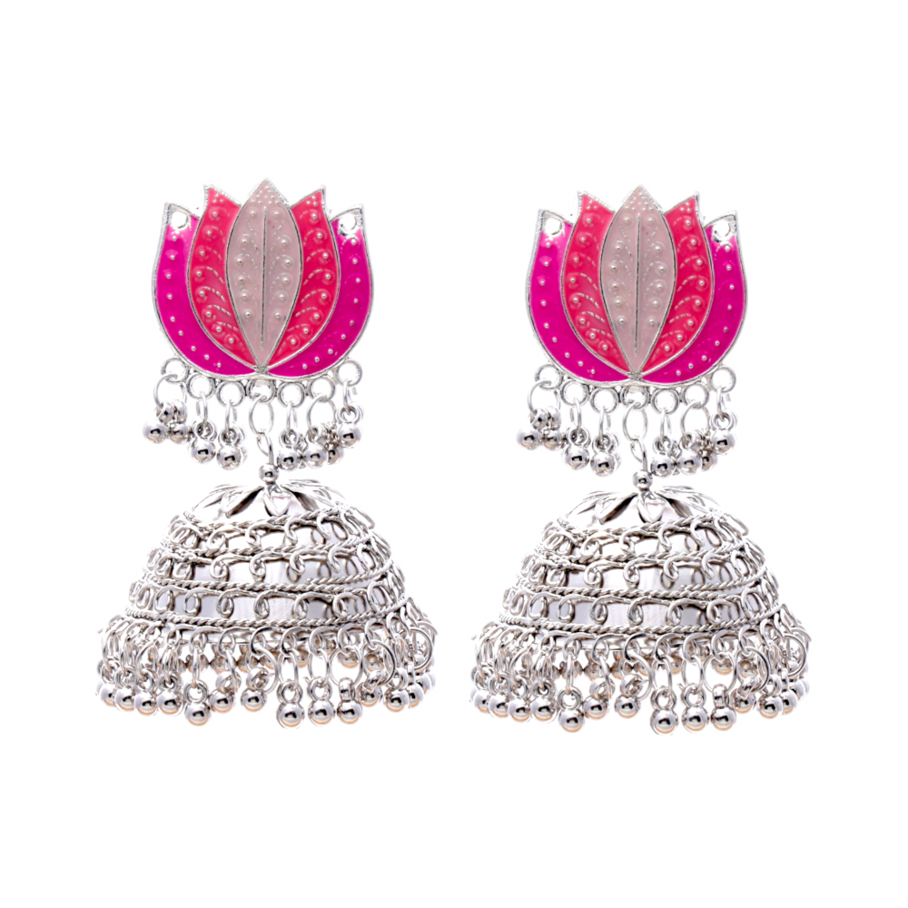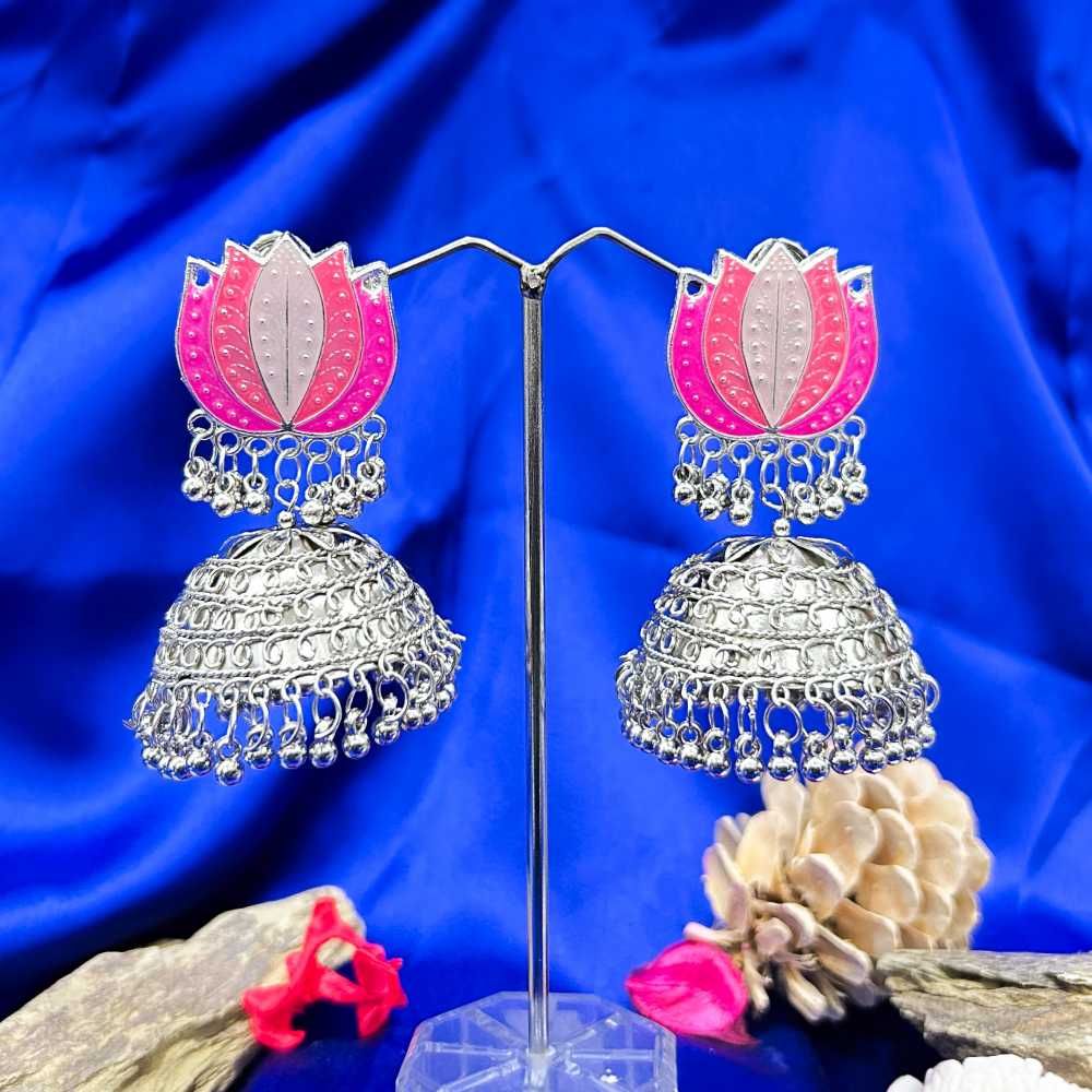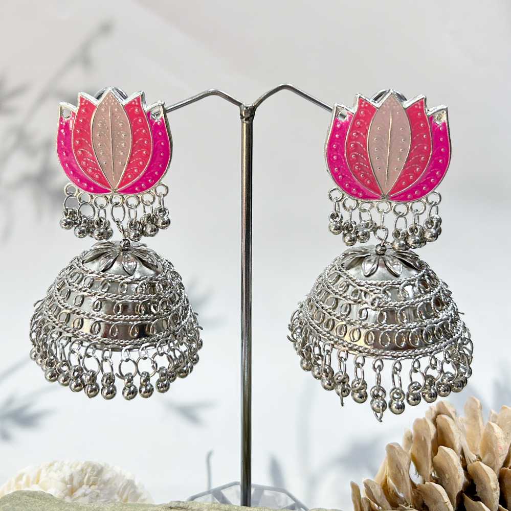 - Product Particulars: Crafted from high quality silver plated oxidised brass metal with enamel coated lotus motif. These earring is secured with push back closure.