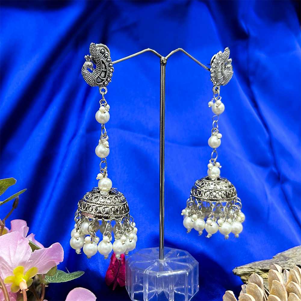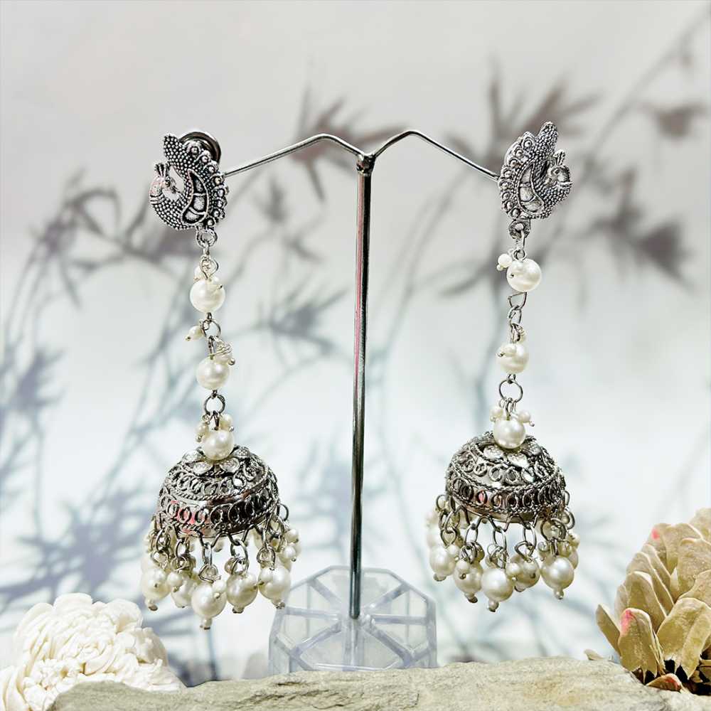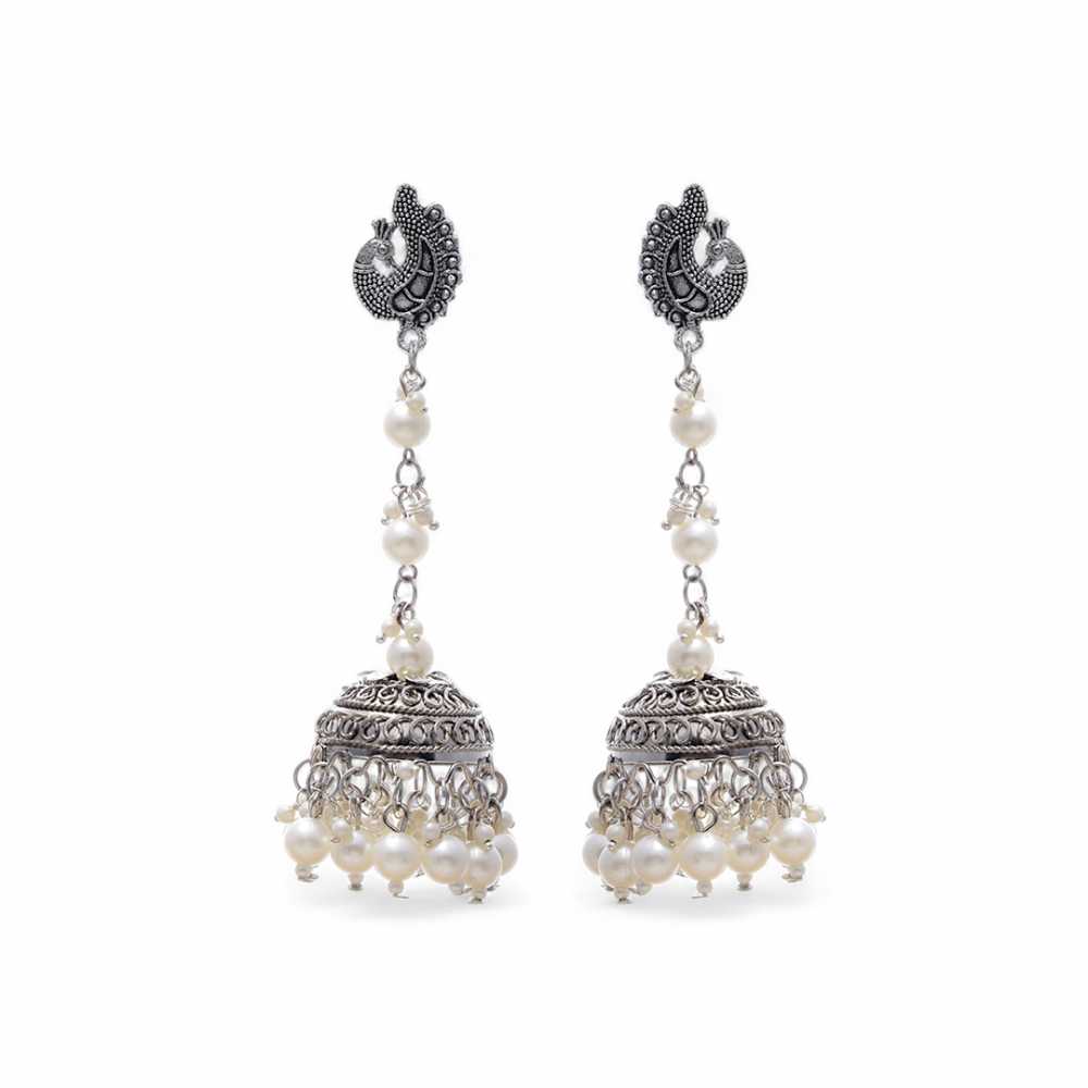 Women's Silver Plated Oxidised Peacock Engraved Pearl Drop Jhumka Earring