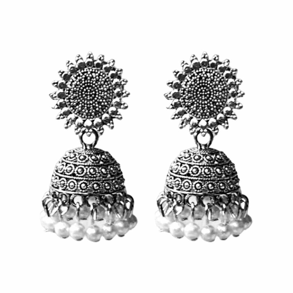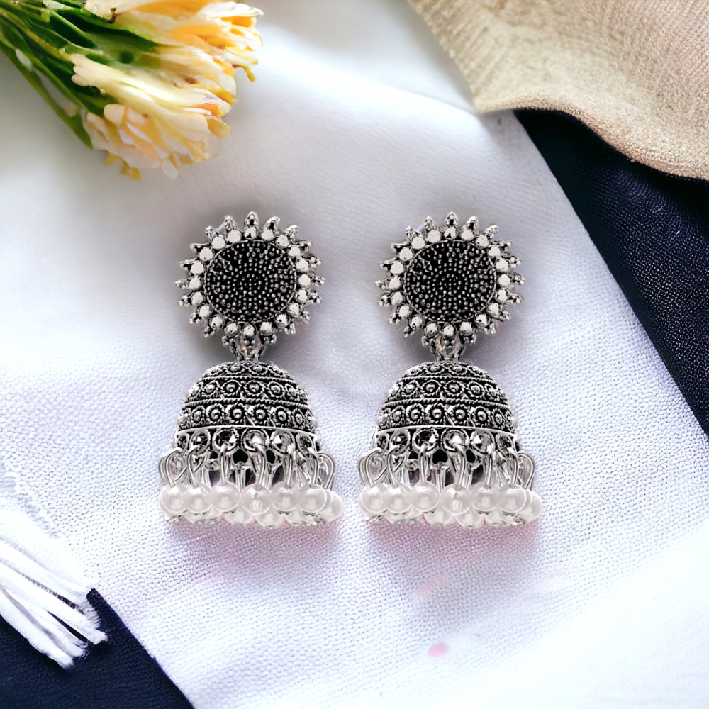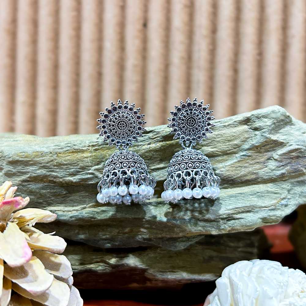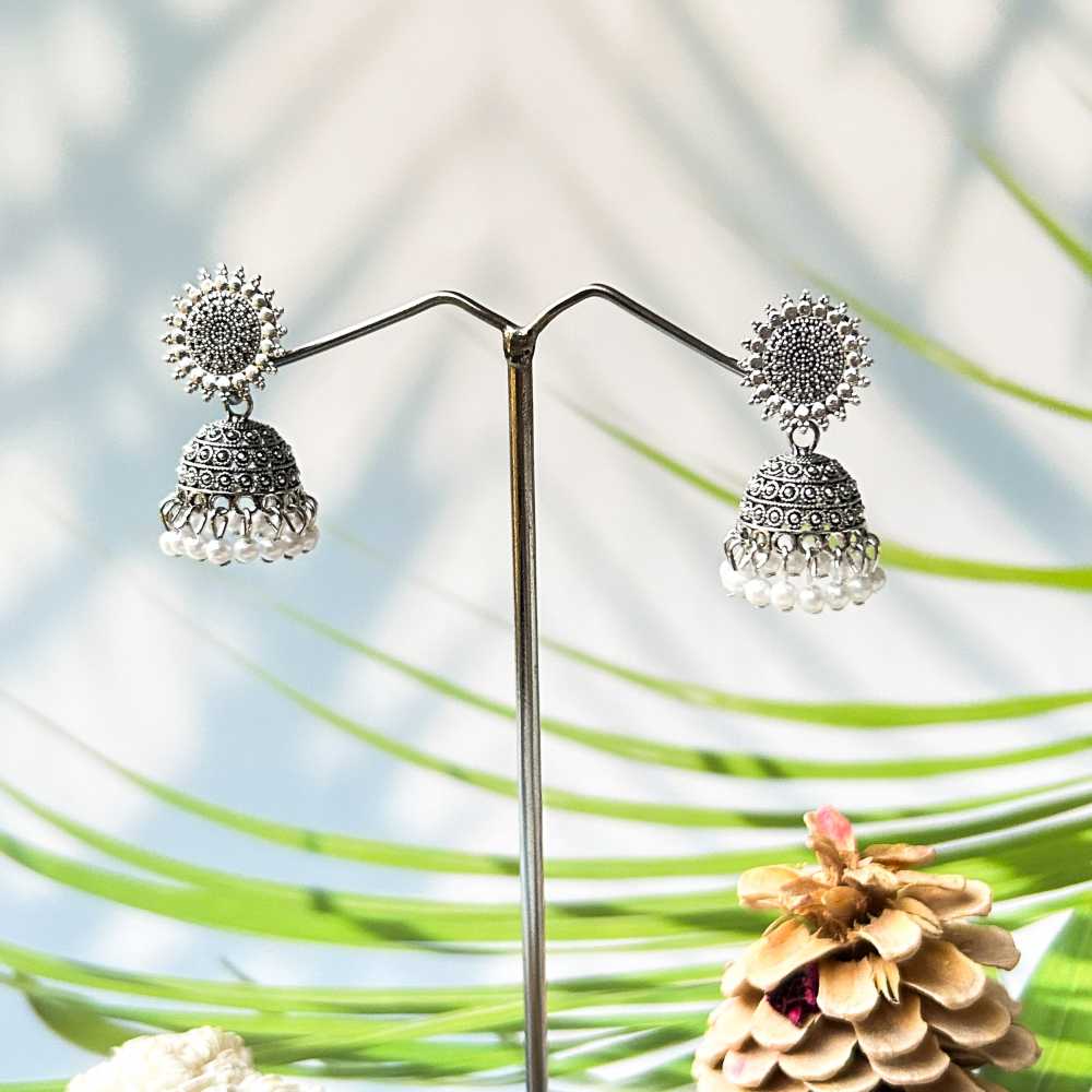 Women's Silver Plated Oxidised Pearl Embossed Jhumka Earring