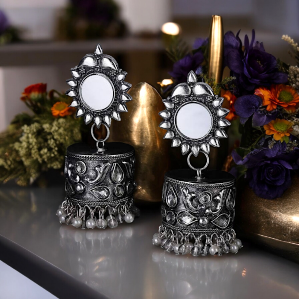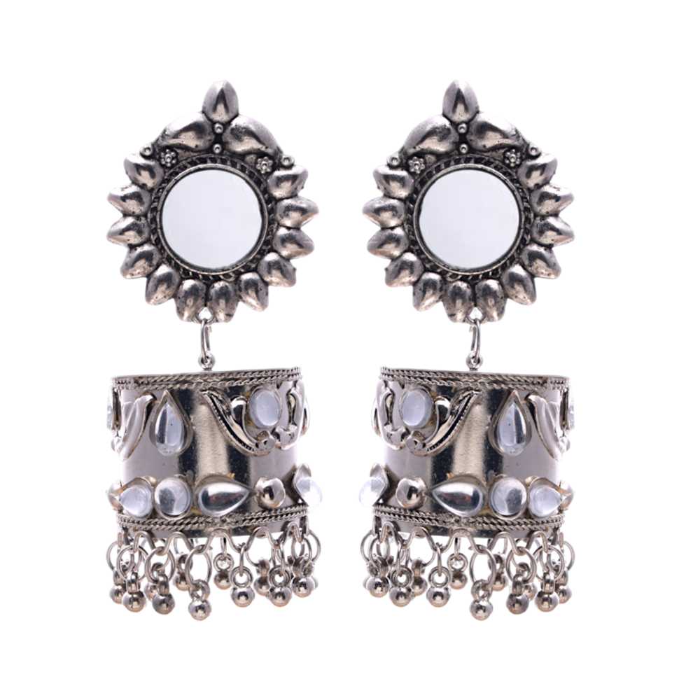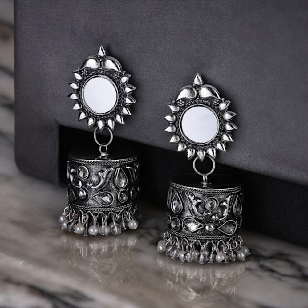 Women's Silver Plated Oxidised Pearl Tasseled Jhumka Earring