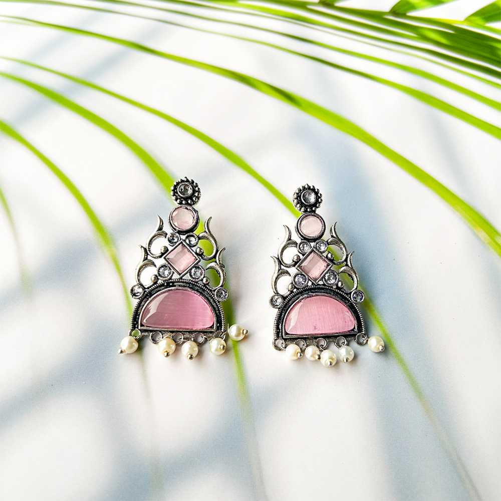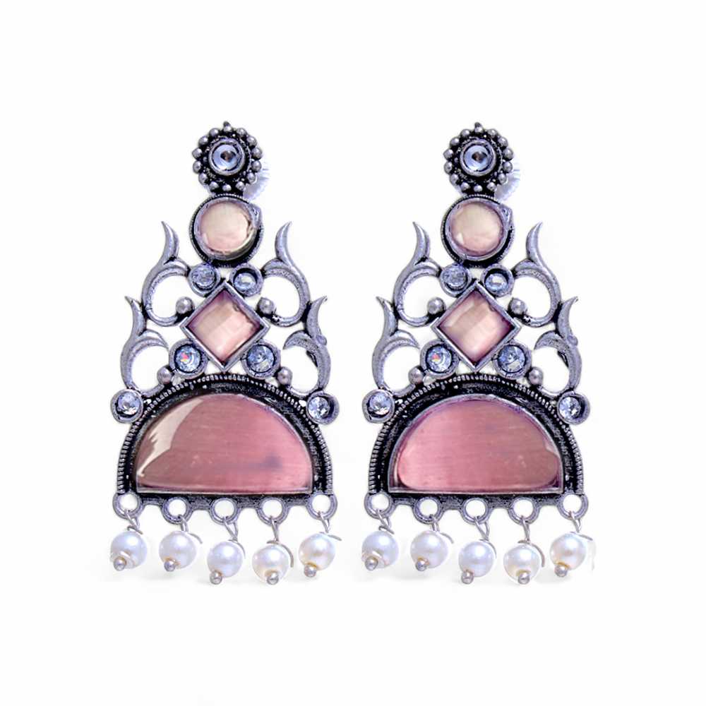 - Product Particulars: Crafted from high quality silver plated oxidised metal, the earring paved with adorable pink stone and dangled with lustrous pearls.