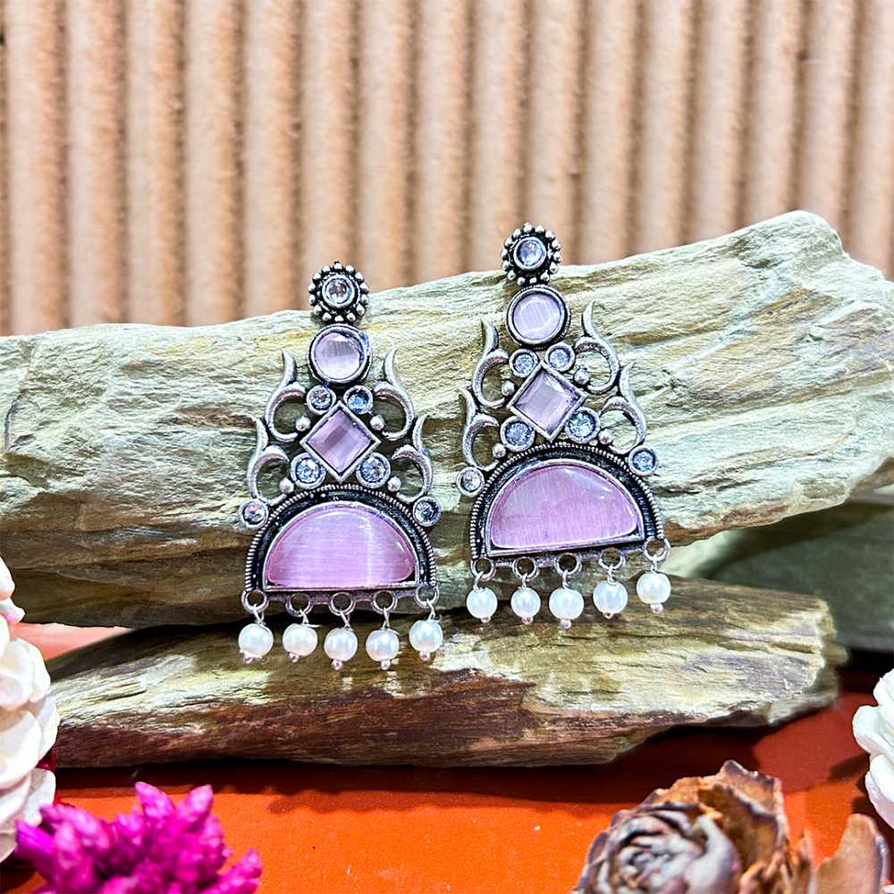Women's Silver Plated Oxidised Pink Monalisa Stone Embossed Pearl Drop Earring