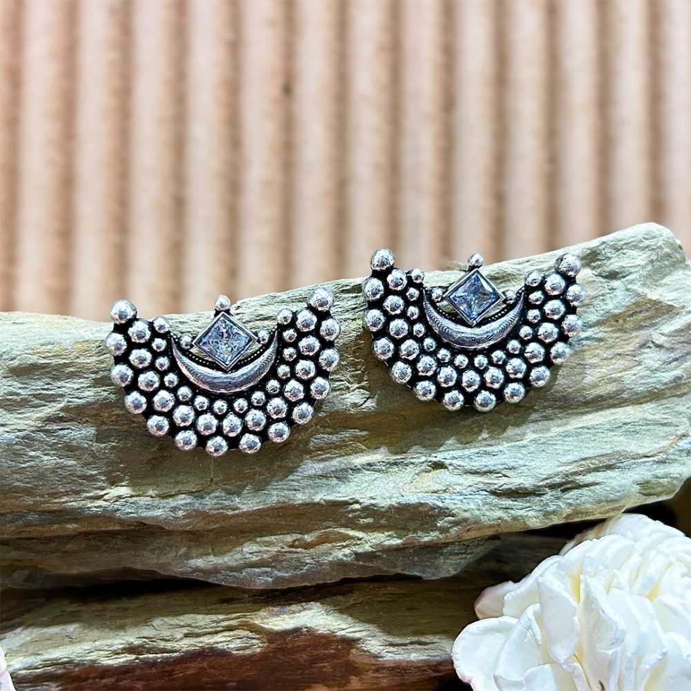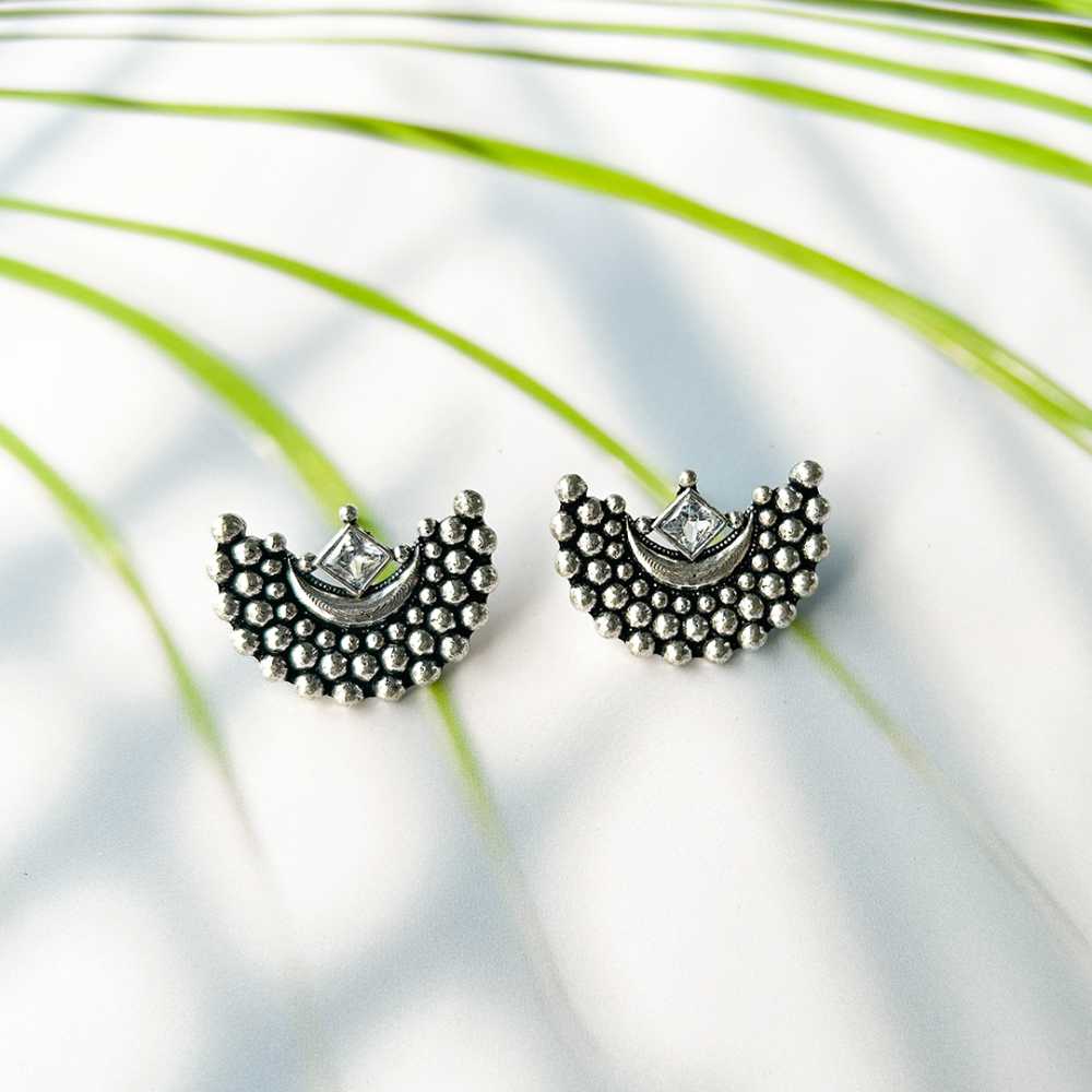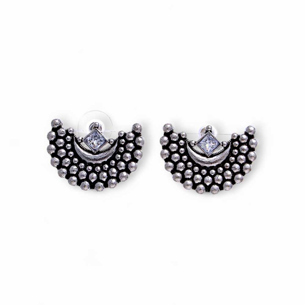 Women's Silver Plated Oxidised Semi Circle Zirconia Embossed Stud Earring