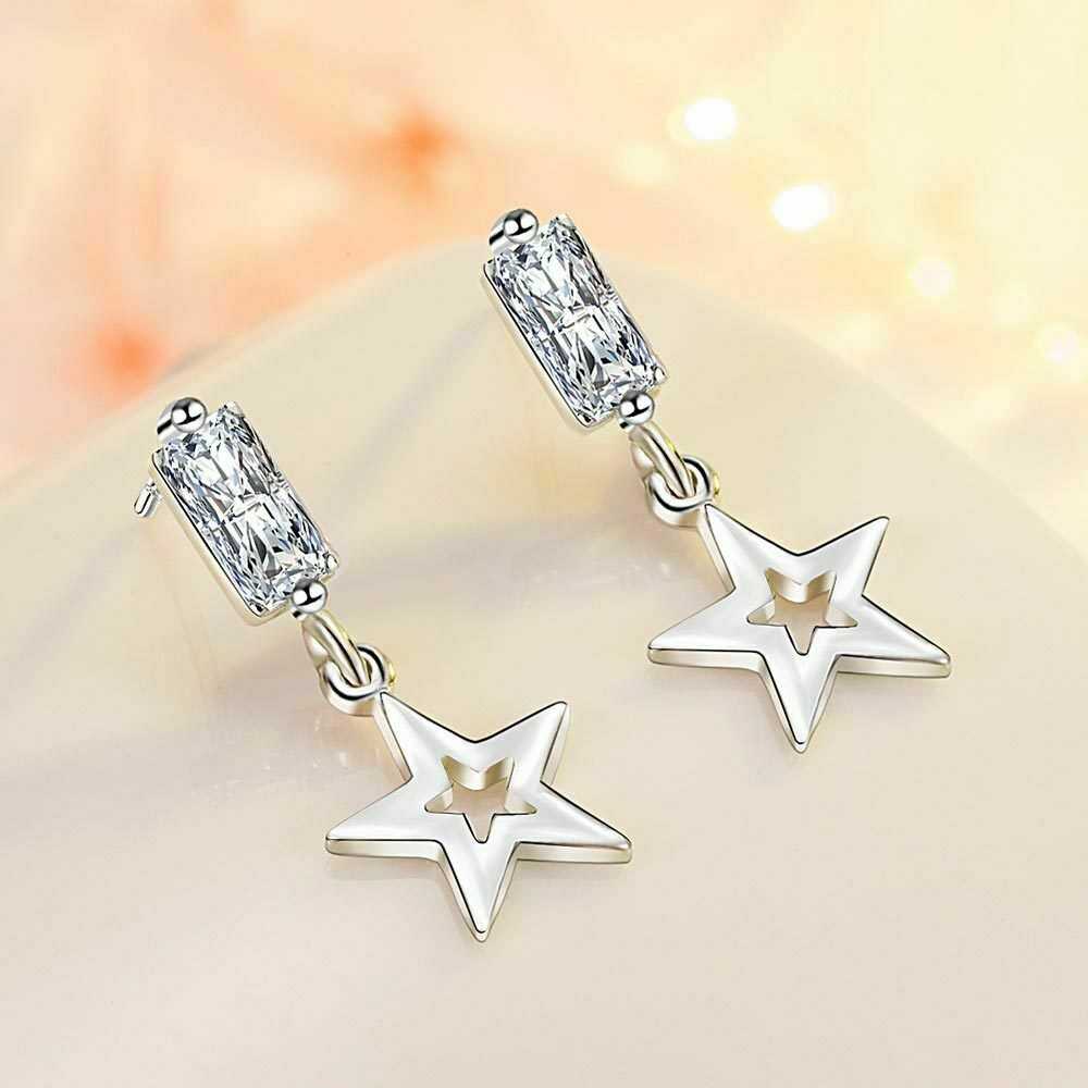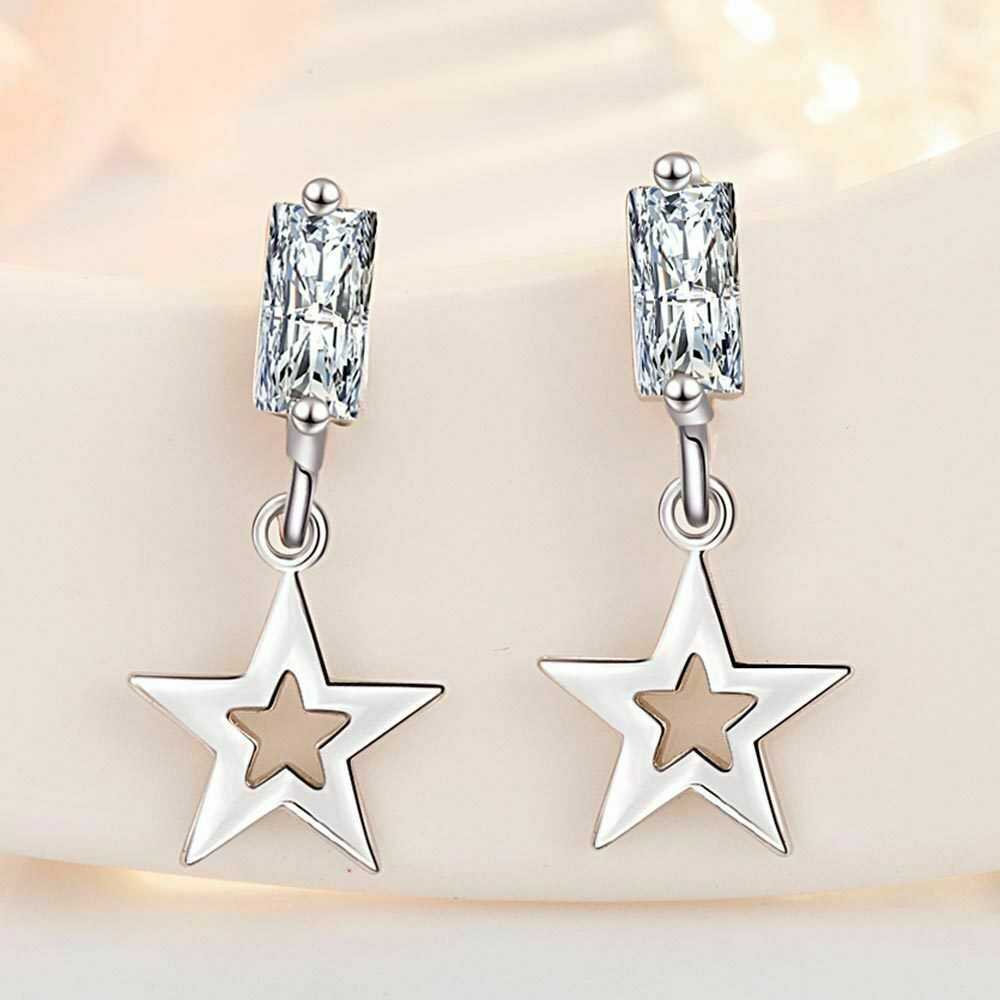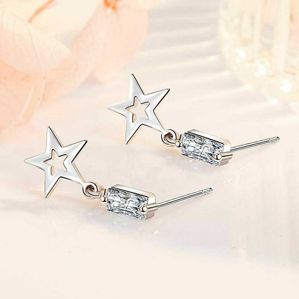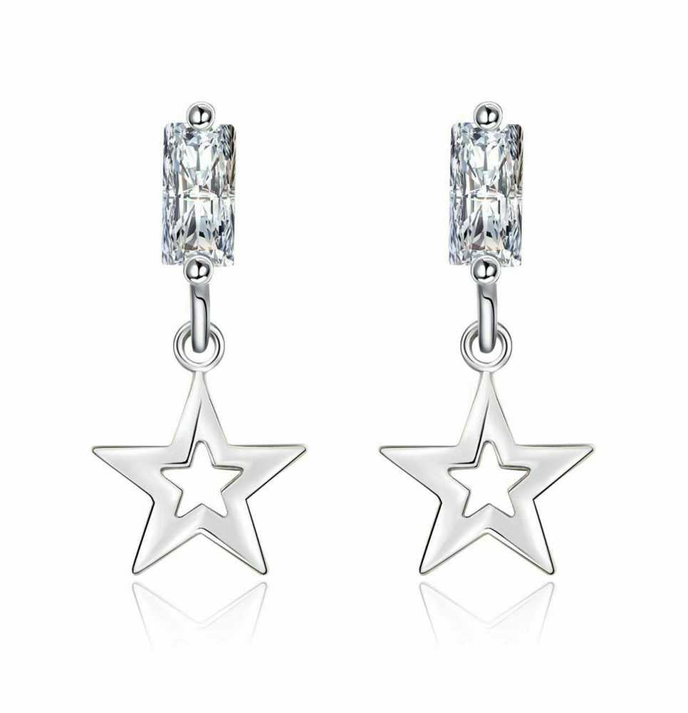 Twinkle and shimmer with these beautiful open star drop earrings. These earrings feature a rectangular cubic zirconia stud with a polished star drop dangle. Bring on the glimmer and slay any starry night party.