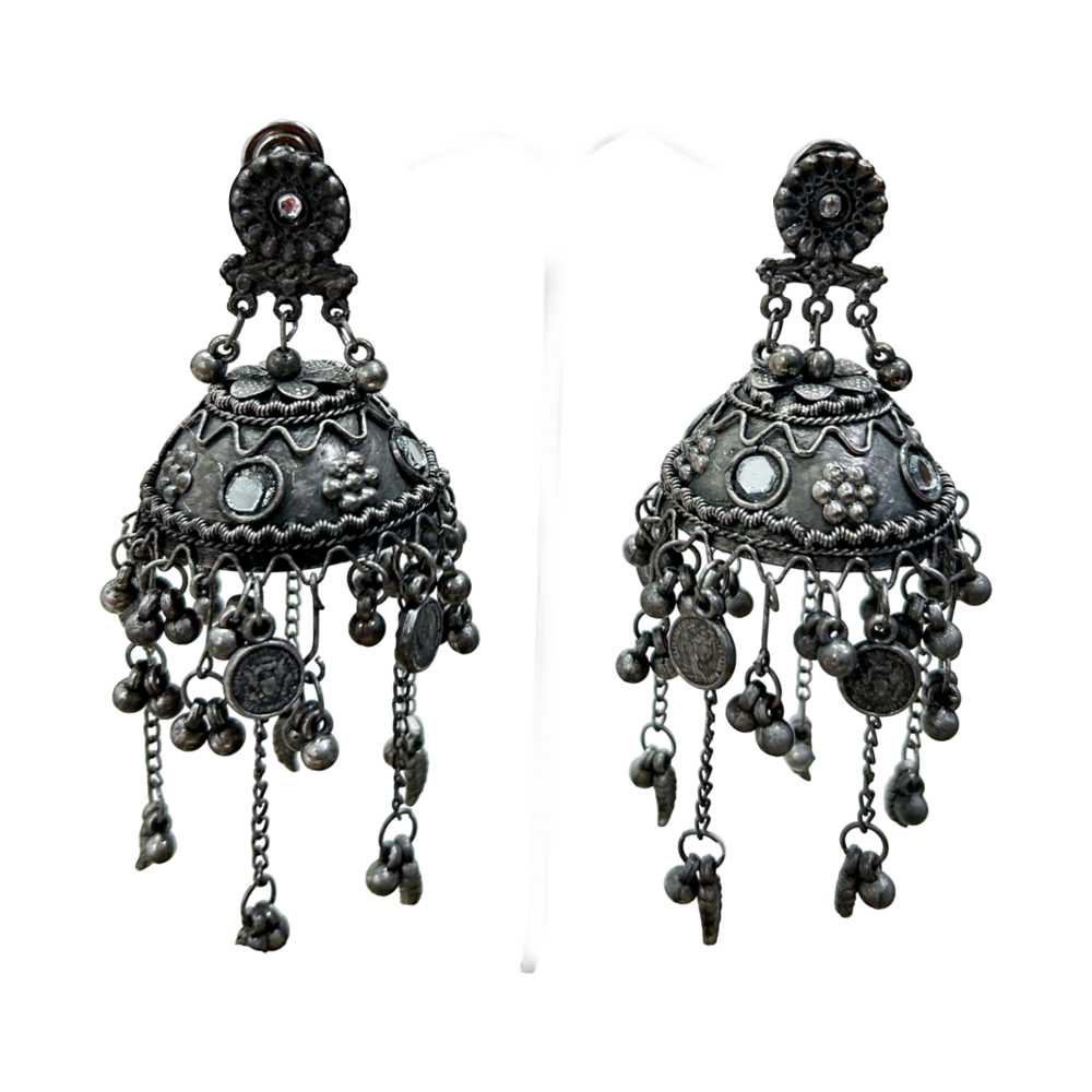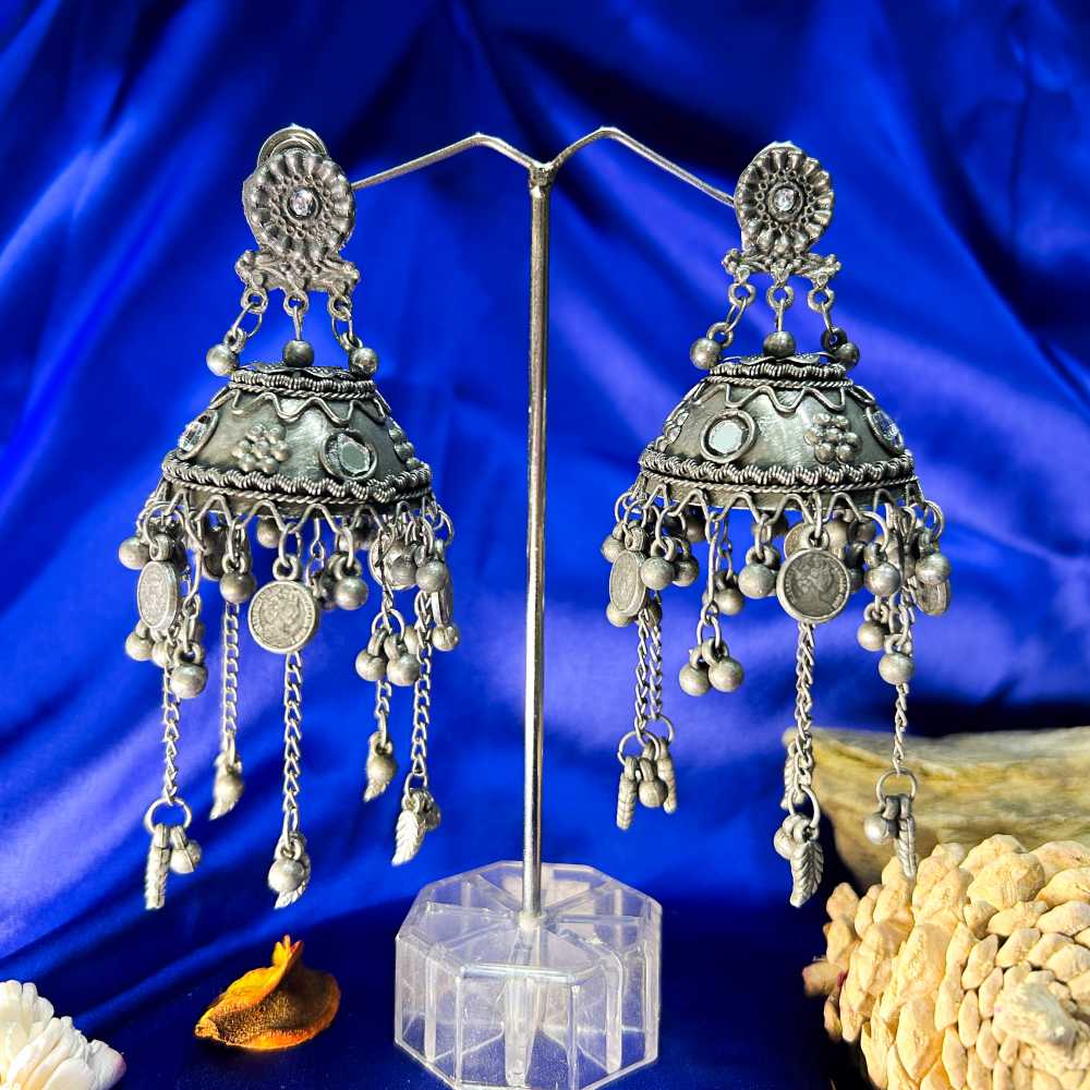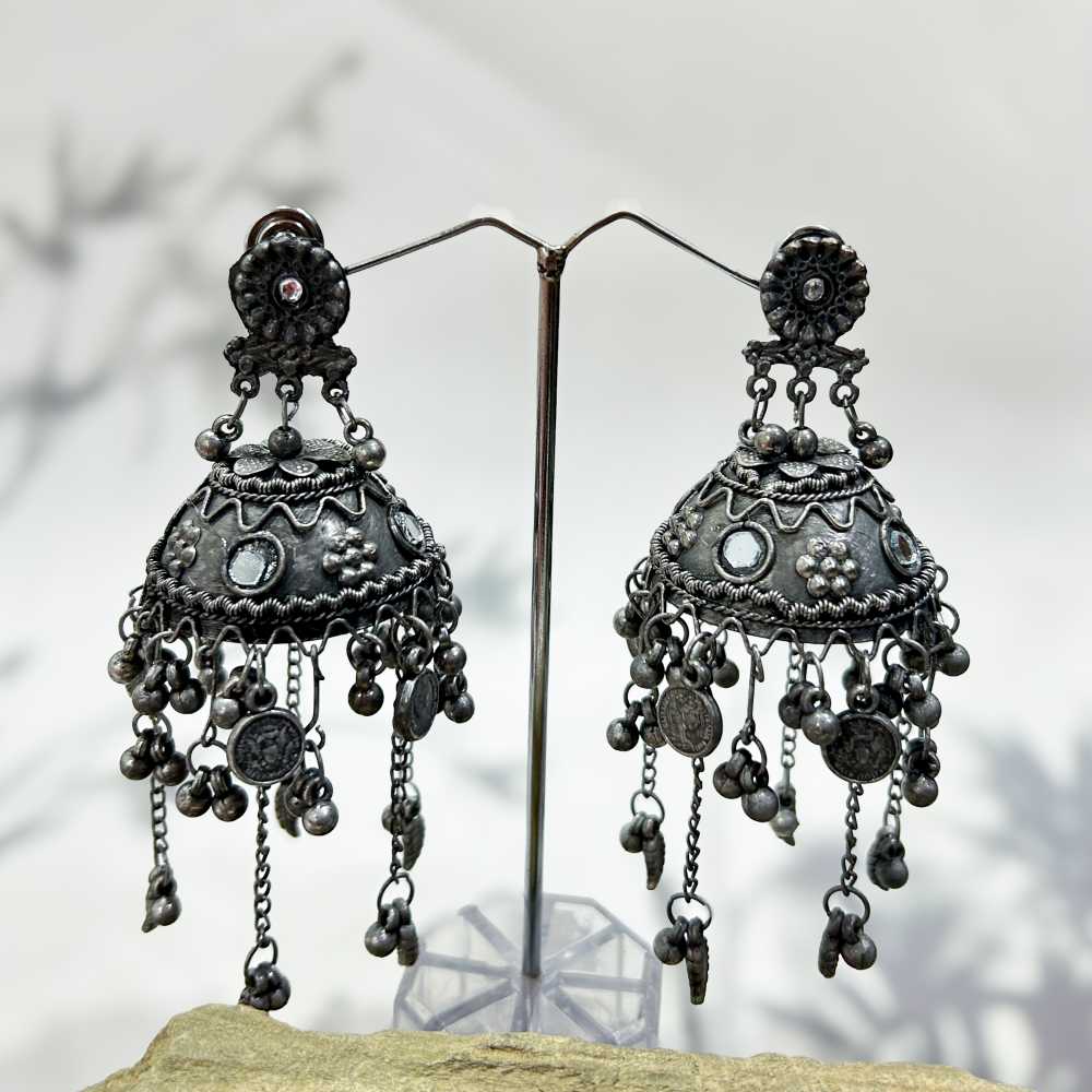 Women's Traditional Silver Oxidized Jhumka Earrings With Tassel Drops