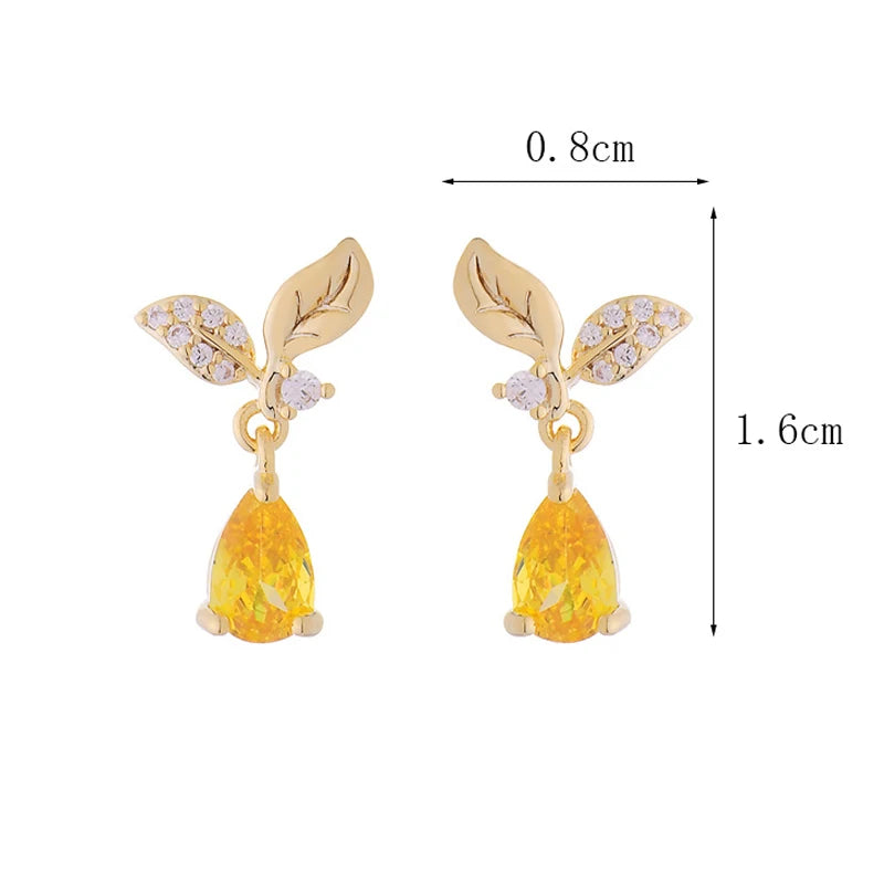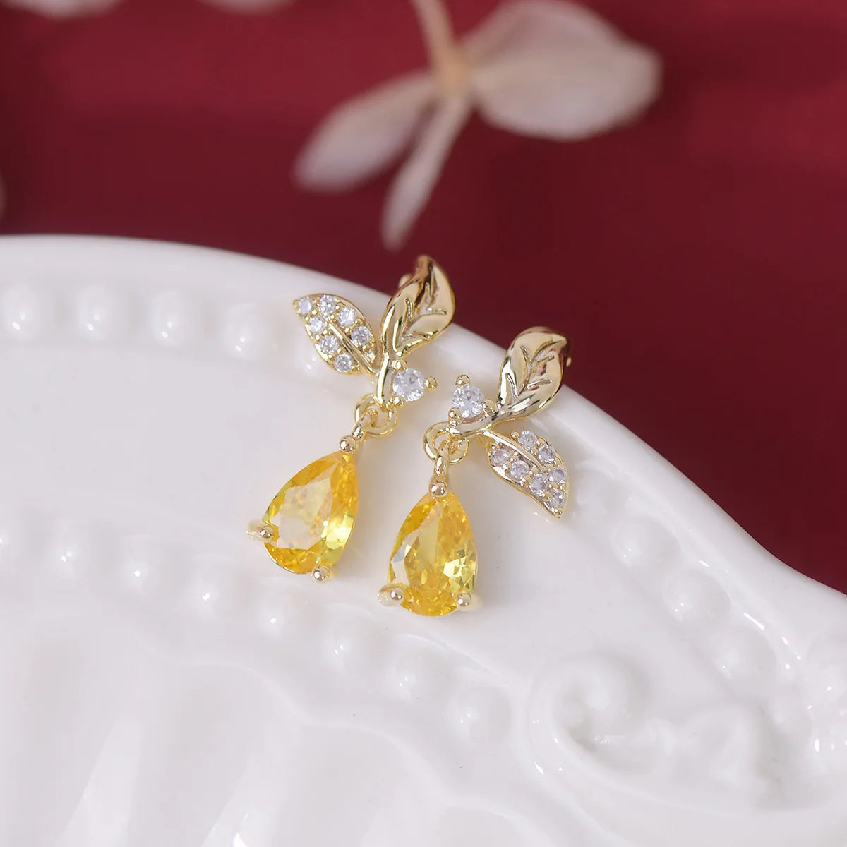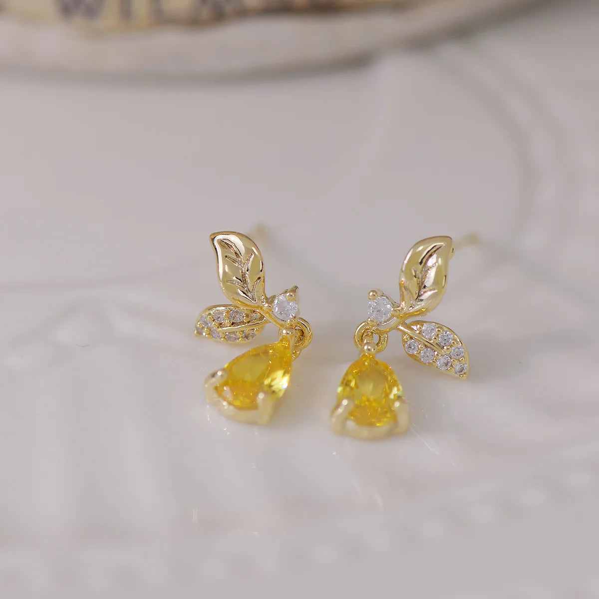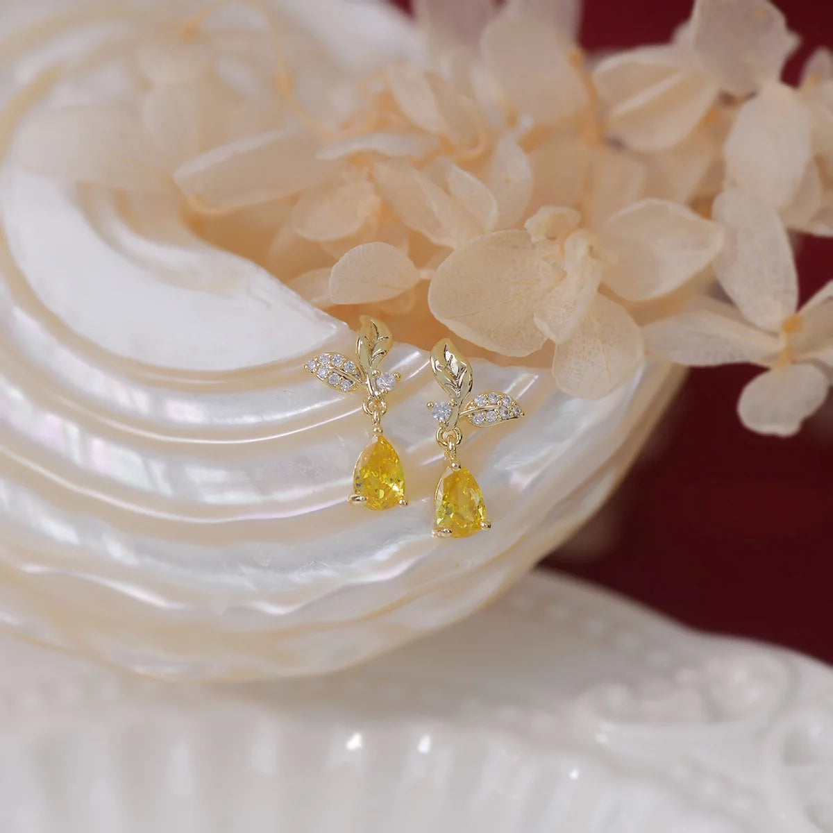Add a touch of elegance to your daily look with these charming yellow zircon earrings featuring a water droplet design and leaf accent.
