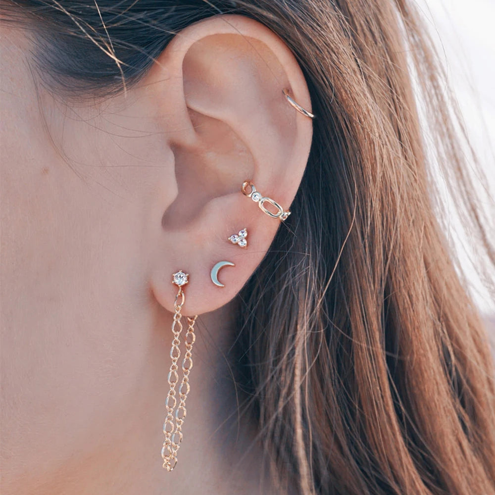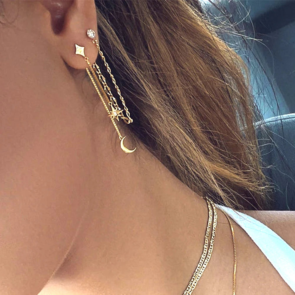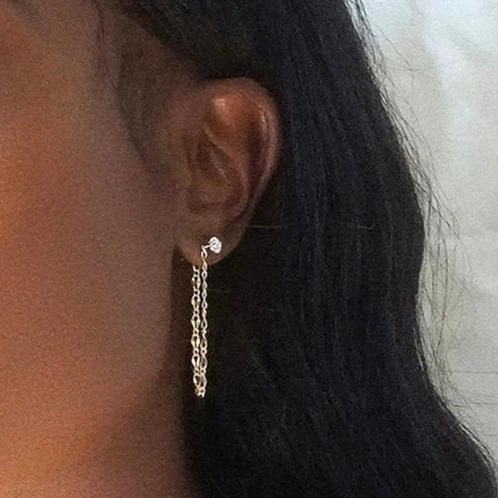 Elegant and stylish long chain piercing stud earrings with zircon details. Crafted from 925 sterling silver and plated with 18k gold. Perfect for women who appreciate unique jewelry pieces.
