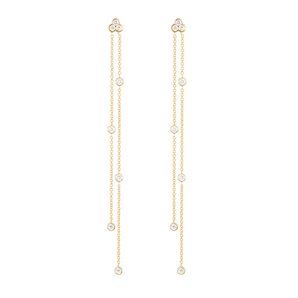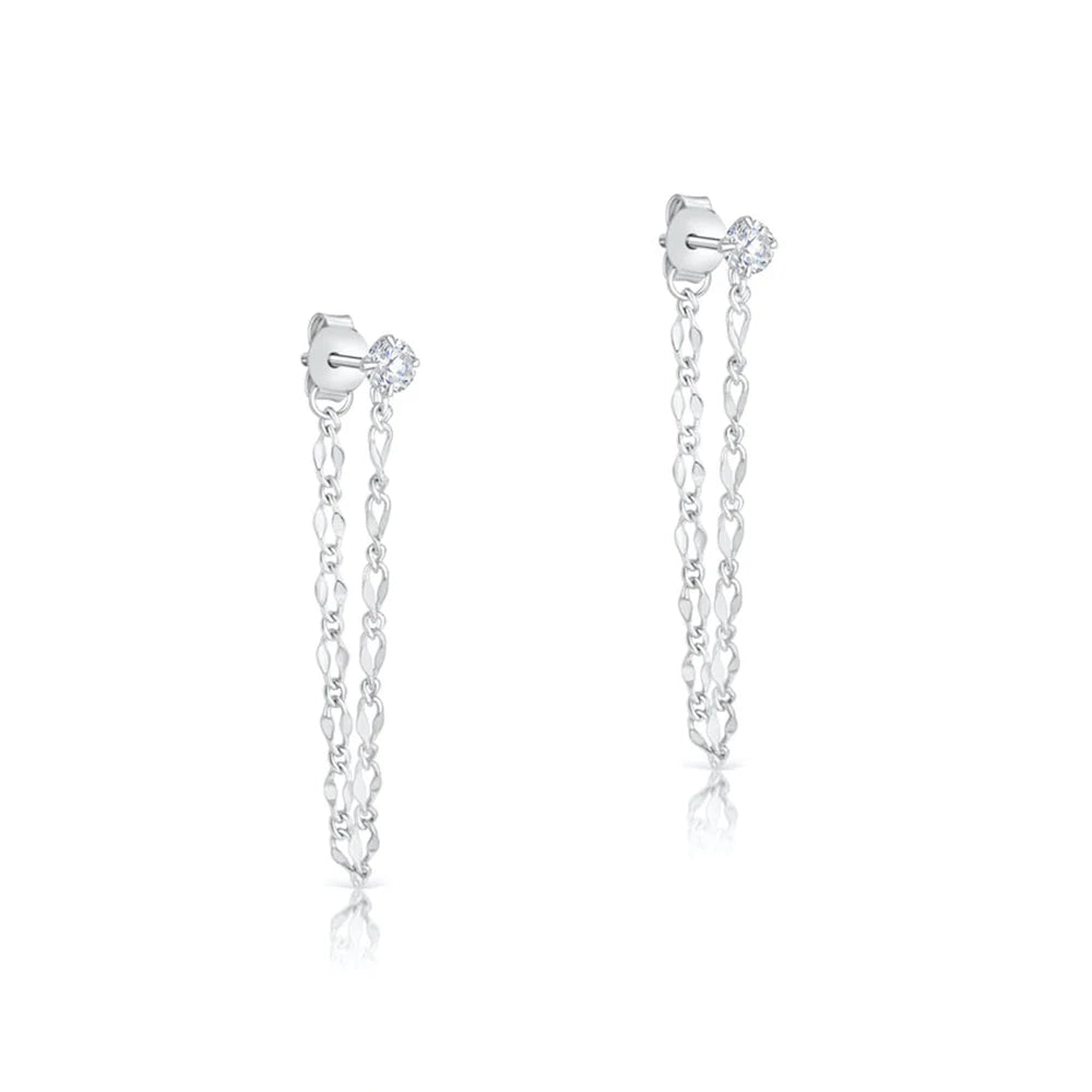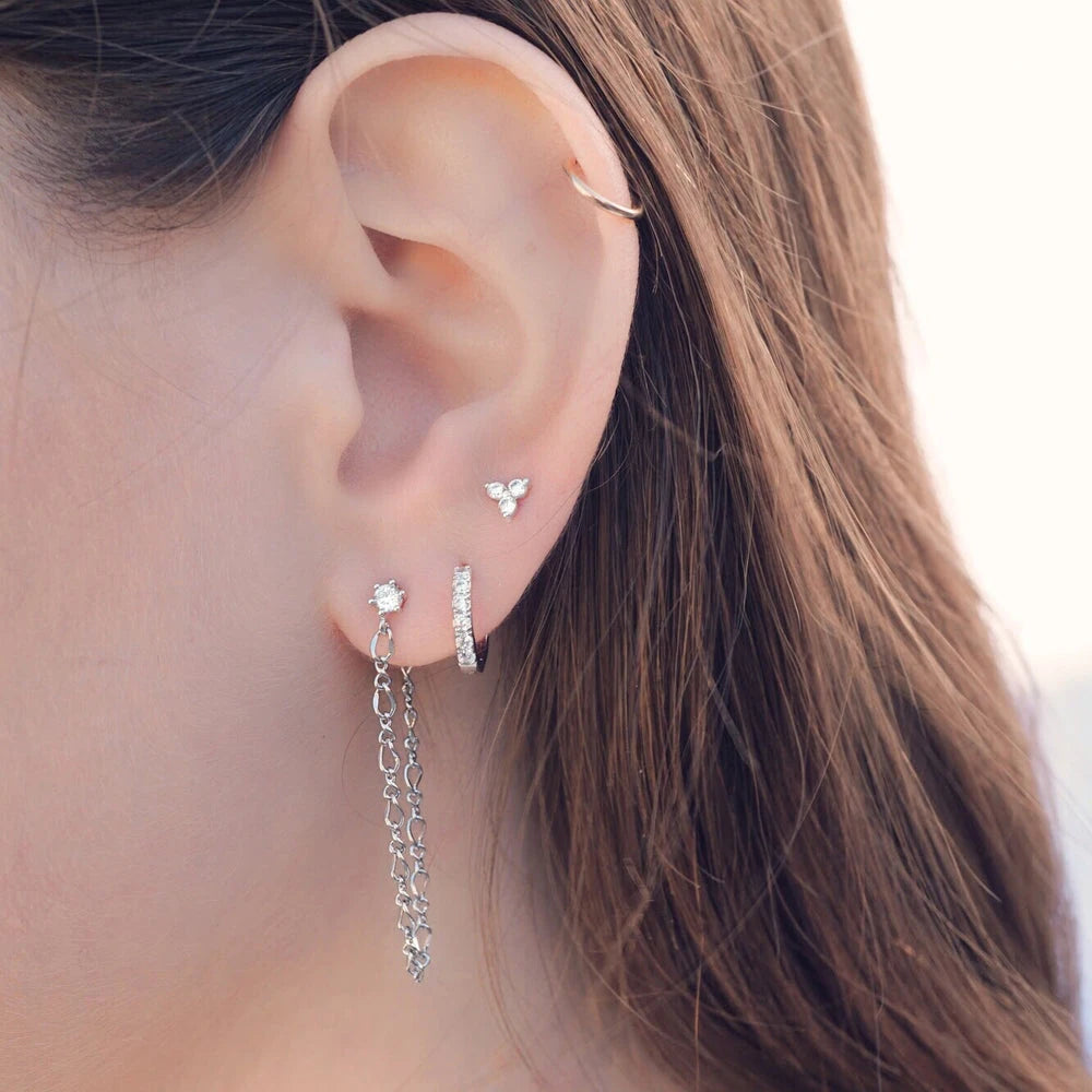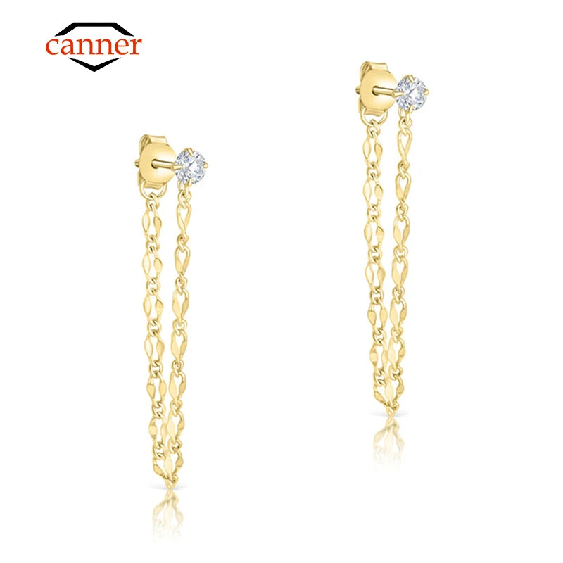 Elegant and stylish long chain piercing stud earrings with zircon details. Crafted from 925 sterling silver and plated with 18k gold. Perfect for women who appreciate unique jewelry pieces.