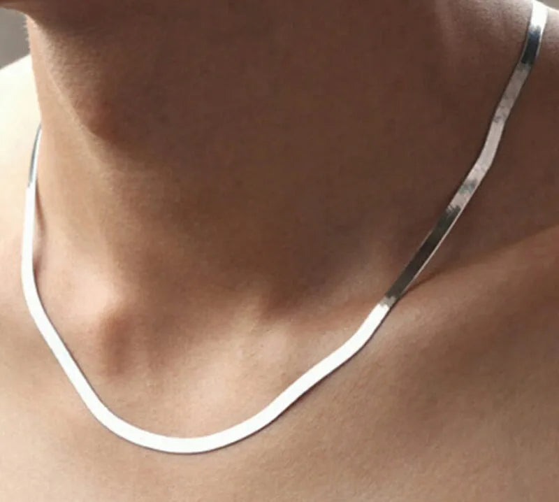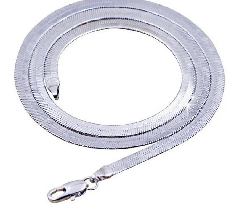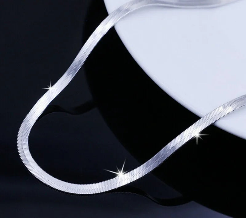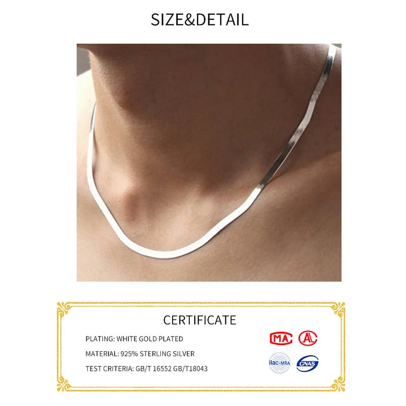 This 925 sterling silver necklace features a flat snake link chain with a lobster clasp closure, suitable for both men and women.