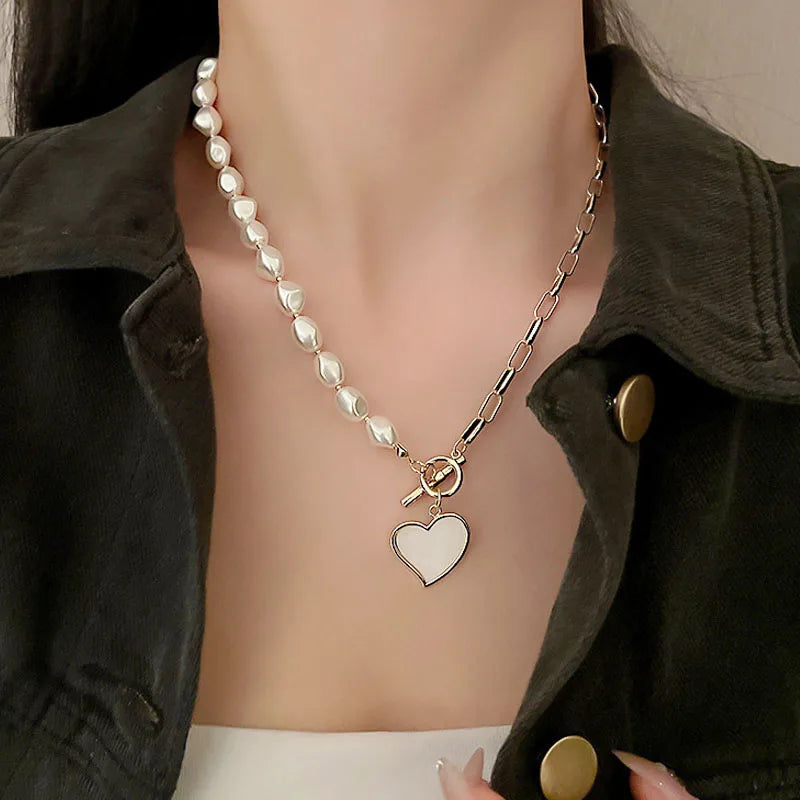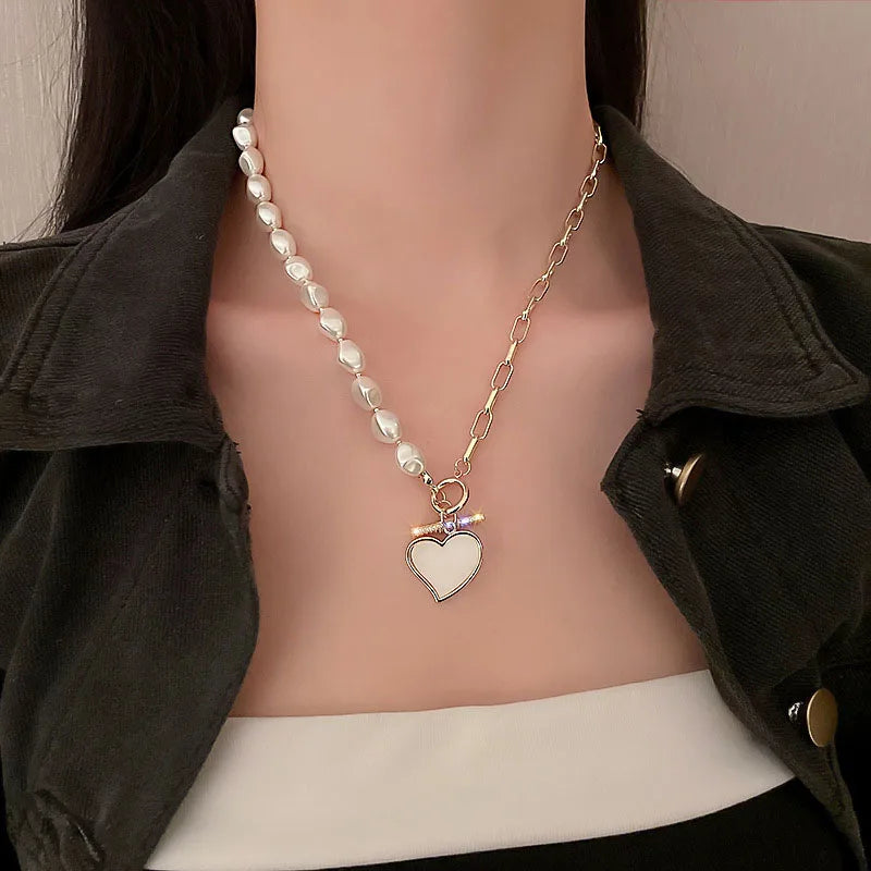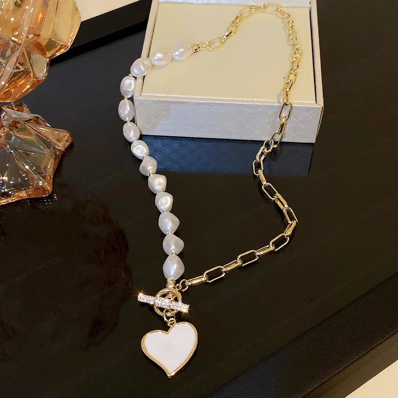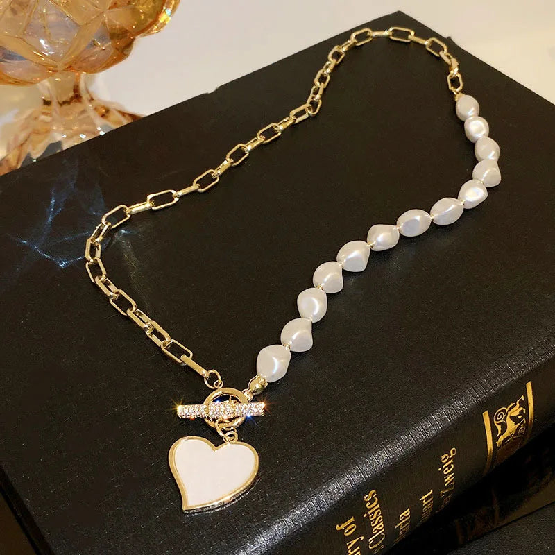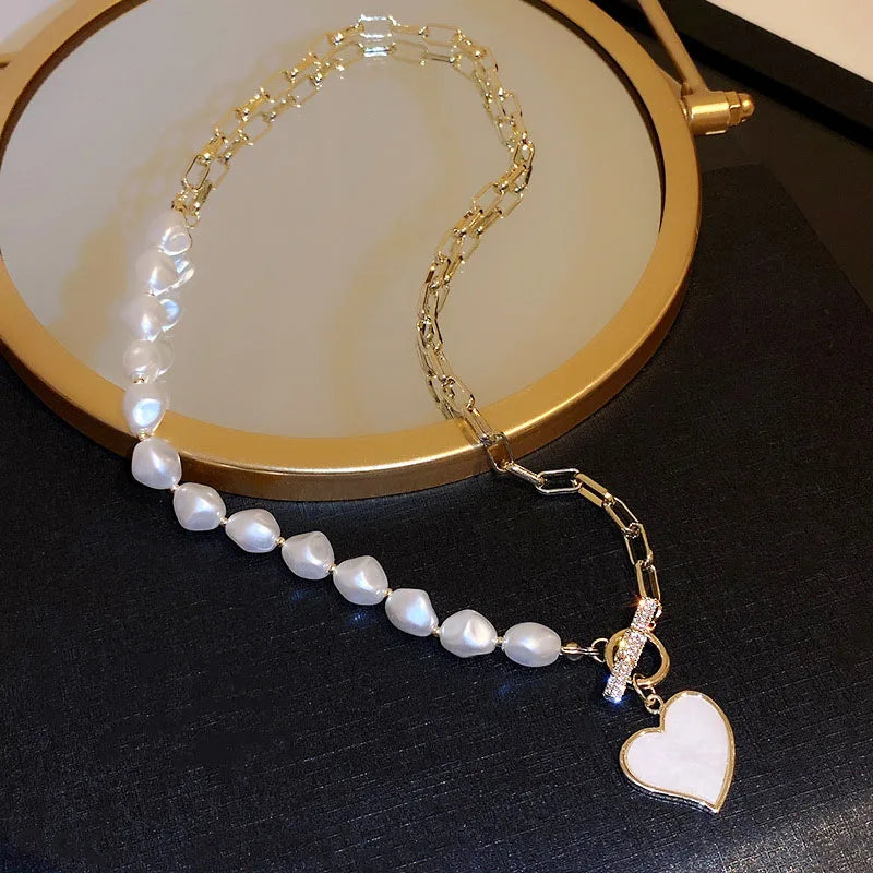 Elegant asymmetrical heart necklace with pearls and micro inlaid zirconia, perfect for weddings or as a gift for her.