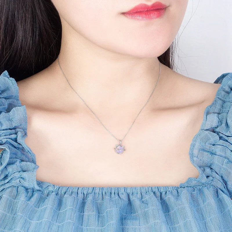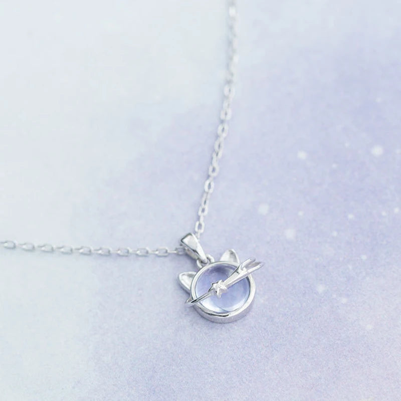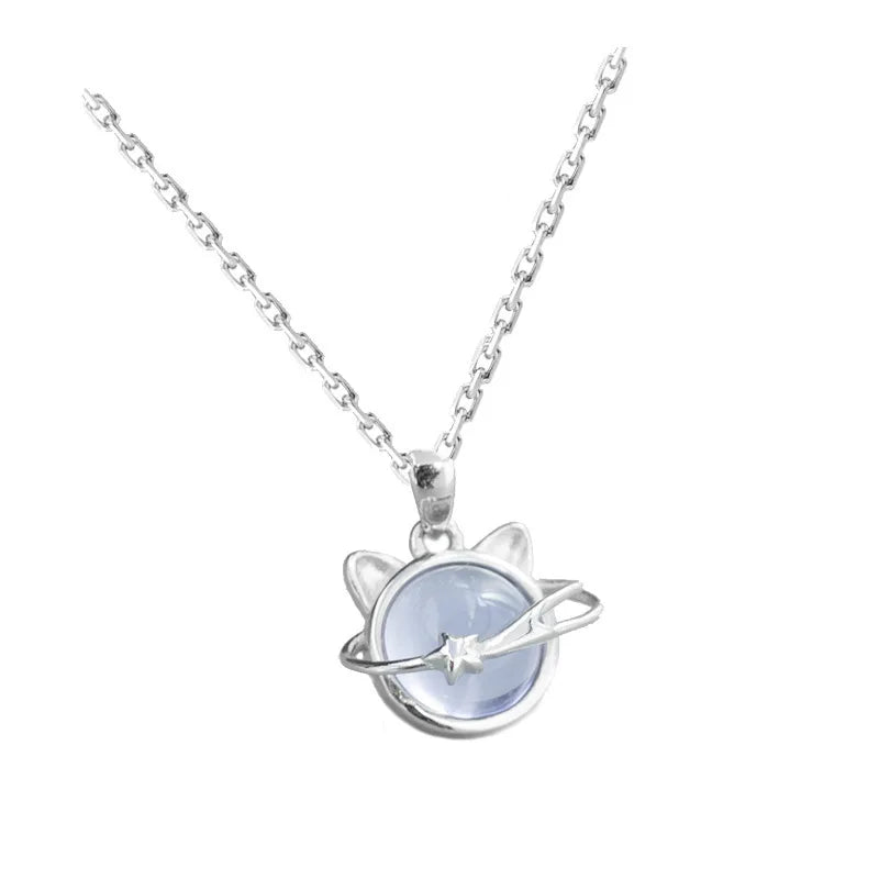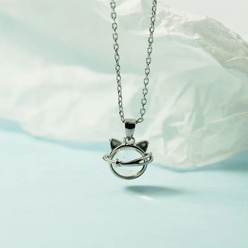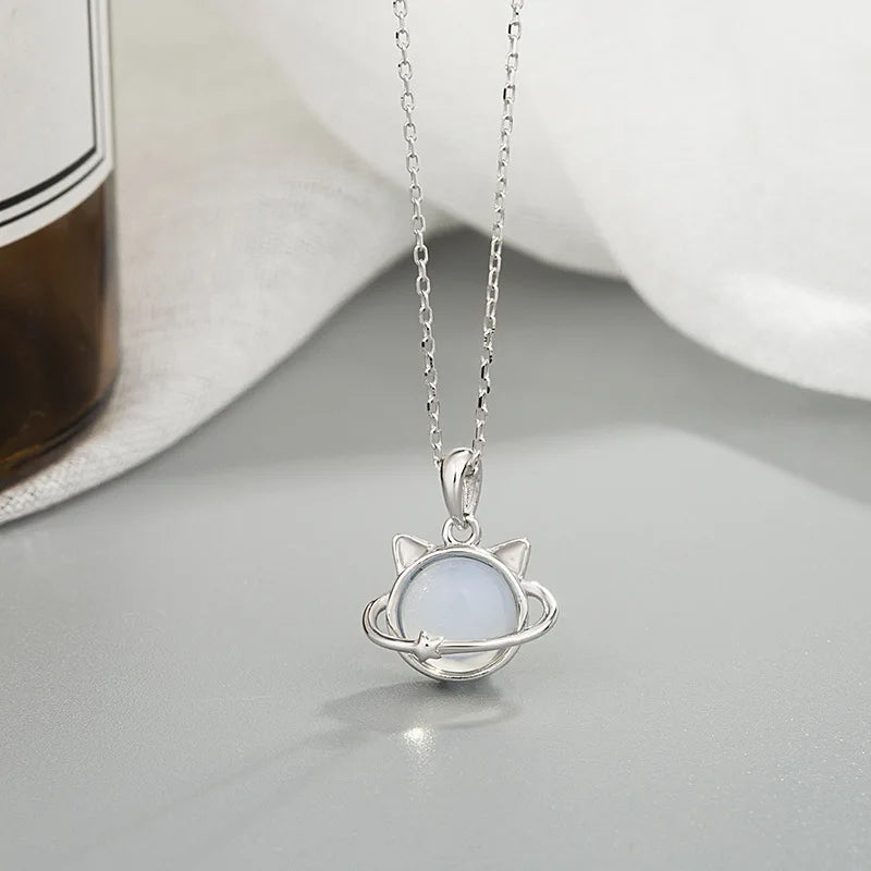 Adorn yourself with this stunning S925 silver platinum plated necklace featuring a moonstone planet pendant with cat ears. A fresh and elegant accessory.