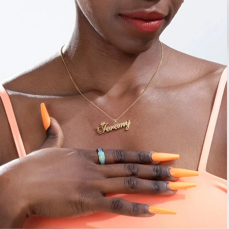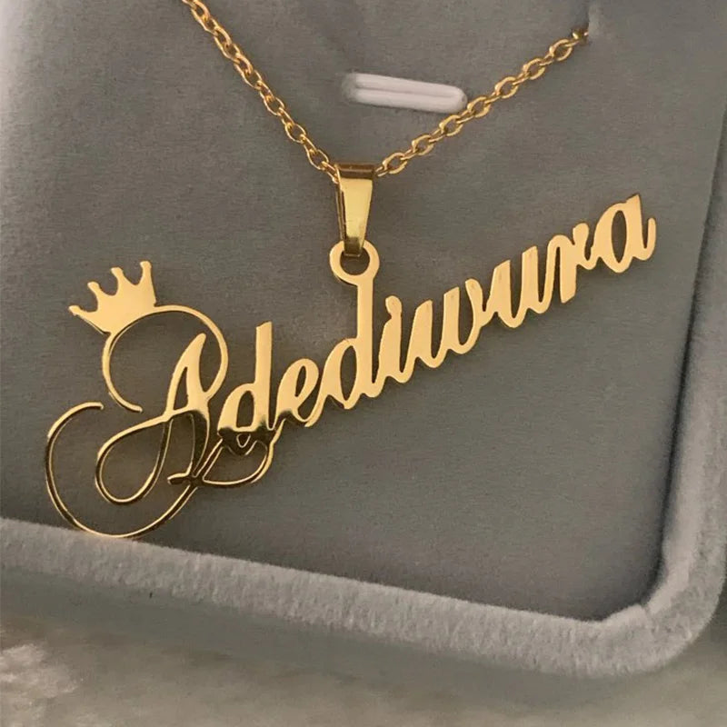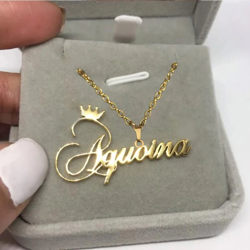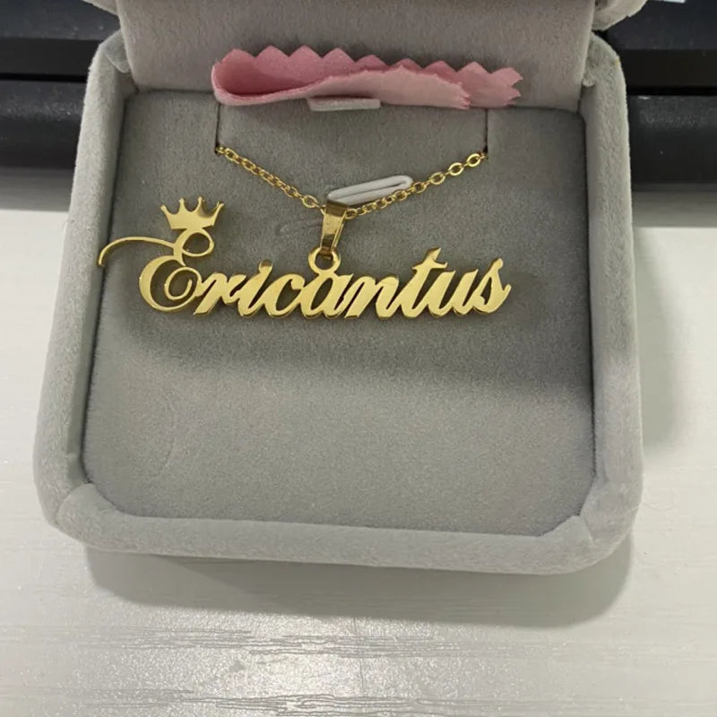 This stainless steel name necklace features a crown design for a personalized touch. Perfect gift for women.