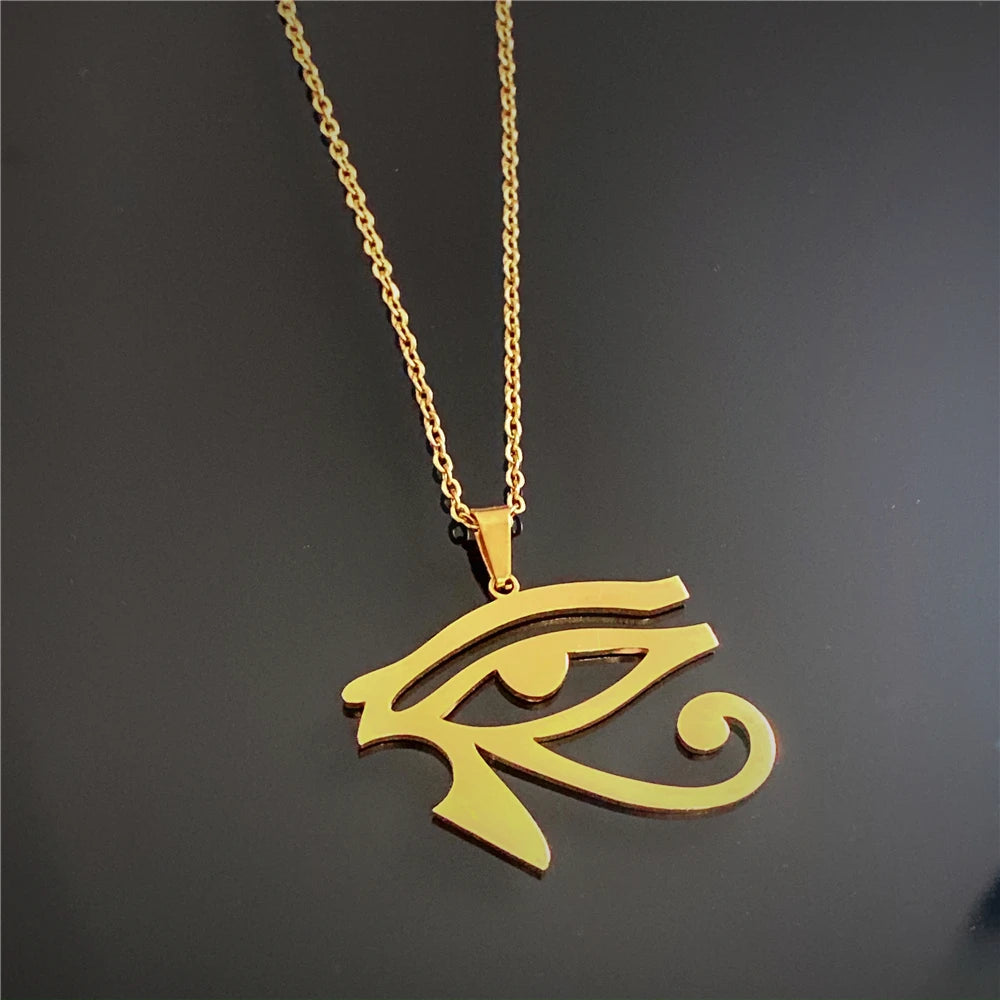 This necklace features an Eye of Horus charms pendant design made of stainless steel. It is a stylish and meaningful piece of jewelry for women.