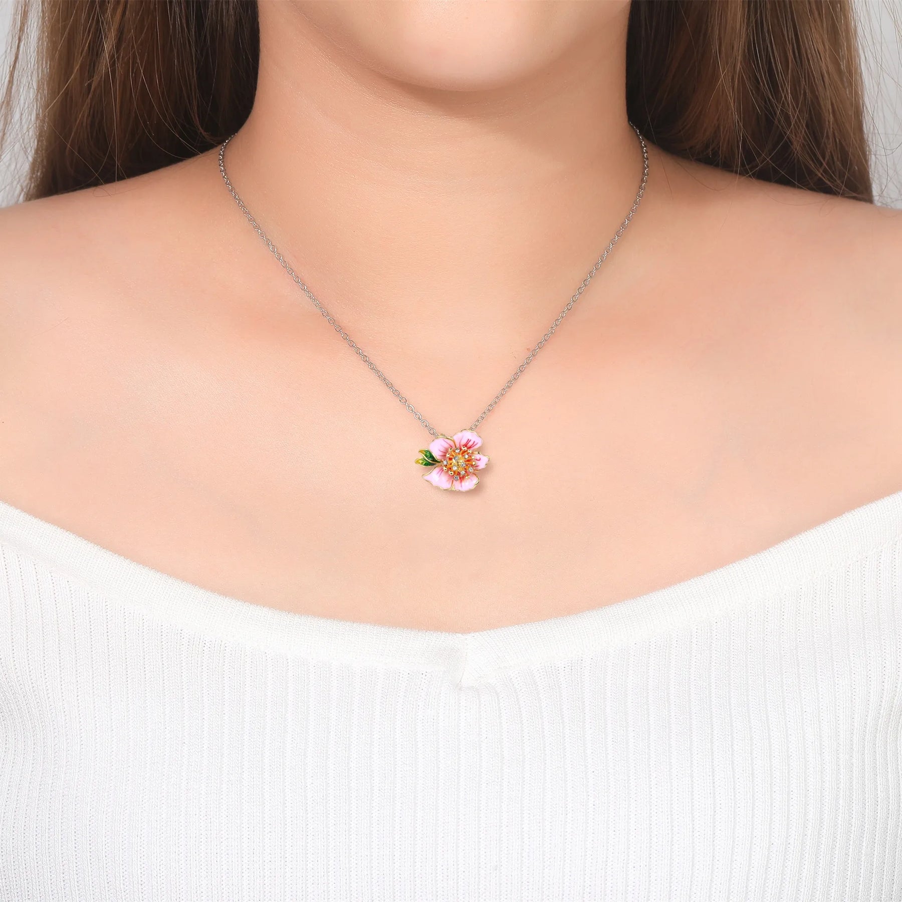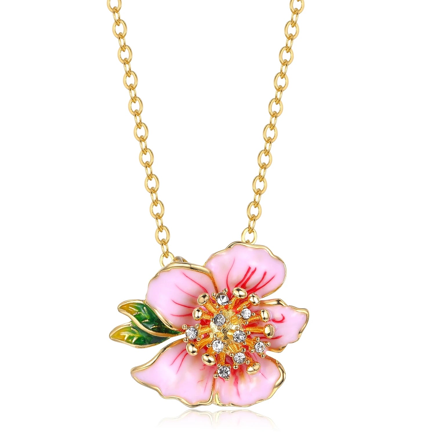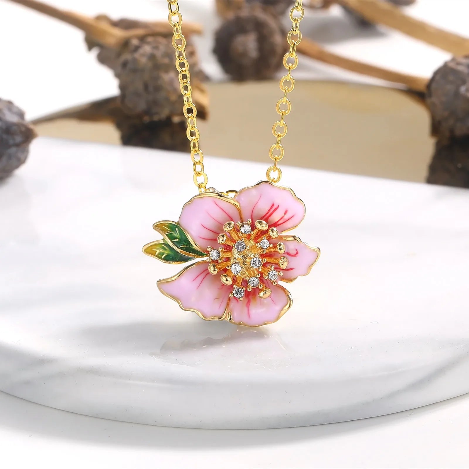Add a touch of charm to your outfit with this enchanting enamel peach blossom flower pendant necklace. It features intricate detailing and sparkling crystals, making it perfect for parties or as an anniversary gift.