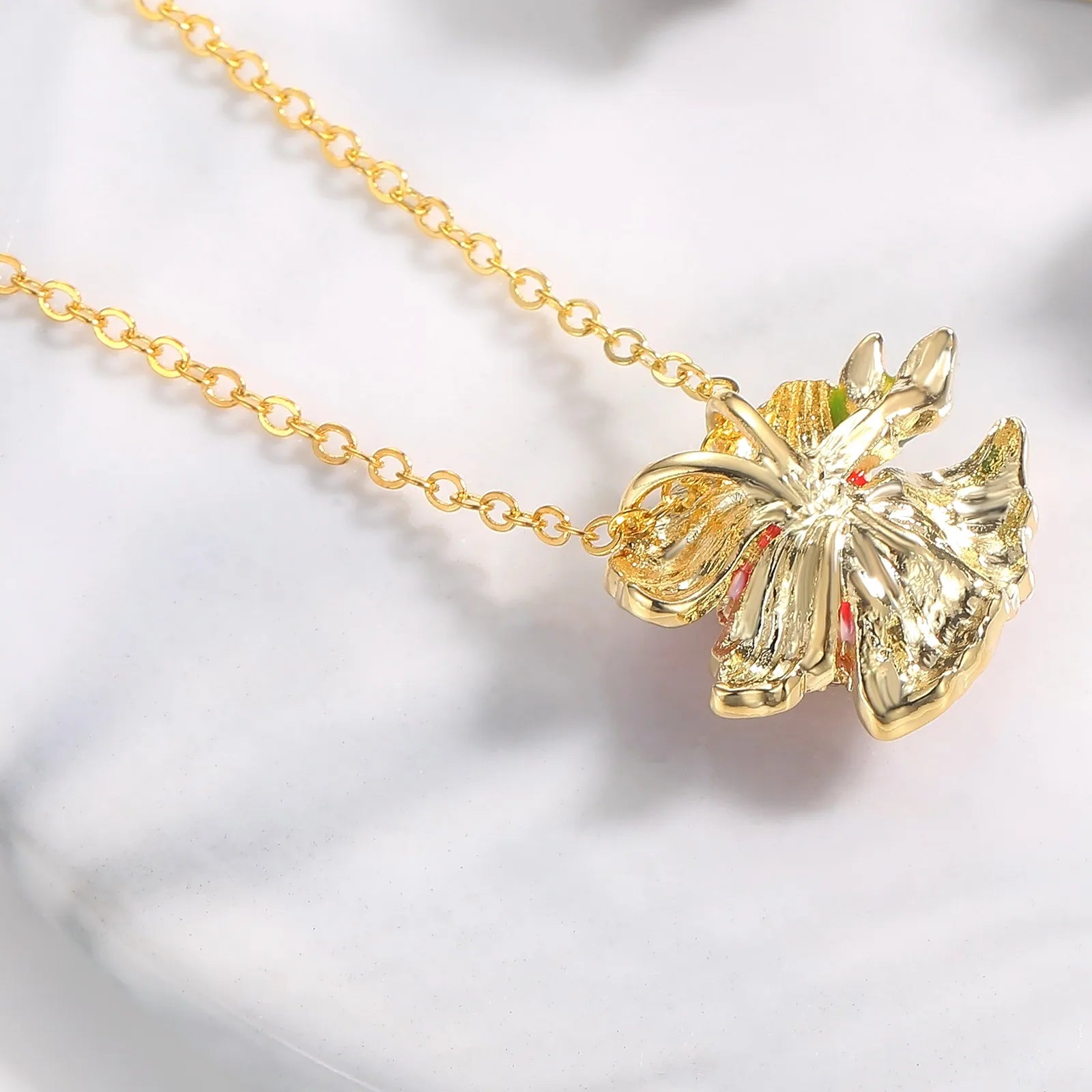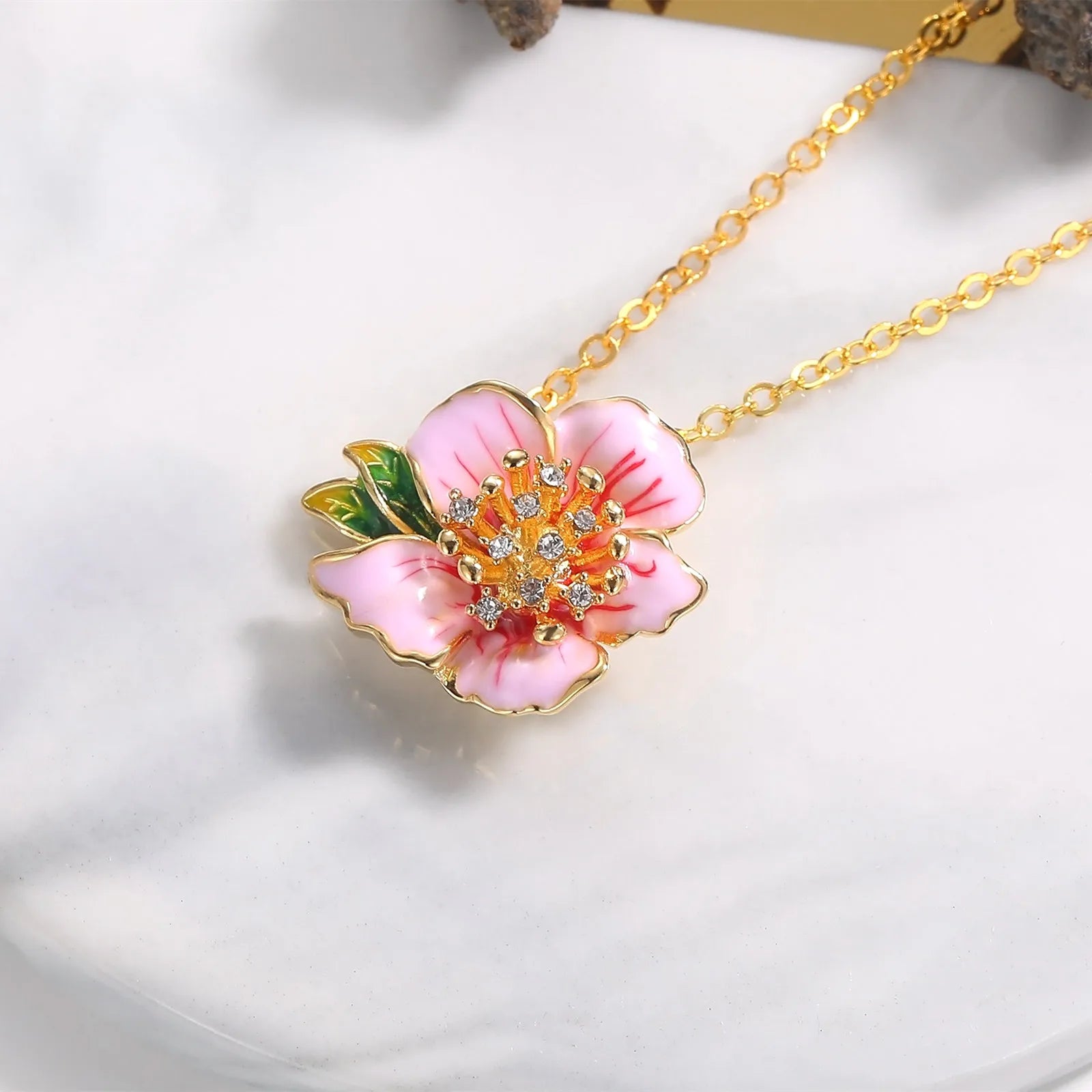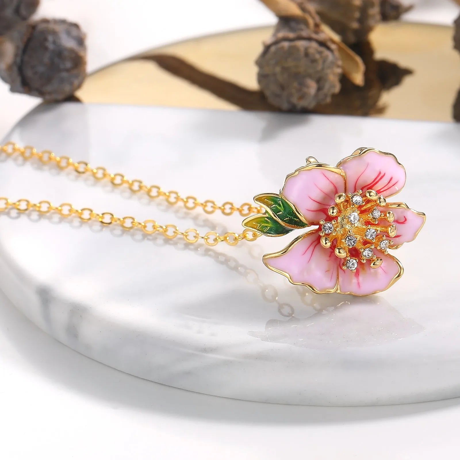 Add a touch of charm to your outfit with this enchanting enamel peach blossom flower pendant necklace. It features intricate detailing and sparkling crystals, making it perfect for parties or as an anniversary gift.
