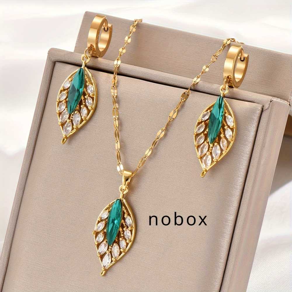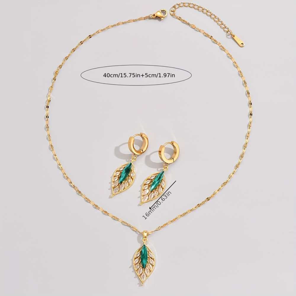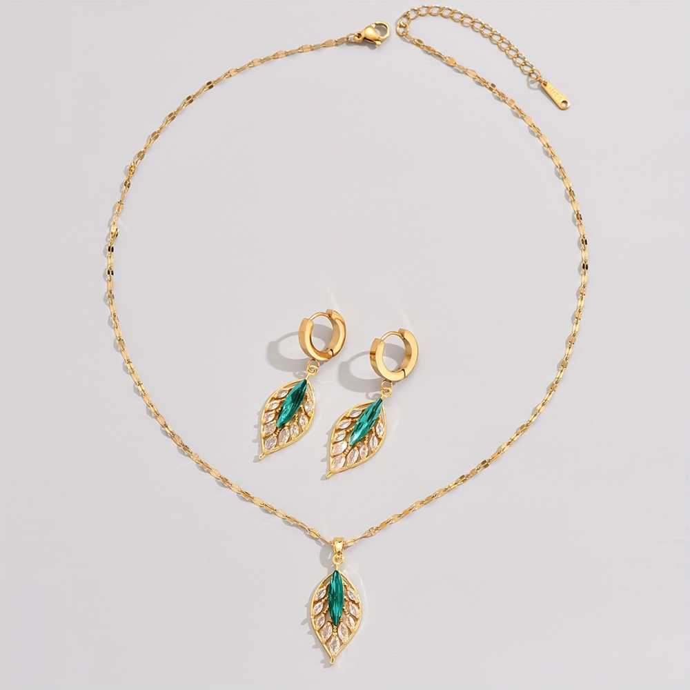 Gold Plated Green Inlaid Rhinestone Leaf Earrings and Necklace Set