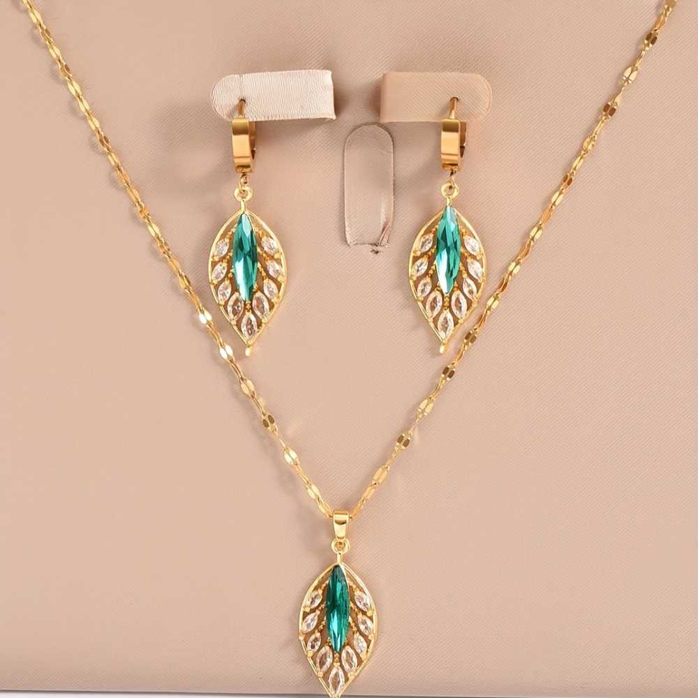 Bling Queen is an affordable fashion jewellery brand with various product types like bracelets, necklaces, earrings, rings, etc. suitable for women, men and kids. Celebrate timeless elegance with this gold plated earrings and necklace set, featuring a stunning leaf design inlaid with green rhinestones. The delicate leaf motif adds a natural, sophisticated touch, while the sparkling rhinestones offer a radiant glow, perfect for adding charm to any outfit. Ideal for gifting, especially for grandmothers, this set combines luxury and sentiment. Whether for a special occasion or everyday wear, the high quality gold plating ensures lasting beauty and shine. A beautiful accessory that effortlessly elevates your look with grace and elegance.