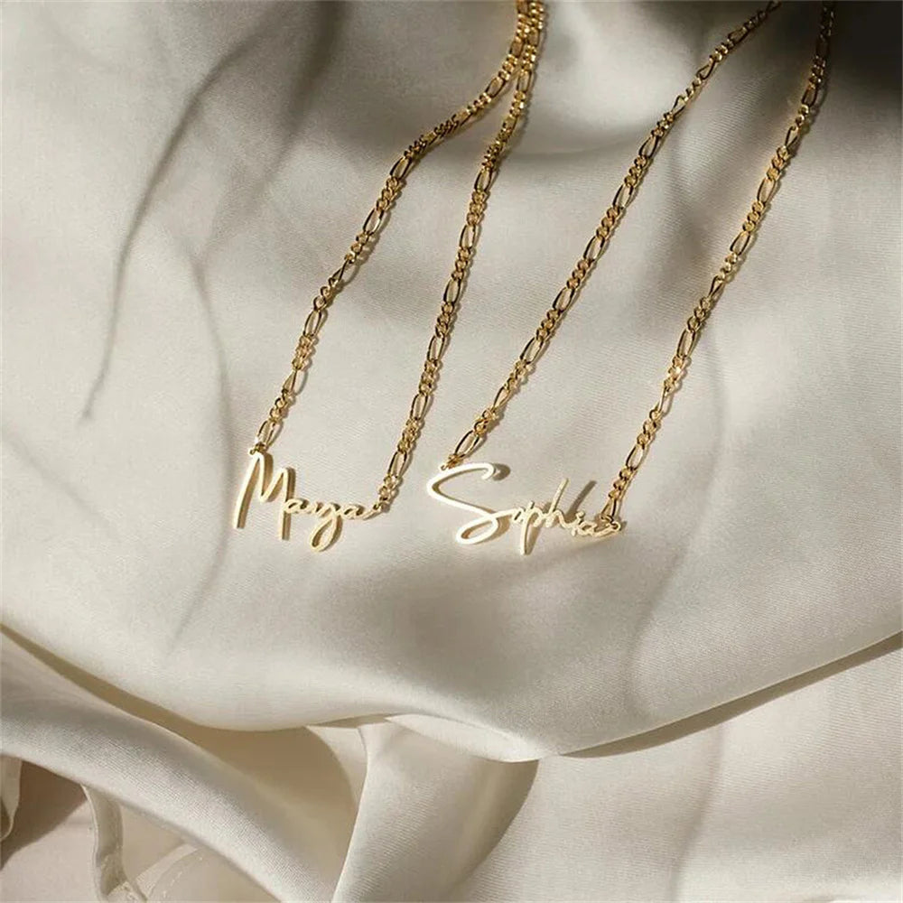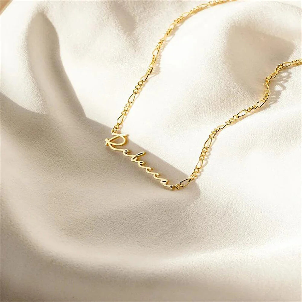 Elegant high name necklace designed for women, made of stainless steel with personalized nameplate. Perfect for adding a touch of style and individuality to any outfit.