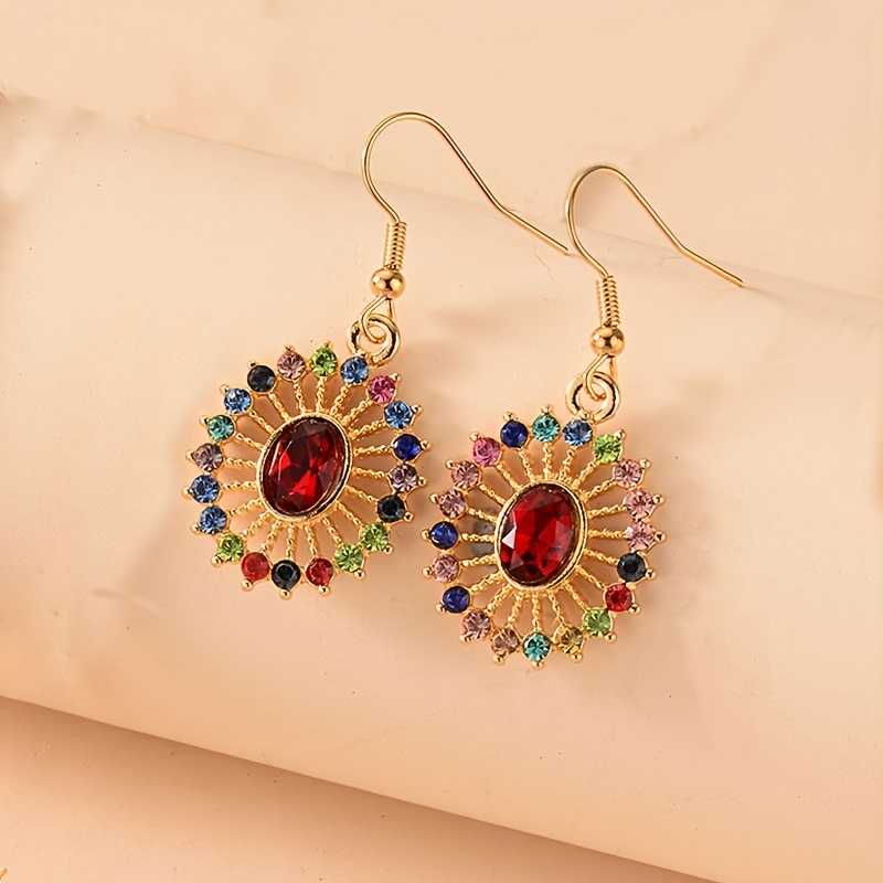 Bling Queen is an affordable fashion jewellery brand with various product types like bracelets, necklaces, earrings, rings, etc. suitable for women, men and kids. This vibrant and festive jewelry set is designed to capture the spirit of the season with its radiant sun ray shape and colorful gemstones. Perfect for adding a burst of color and energy to any outfit, the set includes a pendant necklace and hook dangle earrings, both meticulously crafted with inlaid synthetic gems that sparkle and shine. The pendant features a striking sun ray design, with elongated rays extending outward, symbolizing warmth, positivity, and light. The center of the sun is adorned with a colorful synthetic gemstone that catches the eye, radiating hues of blue, red, green, and yellow each gem carefully selected to complement the others in a harmonious and lively display. The rays are subtly textured to add depth and dimension, enhancing the dynamic movement of the design.