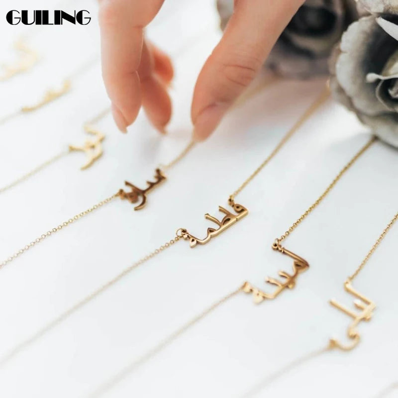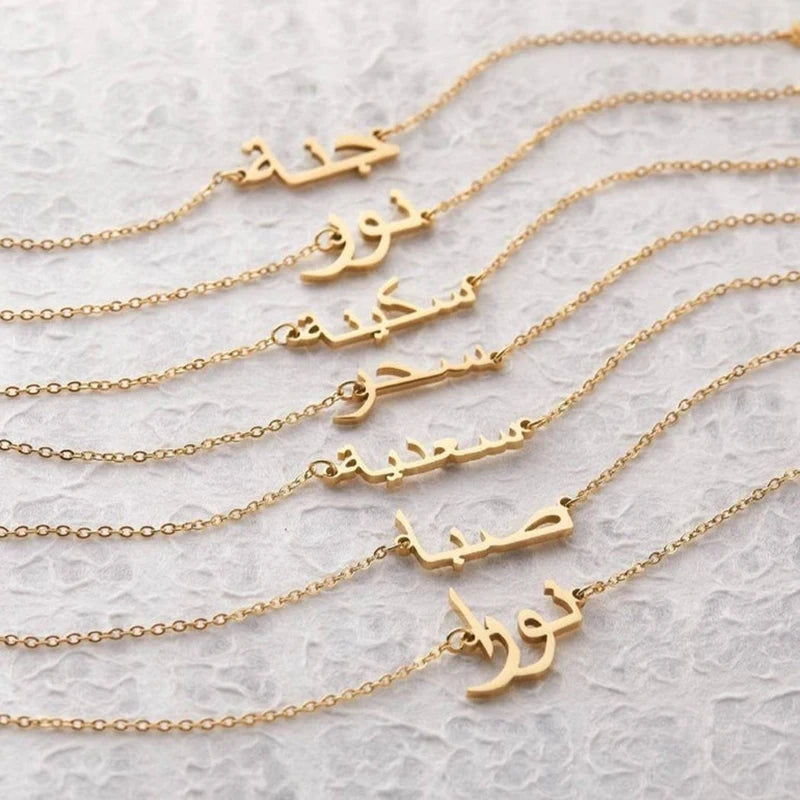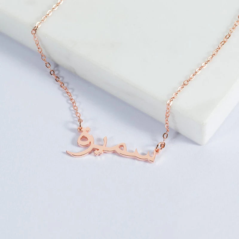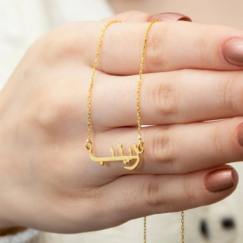 This dainty name necklace features a personalized Arabic nameplate pendant charm, perfect for women. Made of high-quality stainless steel, it makes a thoughtful and unique gift.