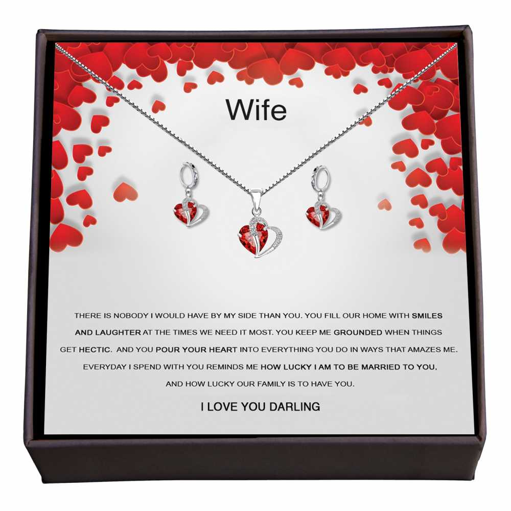 Women's Cubic Zirconia Heart Pendant Necklace And Earring Set with Personalized Wife Message Card